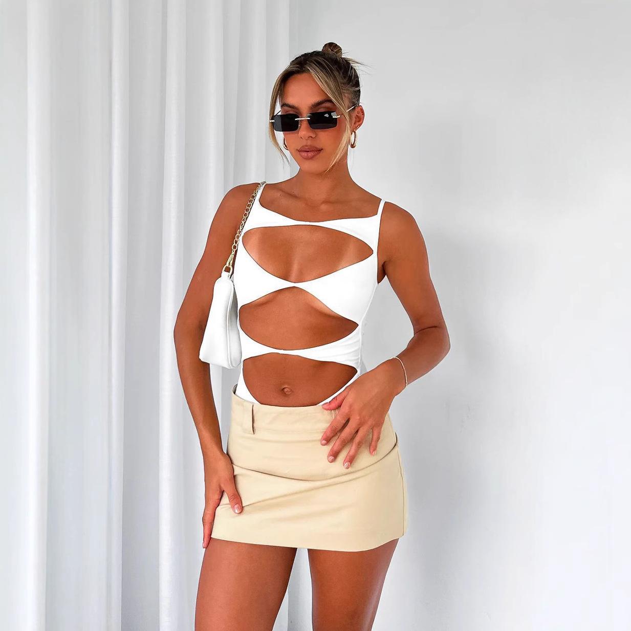 Tendencia de Moda Europea y Americana Transfronteriza Verano 2025 Sexy Slim Color Sólido Calado Jumpsuit Sin Mangas Mujer Venta al por Mayor