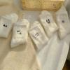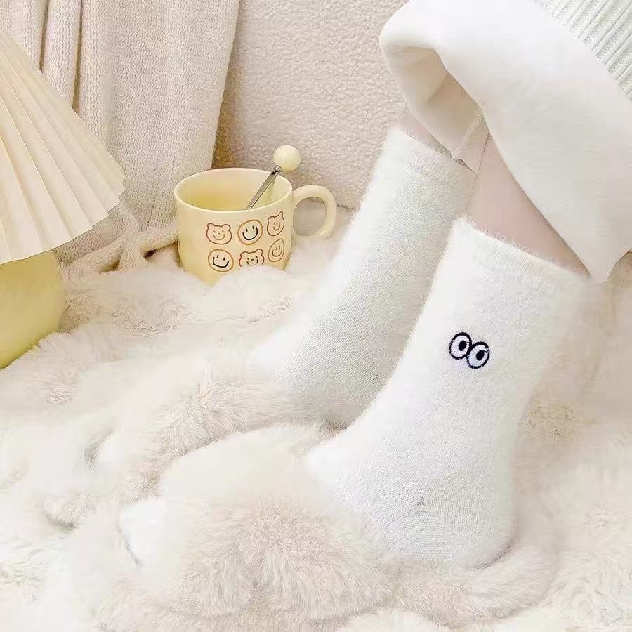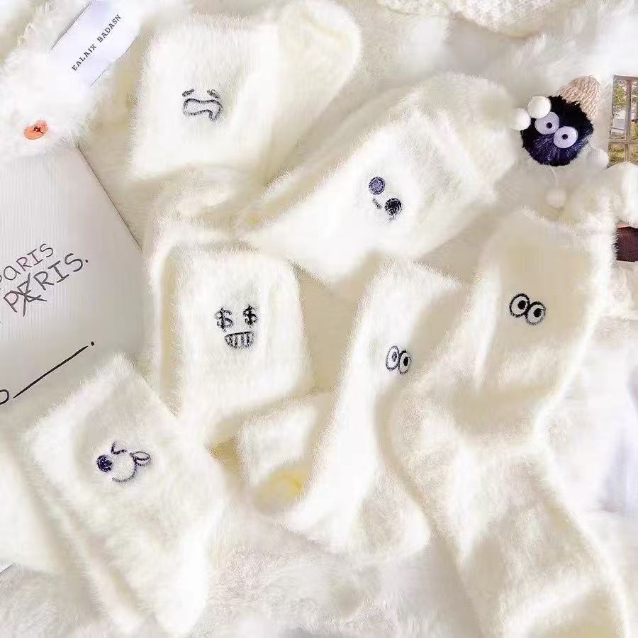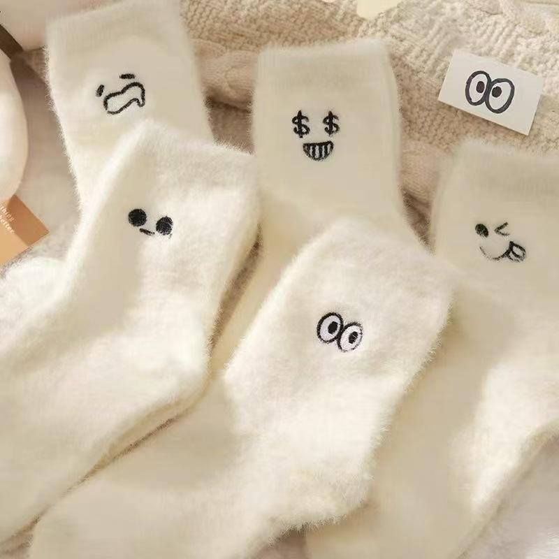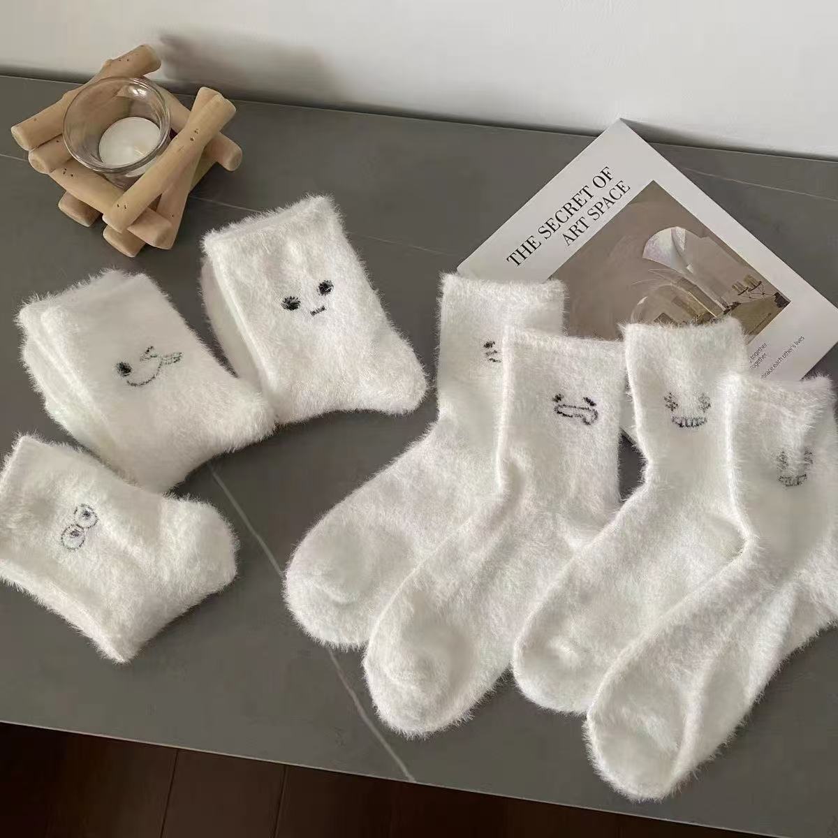Calcetines Peludos de Otoño e Invierno de Tubo Medio Cálidos para Dormir en Casa Blancos con Expresión Calcetines de Mujer Venta al por Mayor Dropshipping