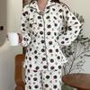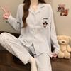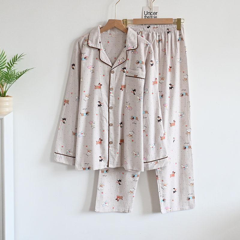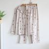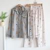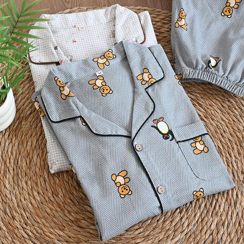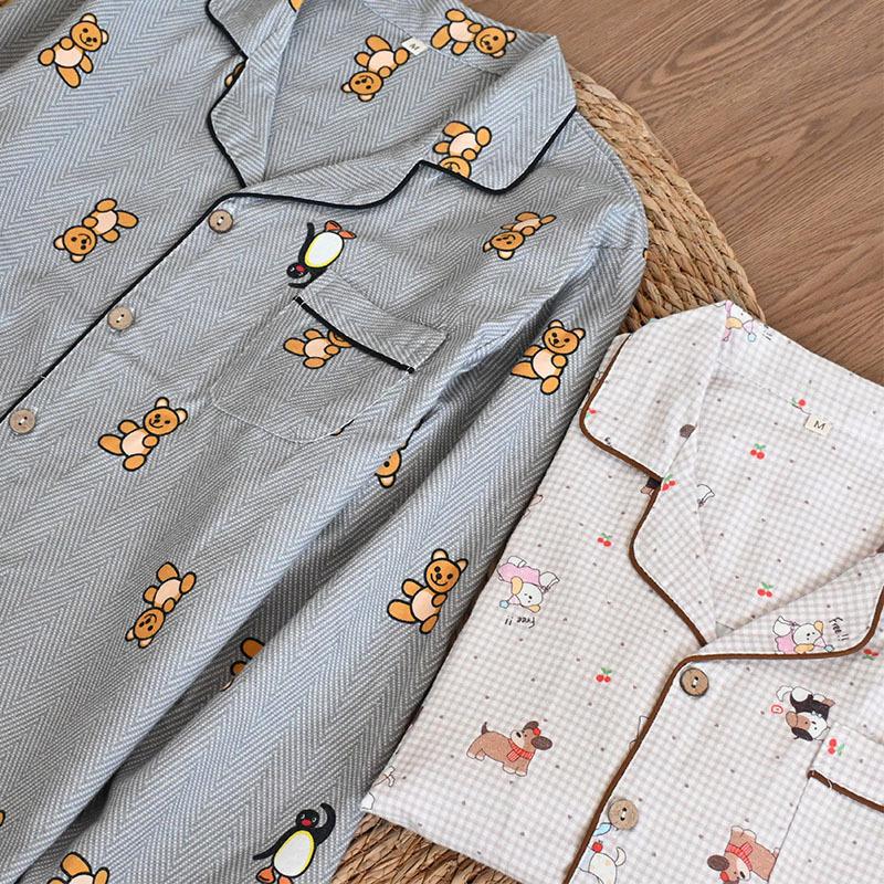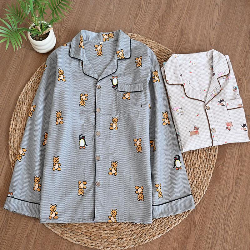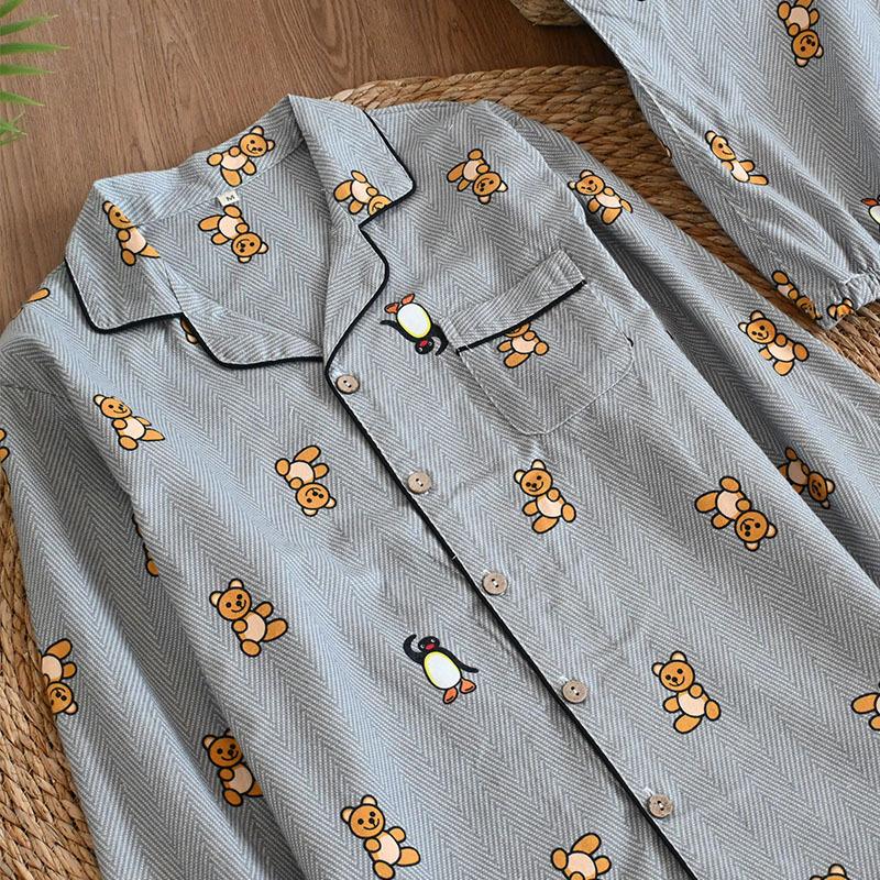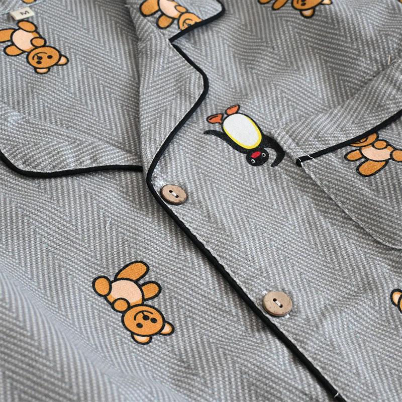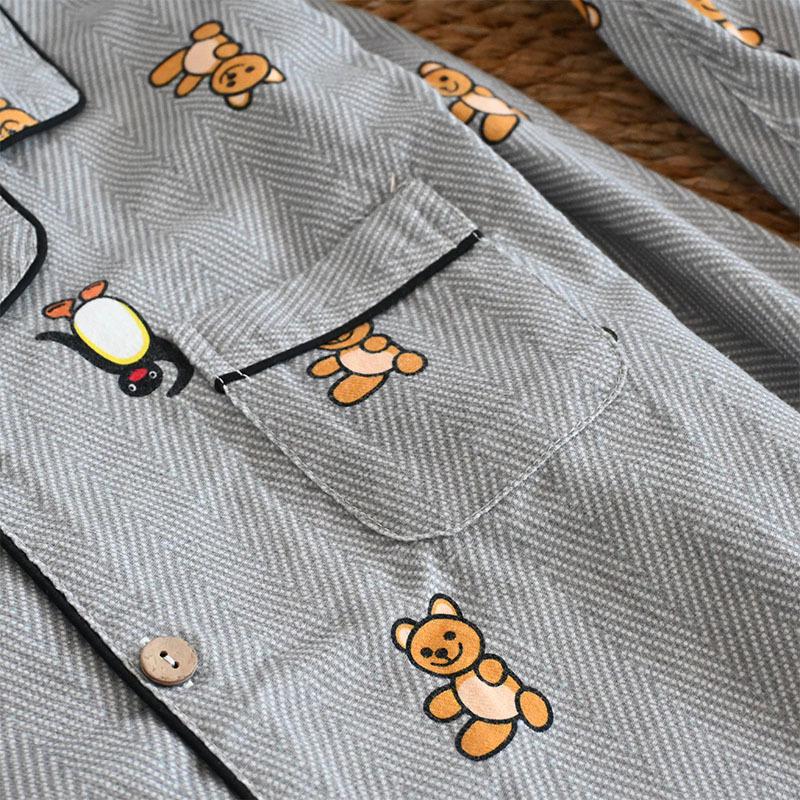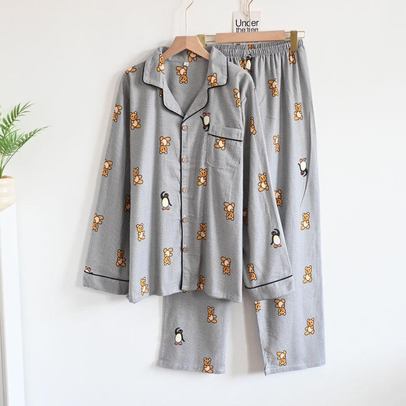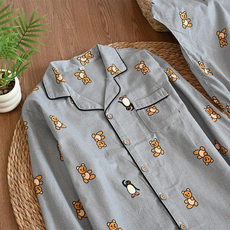 Pijama de Algodón Puro Cepillado de Oso Pingüino para Hombre Primavera y Otoño Nuevo Pantalón de Manga Larga Rayado de Dibujos Animados Conjunto para Estudiante para Estar en Casa