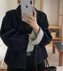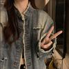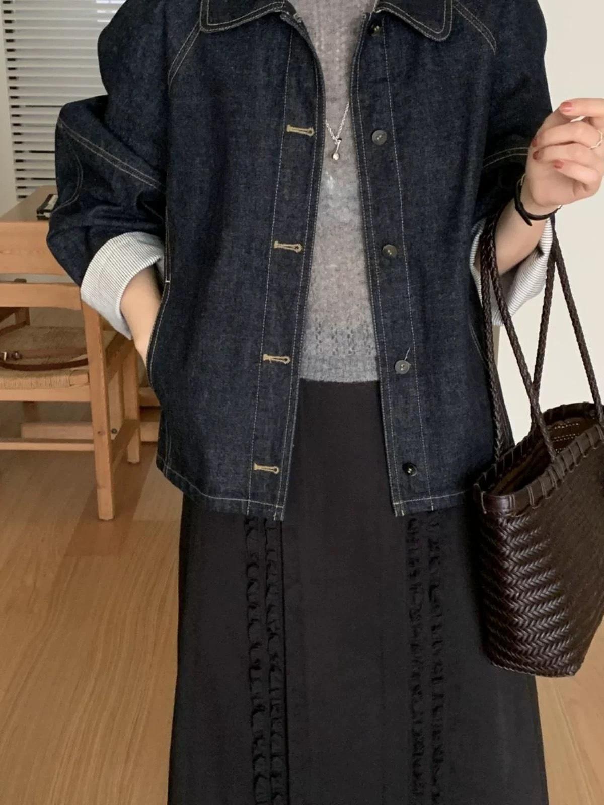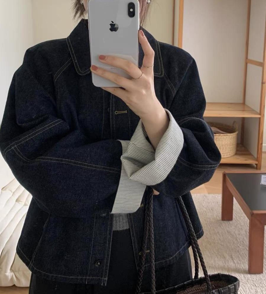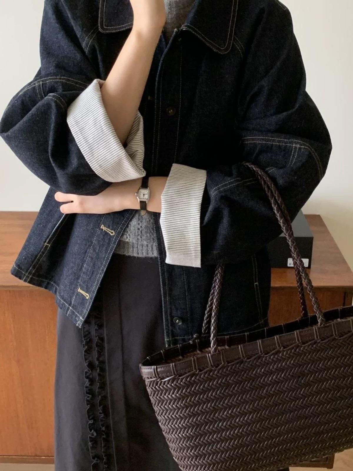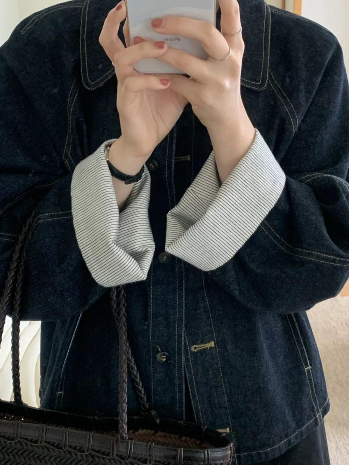 Chaqueta de mezclilla con solapa abotonadura sencilla para otoño de 2024 Puntadas rizadas a rayas Perfil holgado