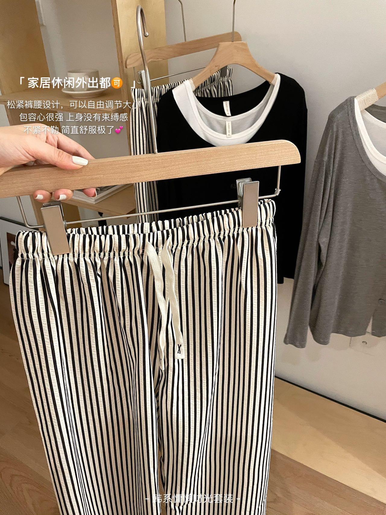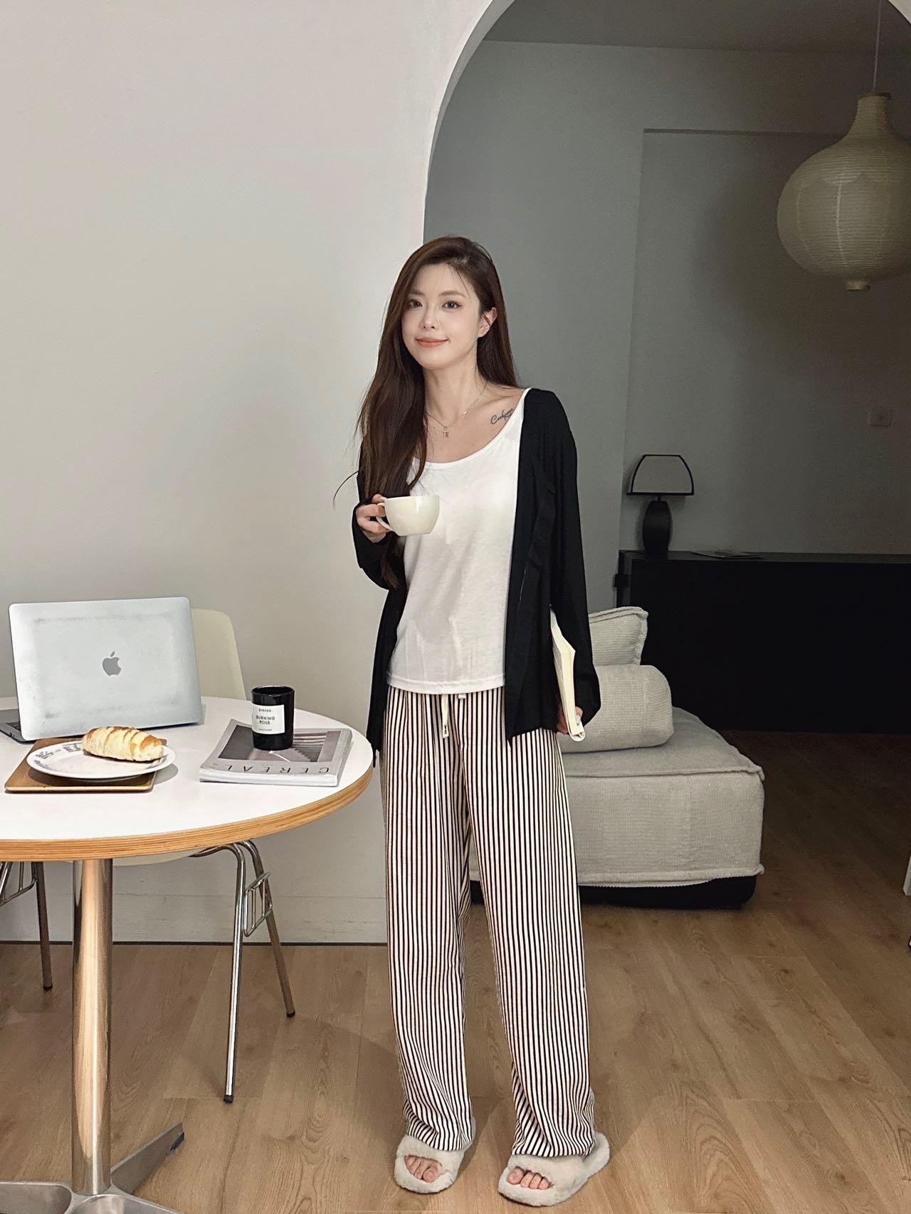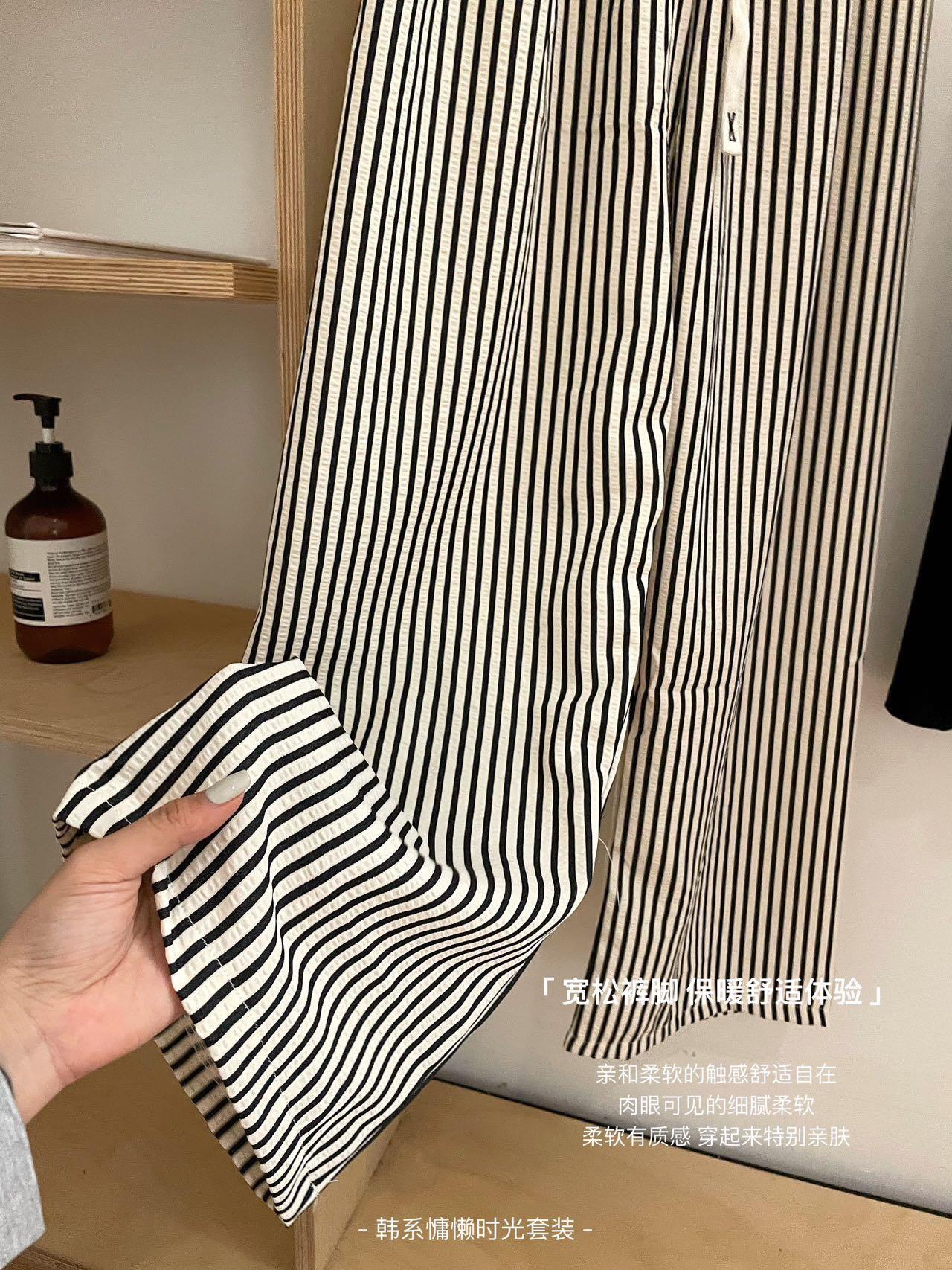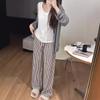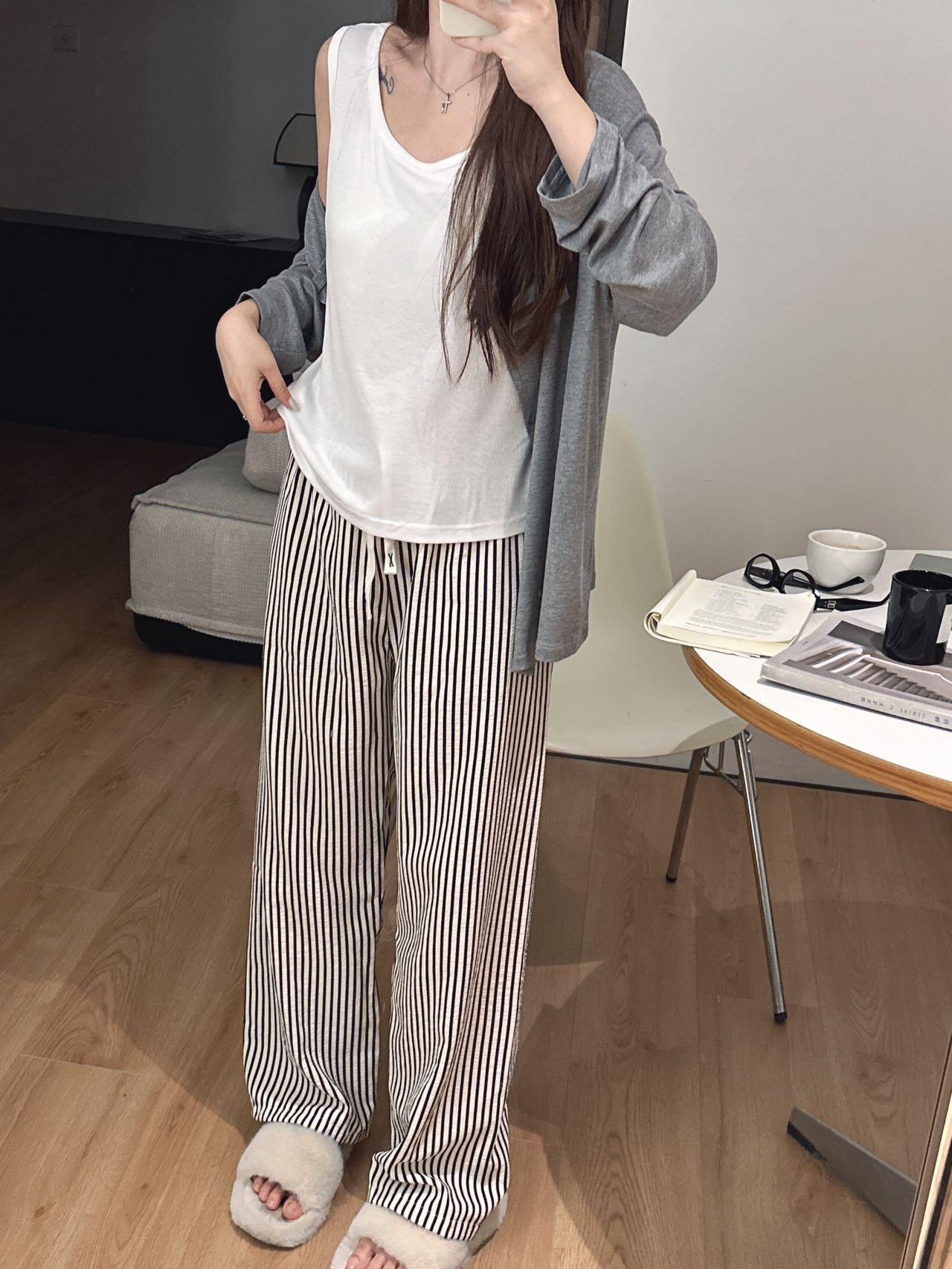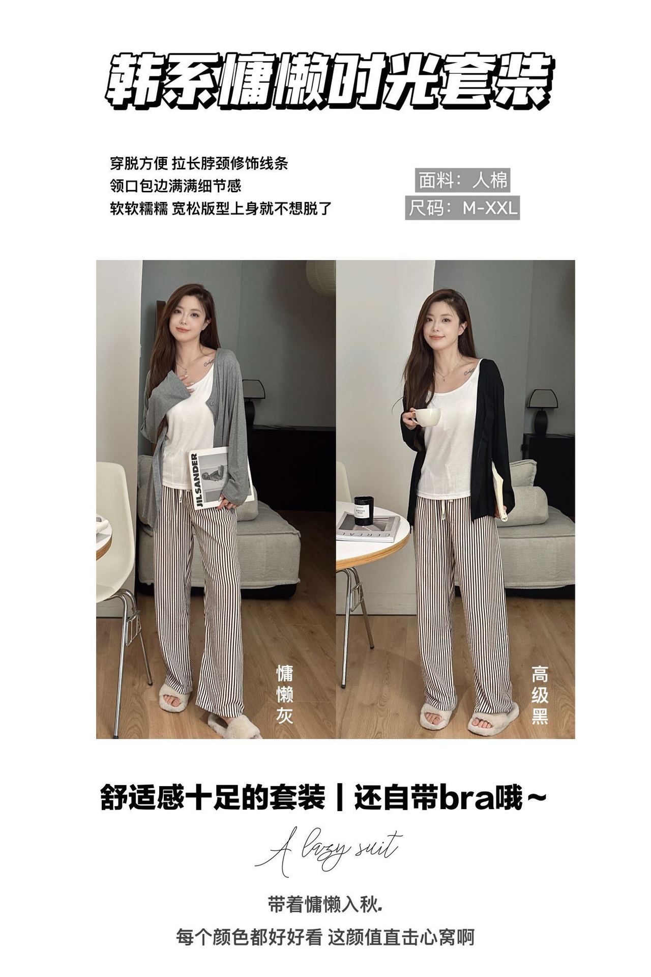 Traje de Tiempo Libre Estilo Coreano para Mujer Primavera y Otoño Chaleco Pantalones de Manga Larga Tres Piezas a Rayas Ropa para el Hogar de Alta Gama