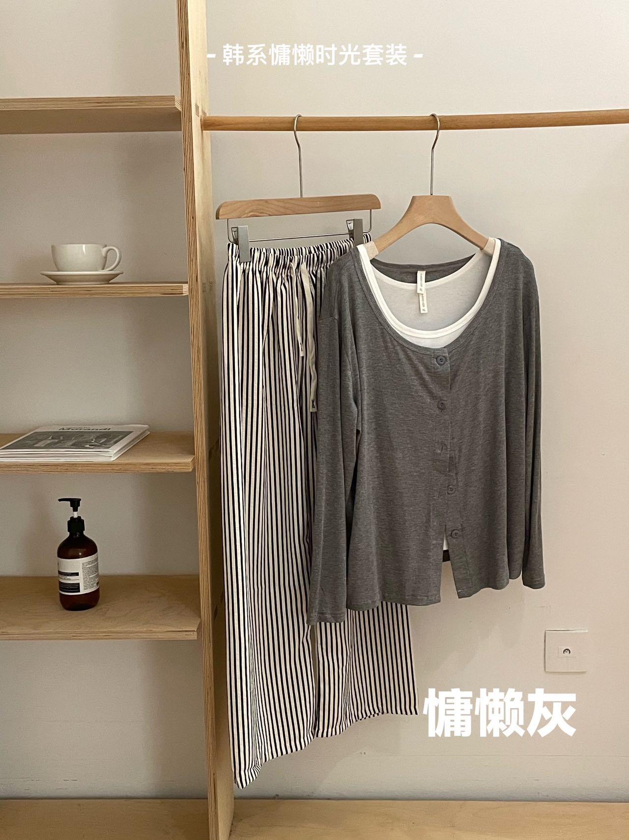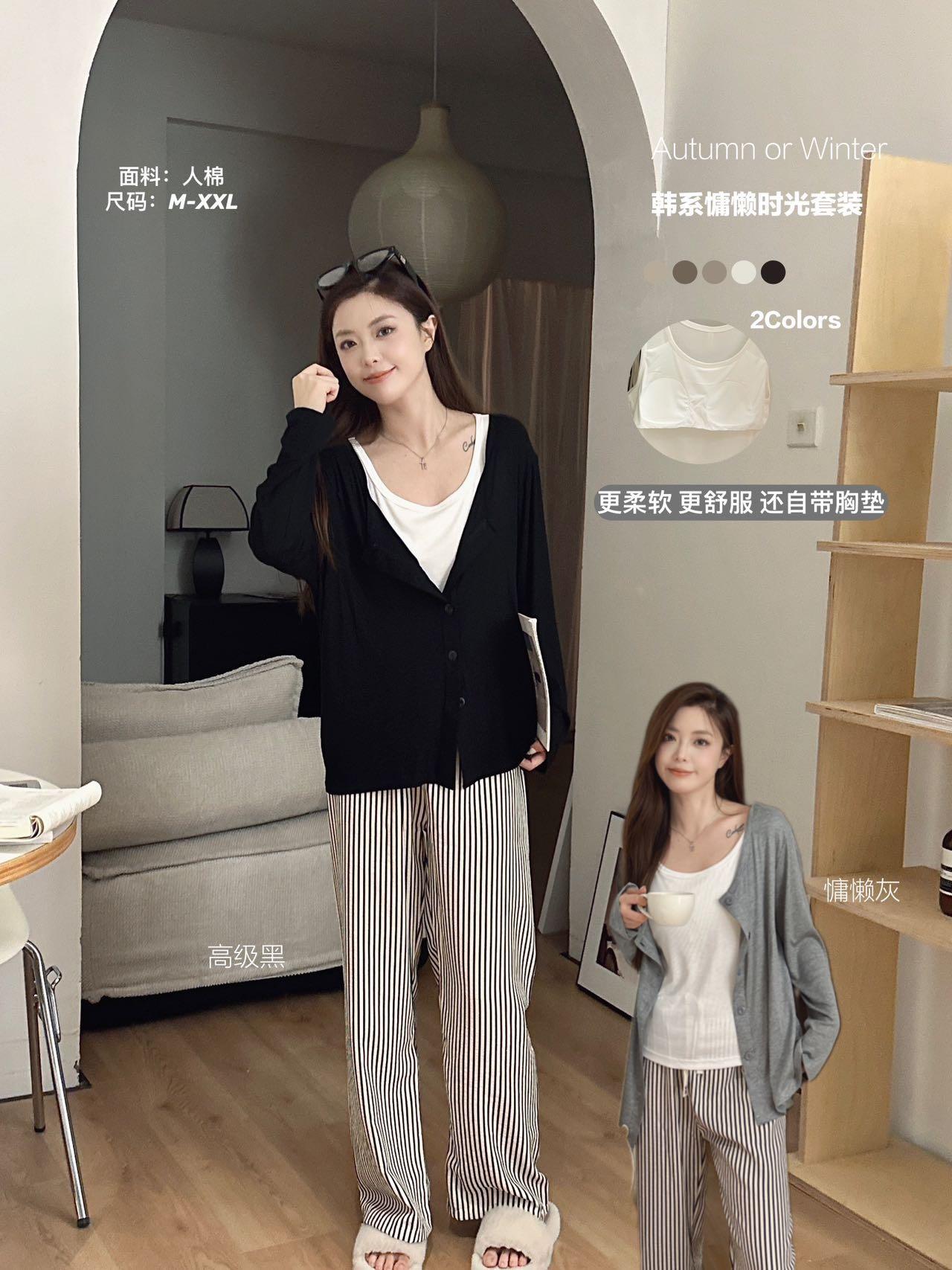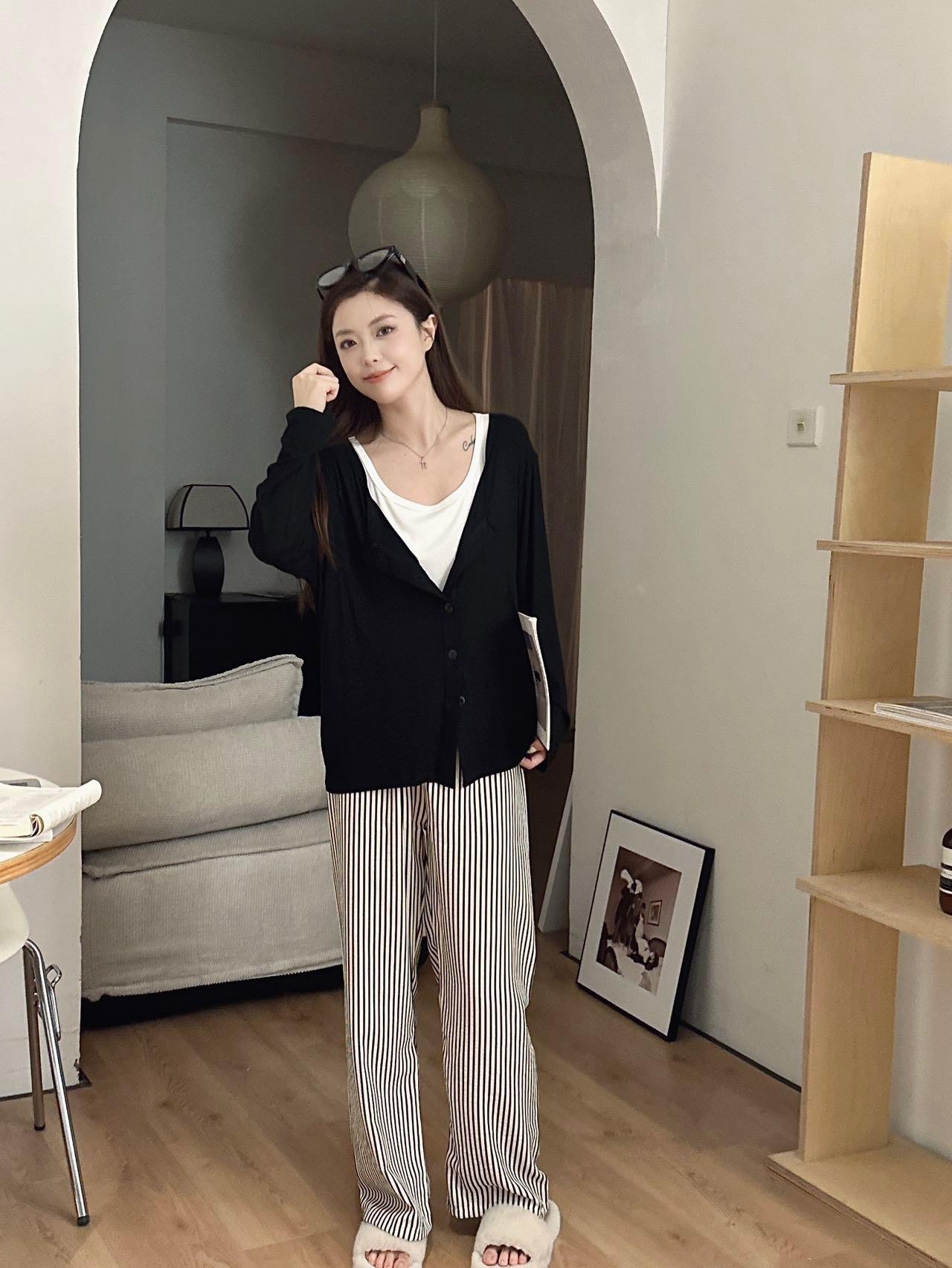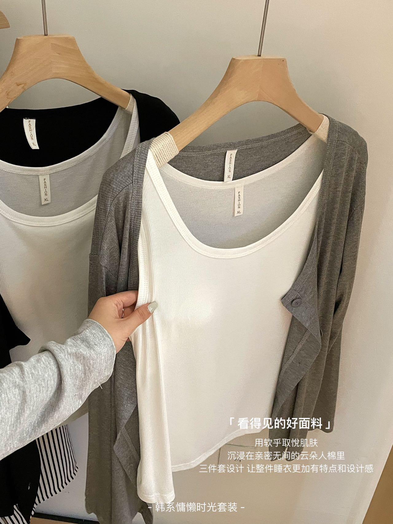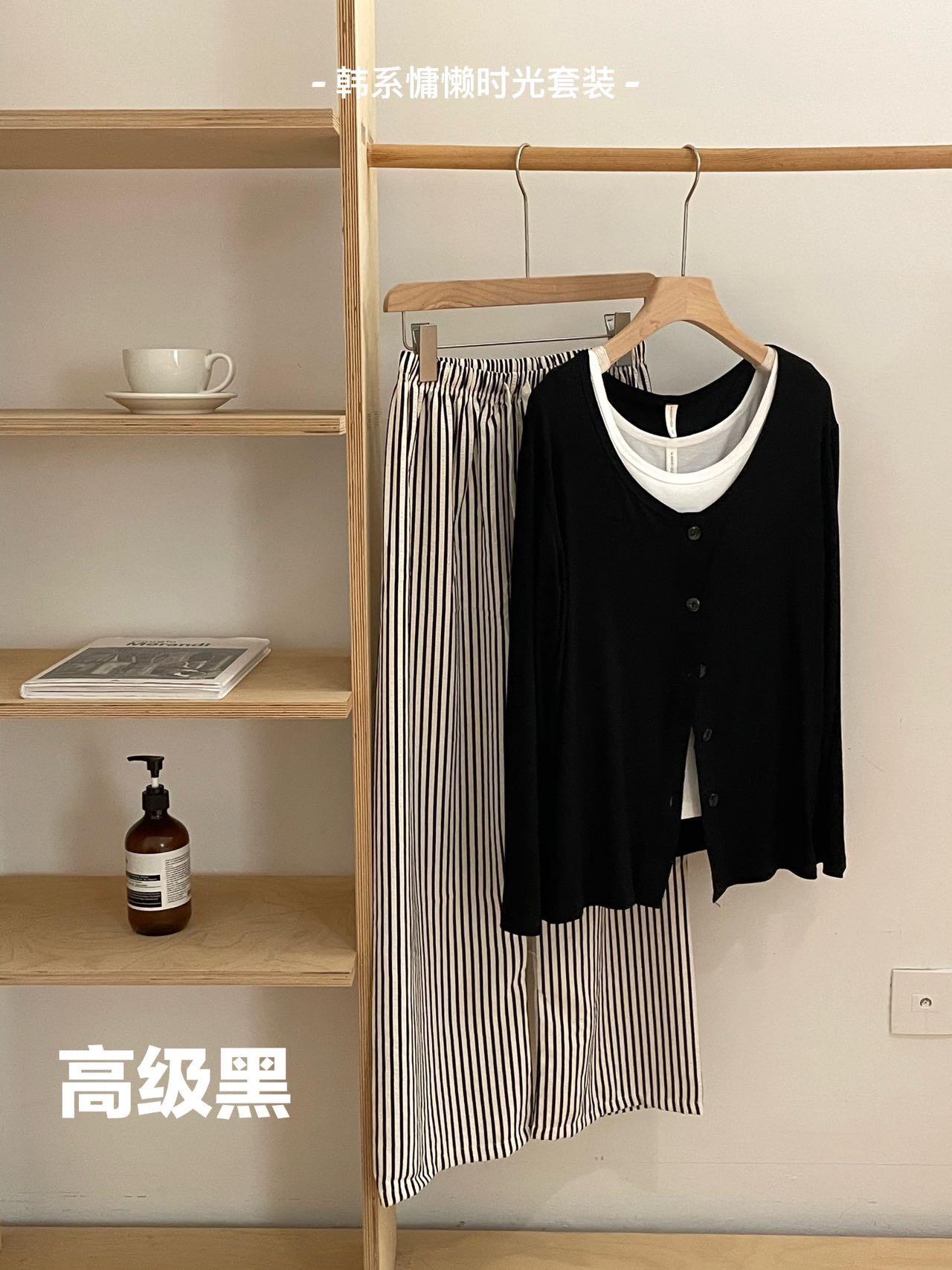 Traje de Tiempo Libre Estilo Coreano para Mujer Primavera y Otoño Chaleco Pantalones de Manga Larga Tres Piezas a Rayas Ropa para el Hogar de Alta Gama