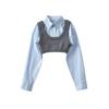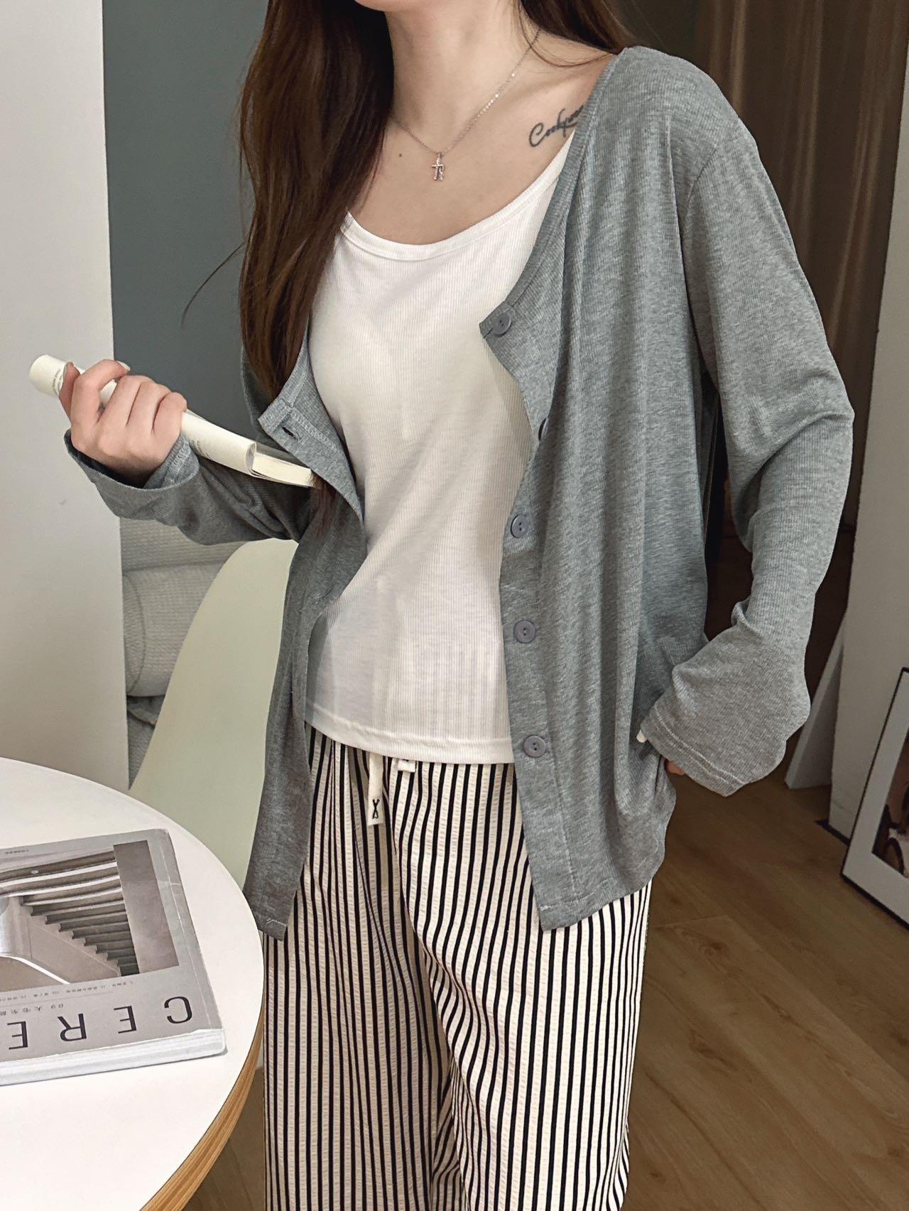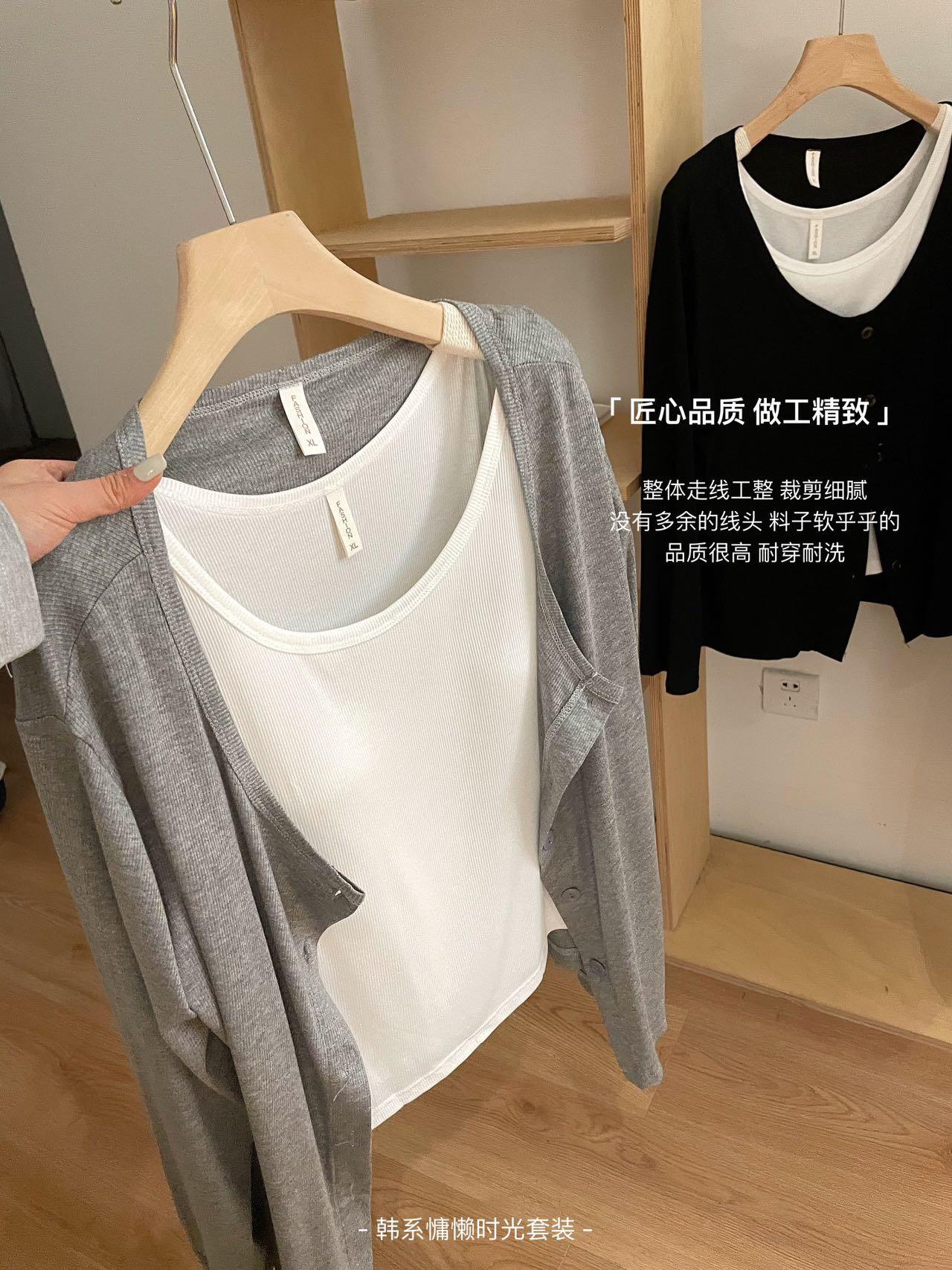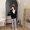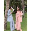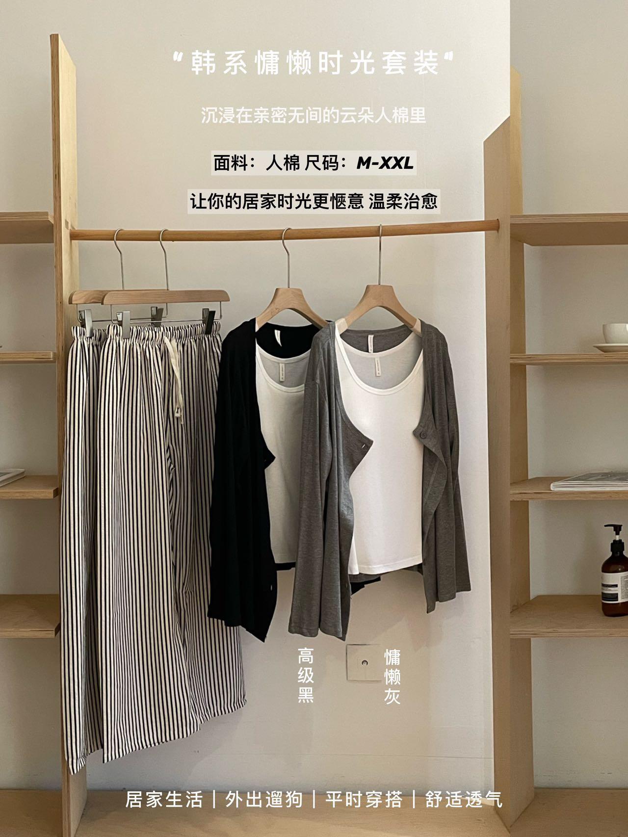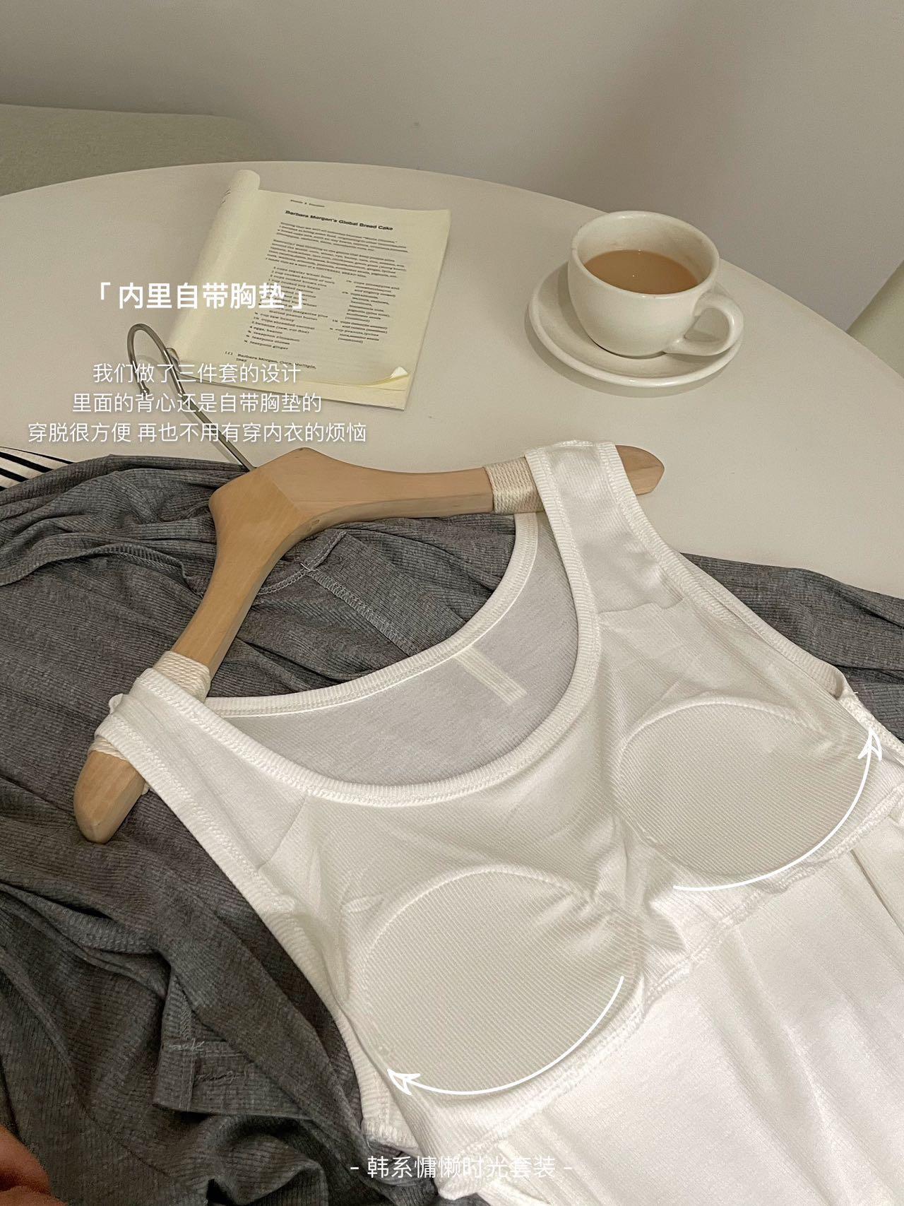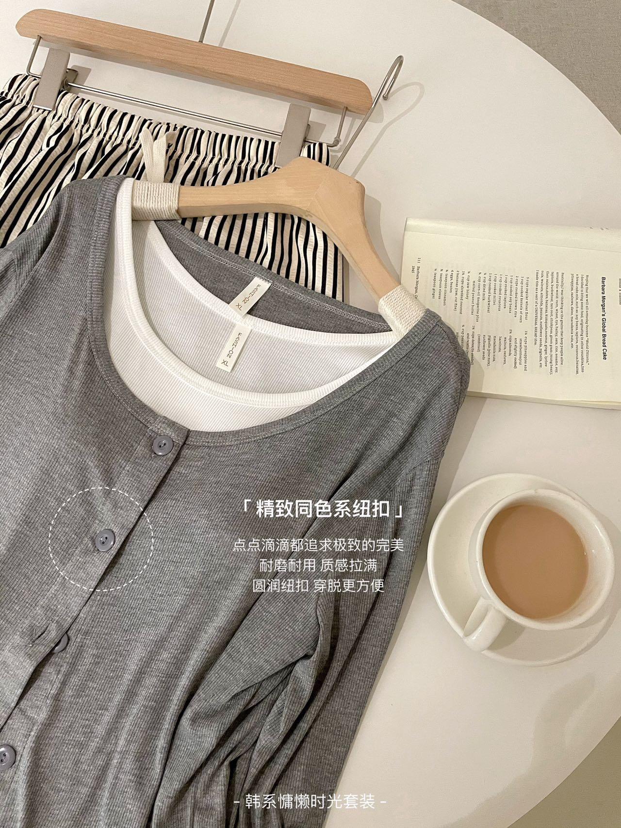 Traje de Tiempo Libre Estilo Coreano para Mujer Primavera y Otoño Chaleco Pantalones de Manga Larga Tres Piezas a Rayas Ropa para el Hogar de Alta Gama