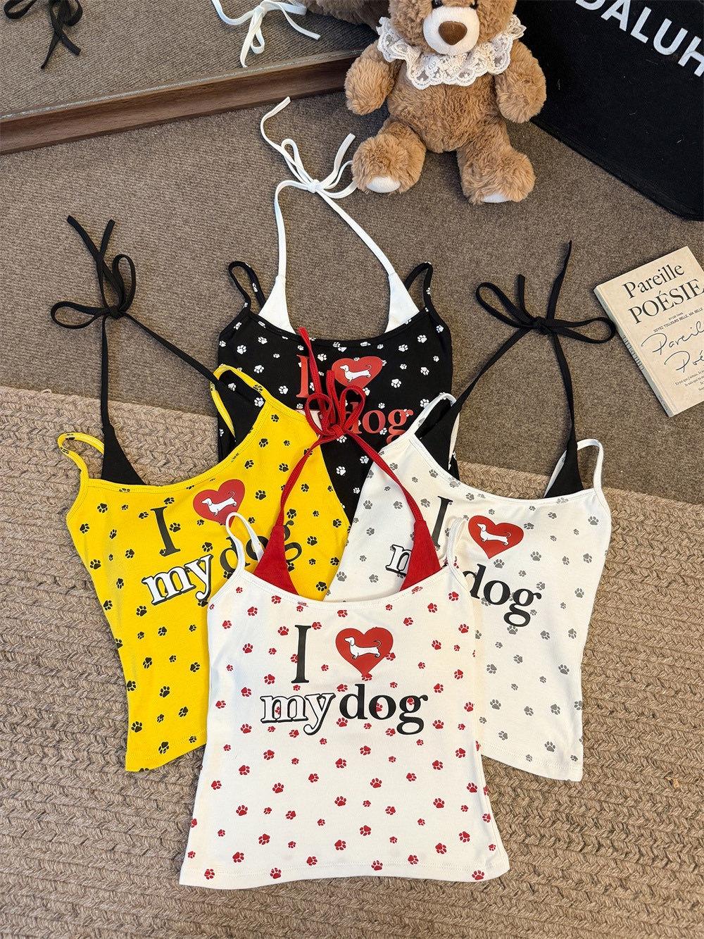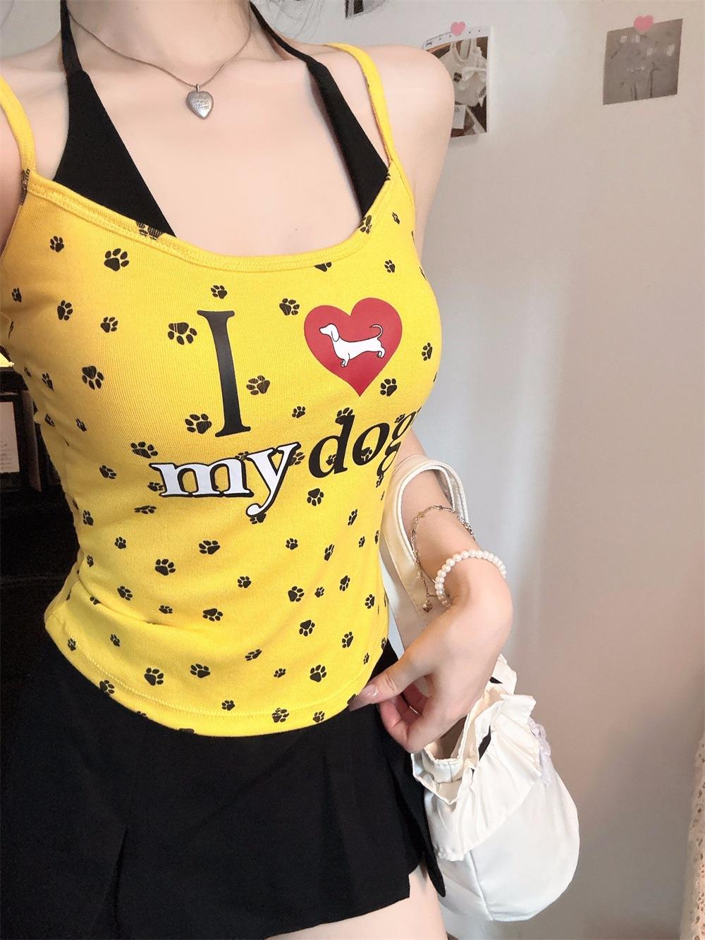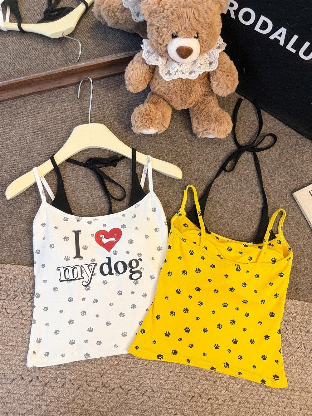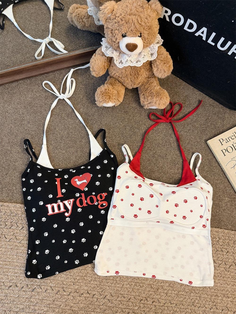 6129 # Rayón Chica Sexy Falso Dos Piezas Halter Camisola para Mujer con Almohadilla para el Busto Estampado de Garra de Perro Amor Espalda Hermosa Top