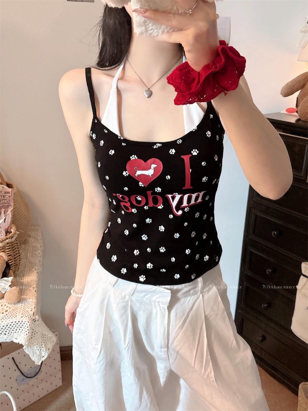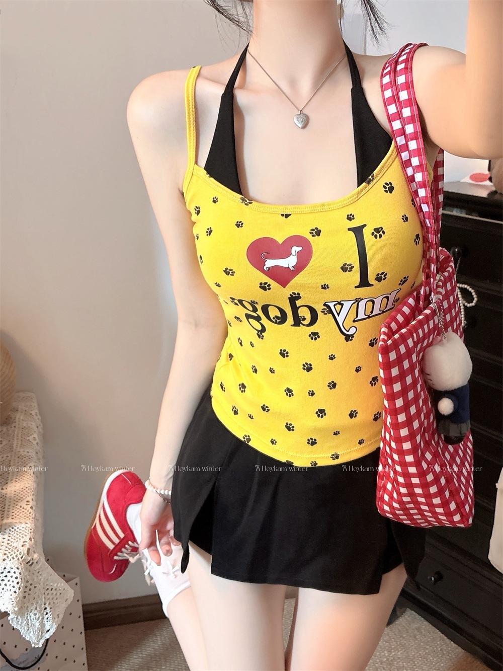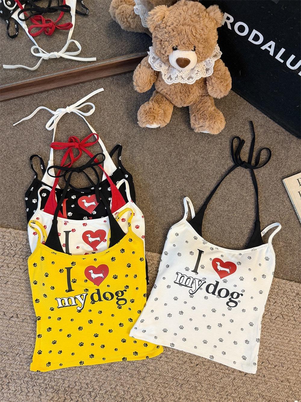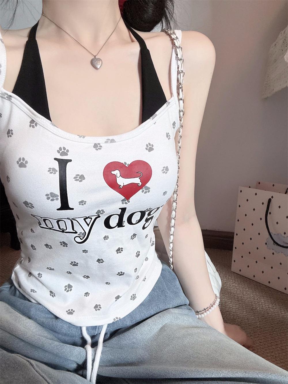 6129 # Rayón Chica Sexy Falso Dos Piezas Halter Camisola para Mujer con Almohadilla para el Busto Estampado de Garra de Perro Amor Espalda Hermosa Top