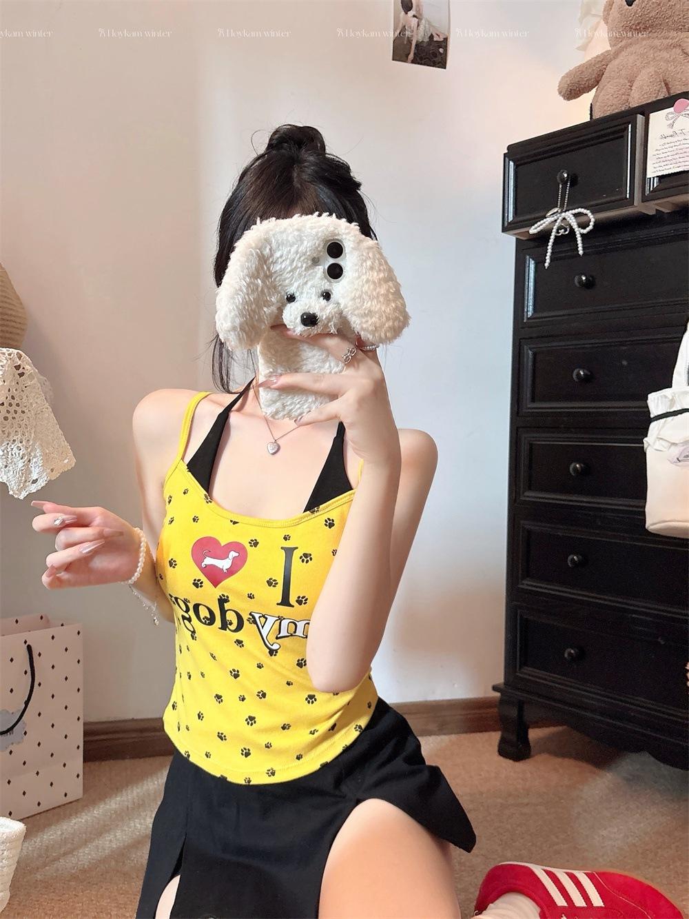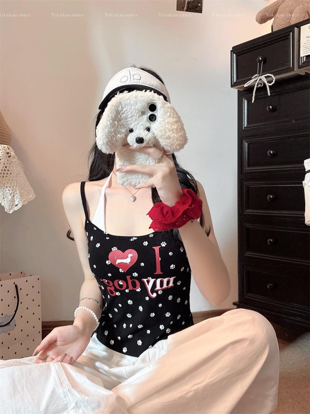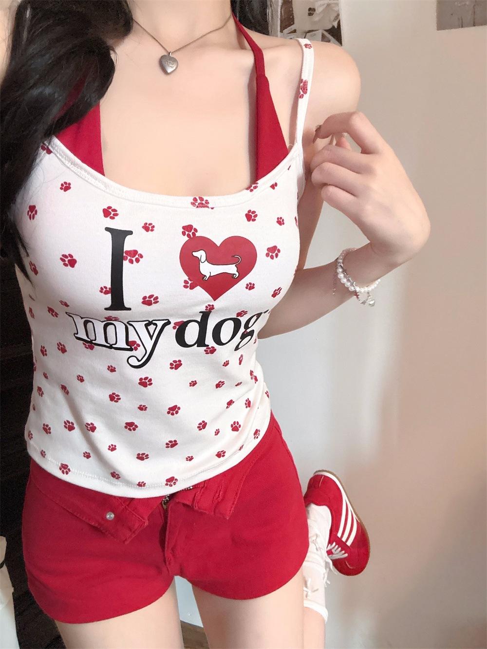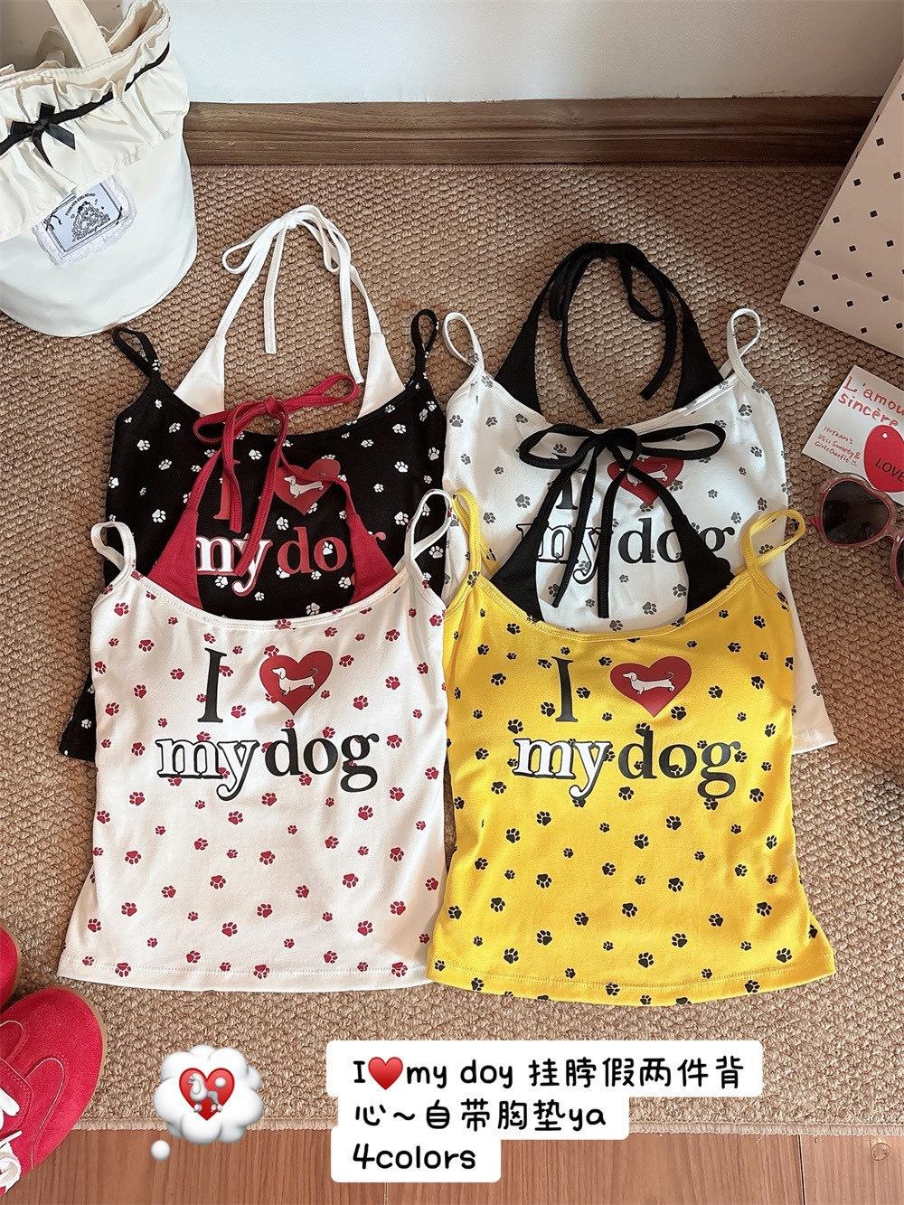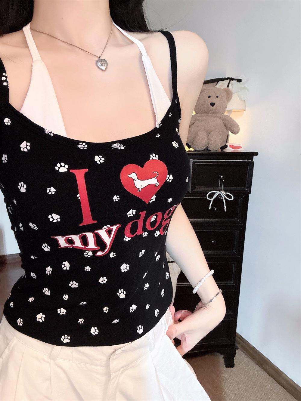 6129 # Rayón Chica Sexy Falso Dos Piezas Halter Camisola para Mujer con Almohadilla para el Busto Estampado de Garra de Perro Amor Espalda Hermosa Top