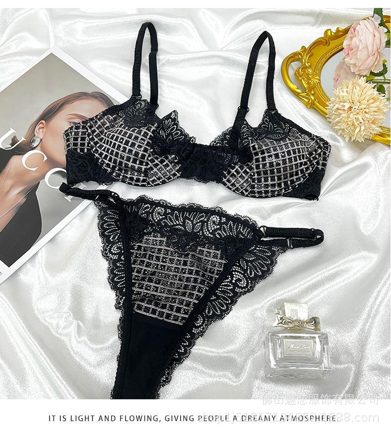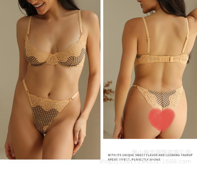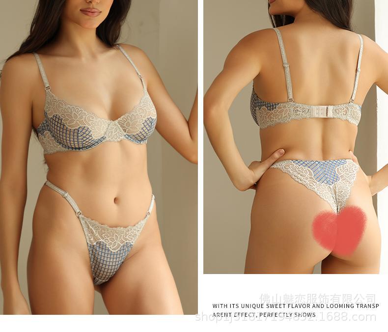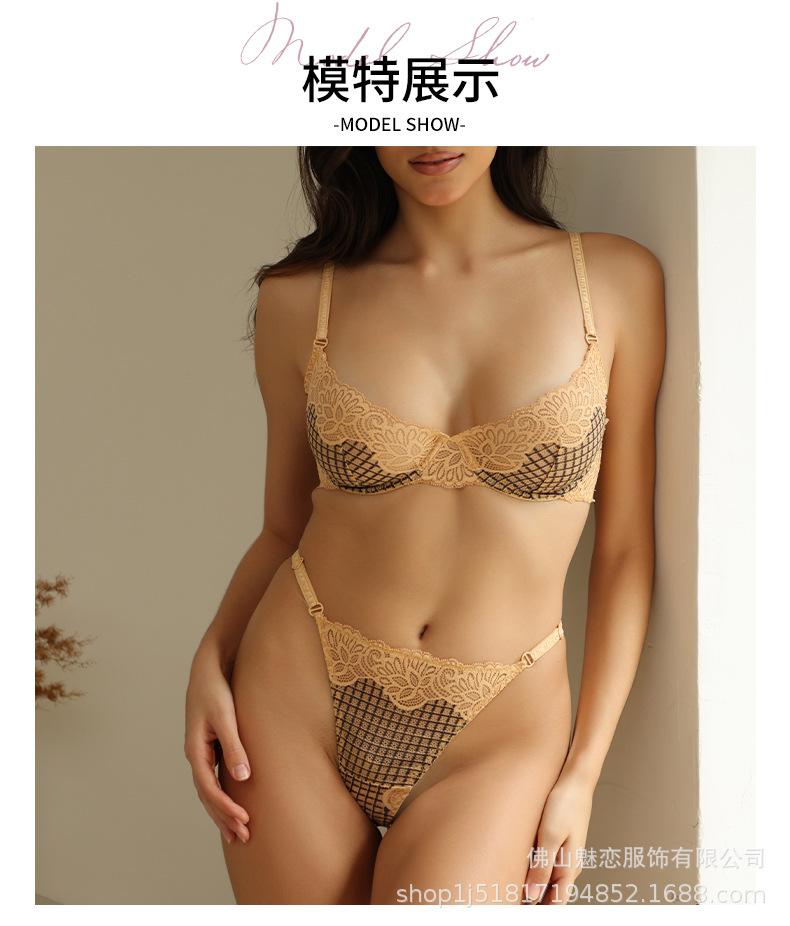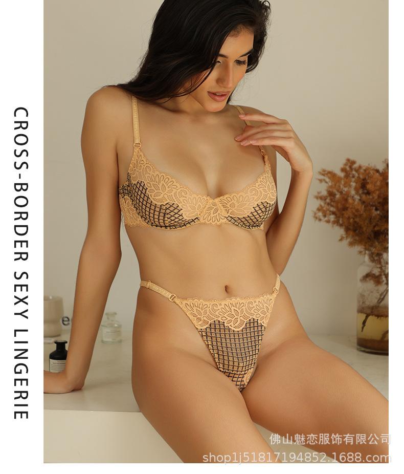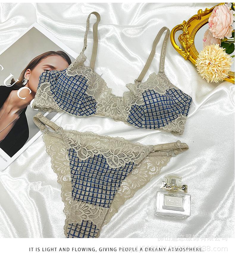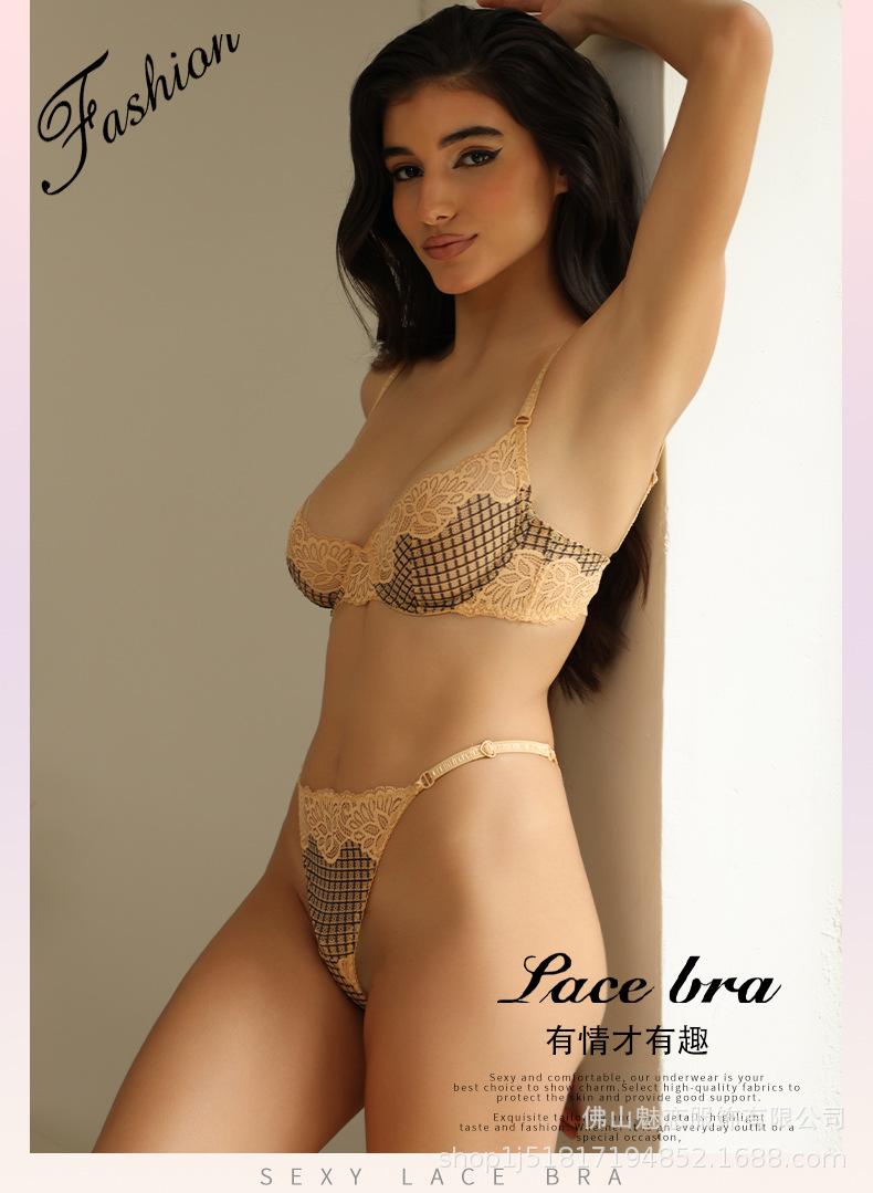 Lencería Sexy Francesa Europea y Americana Transfronteriza Sexy de Malla Transparente Encaje a Cuadros Mostrando Busto Pequeño Set de Brasier Push-Up