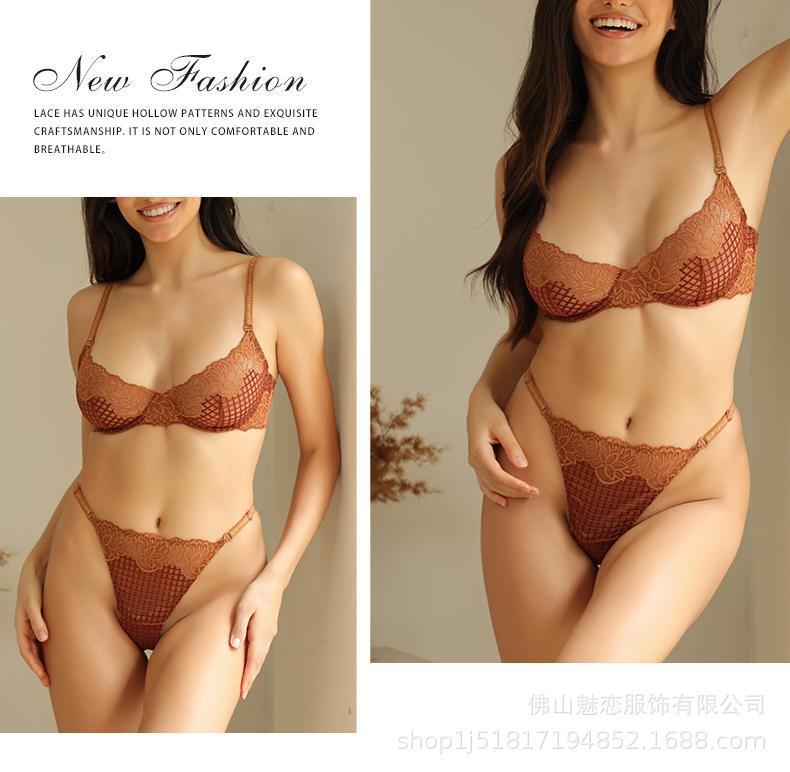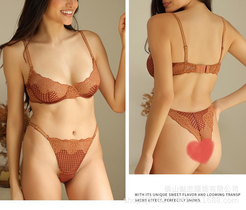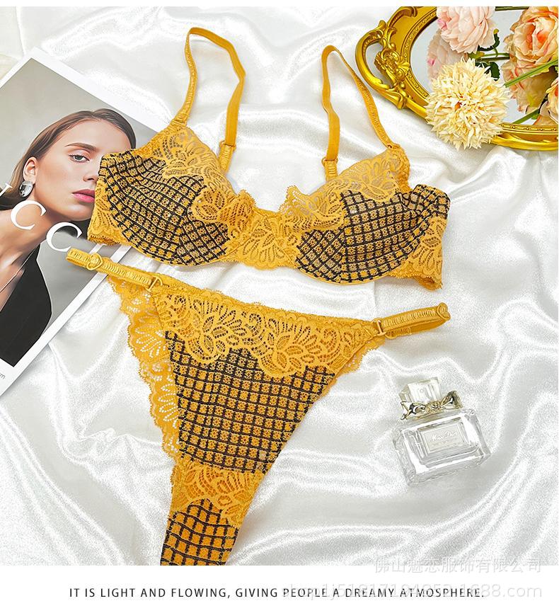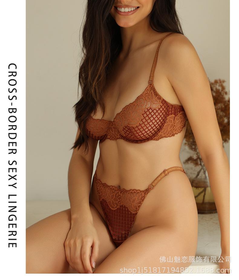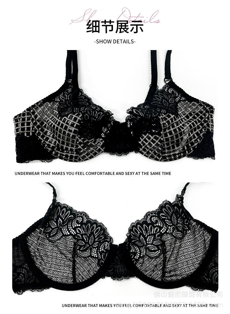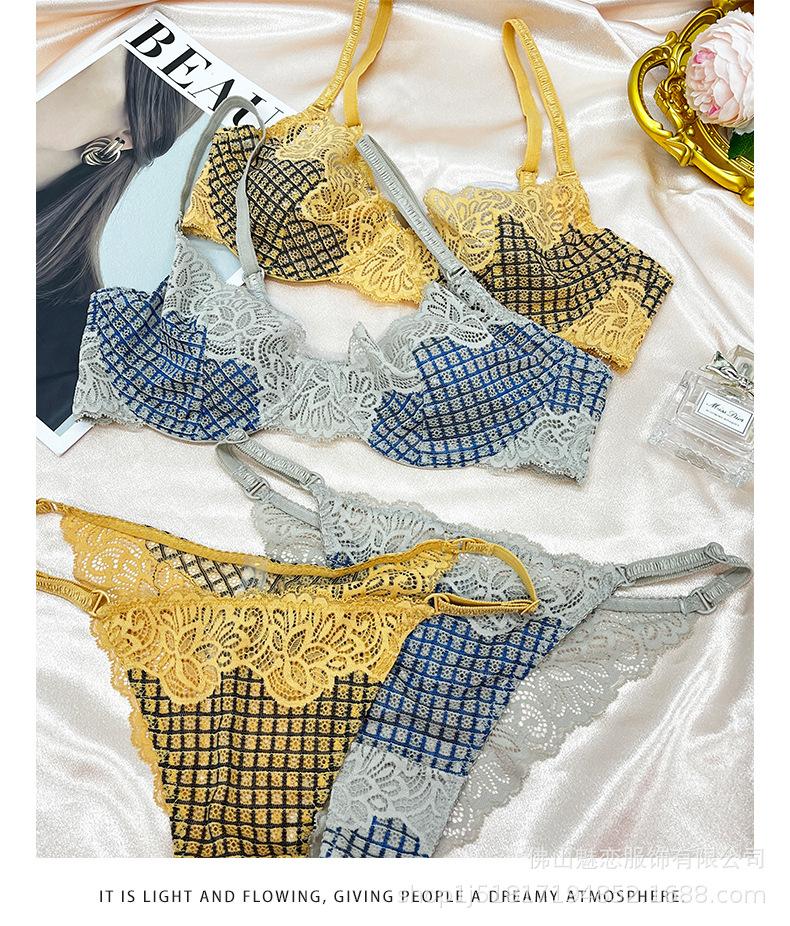 Lencería Sexy Francesa Europea y Americana Transfronteriza Sexy de Malla Transparente Encaje a Cuadros Mostrando Busto Pequeño Set de Brasier Push-Up