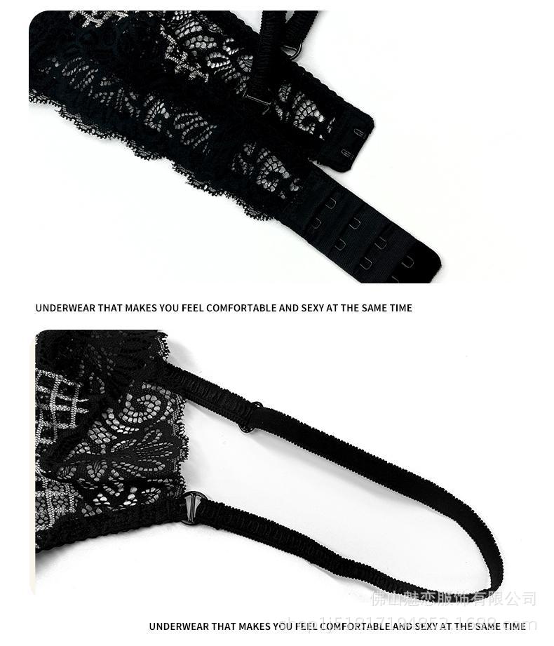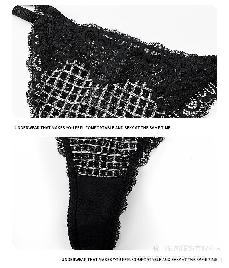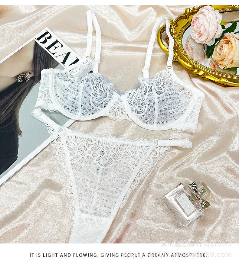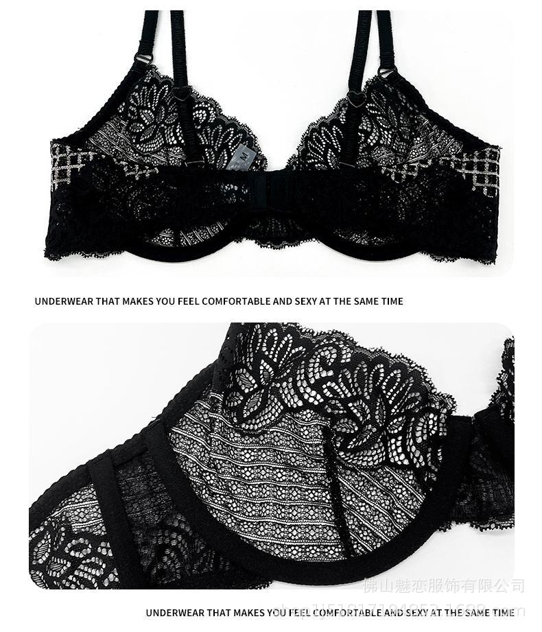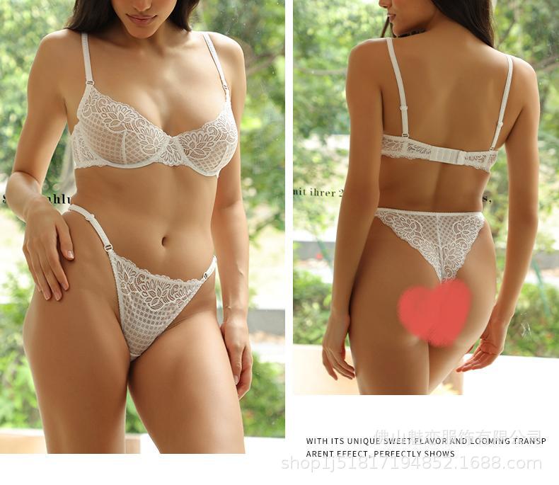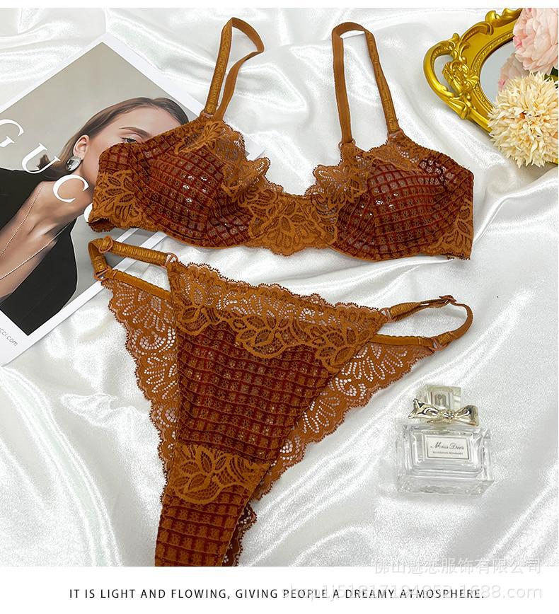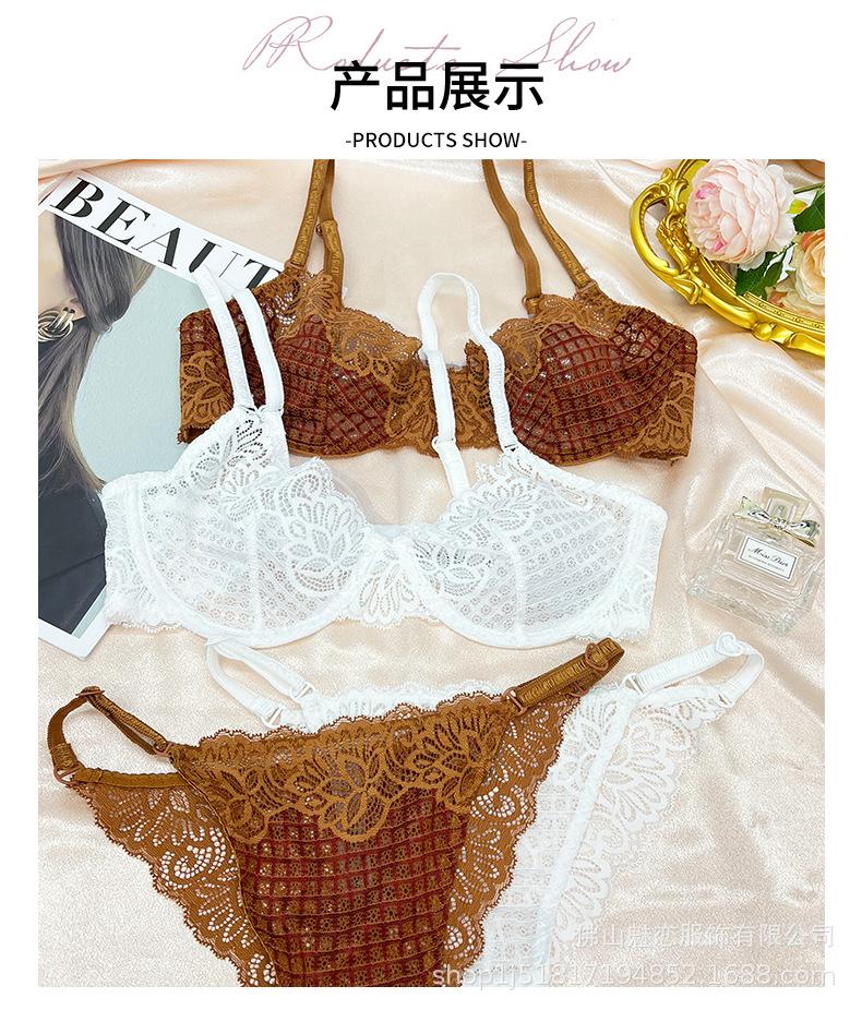 Lencería Sexy Francesa Europea y Americana Transfronteriza Sexy de Malla Transparente Encaje a Cuadros Mostrando Busto Pequeño Set de Brasier Push-Up