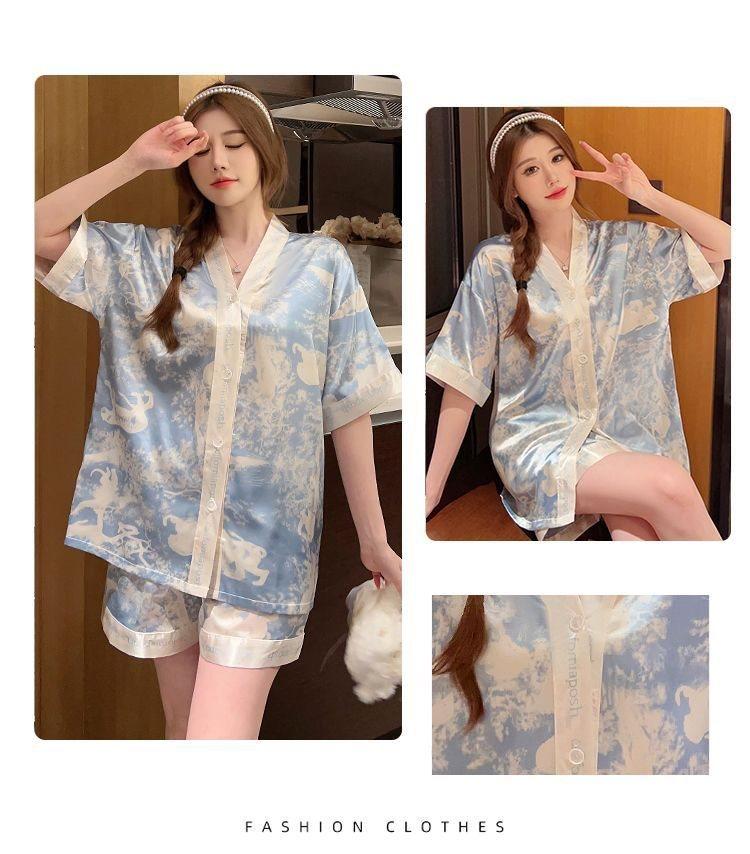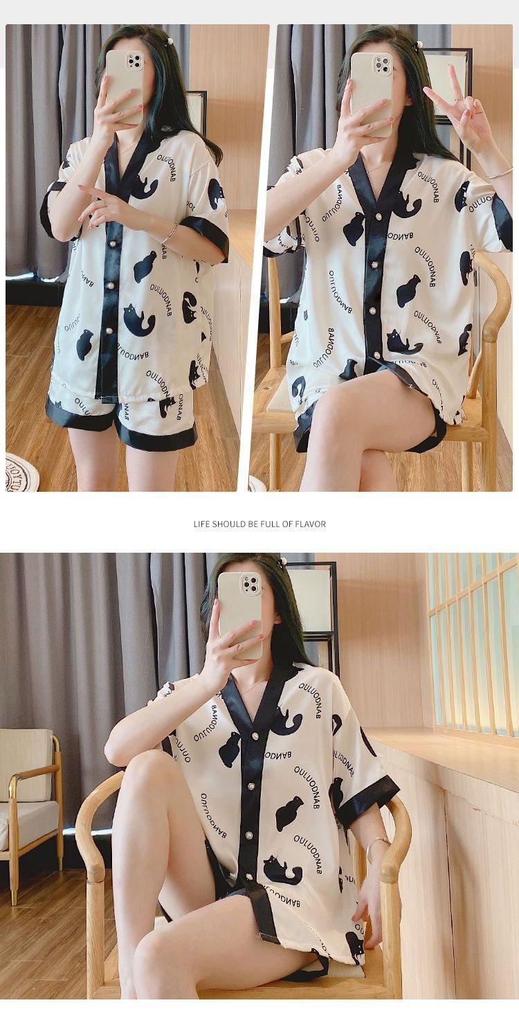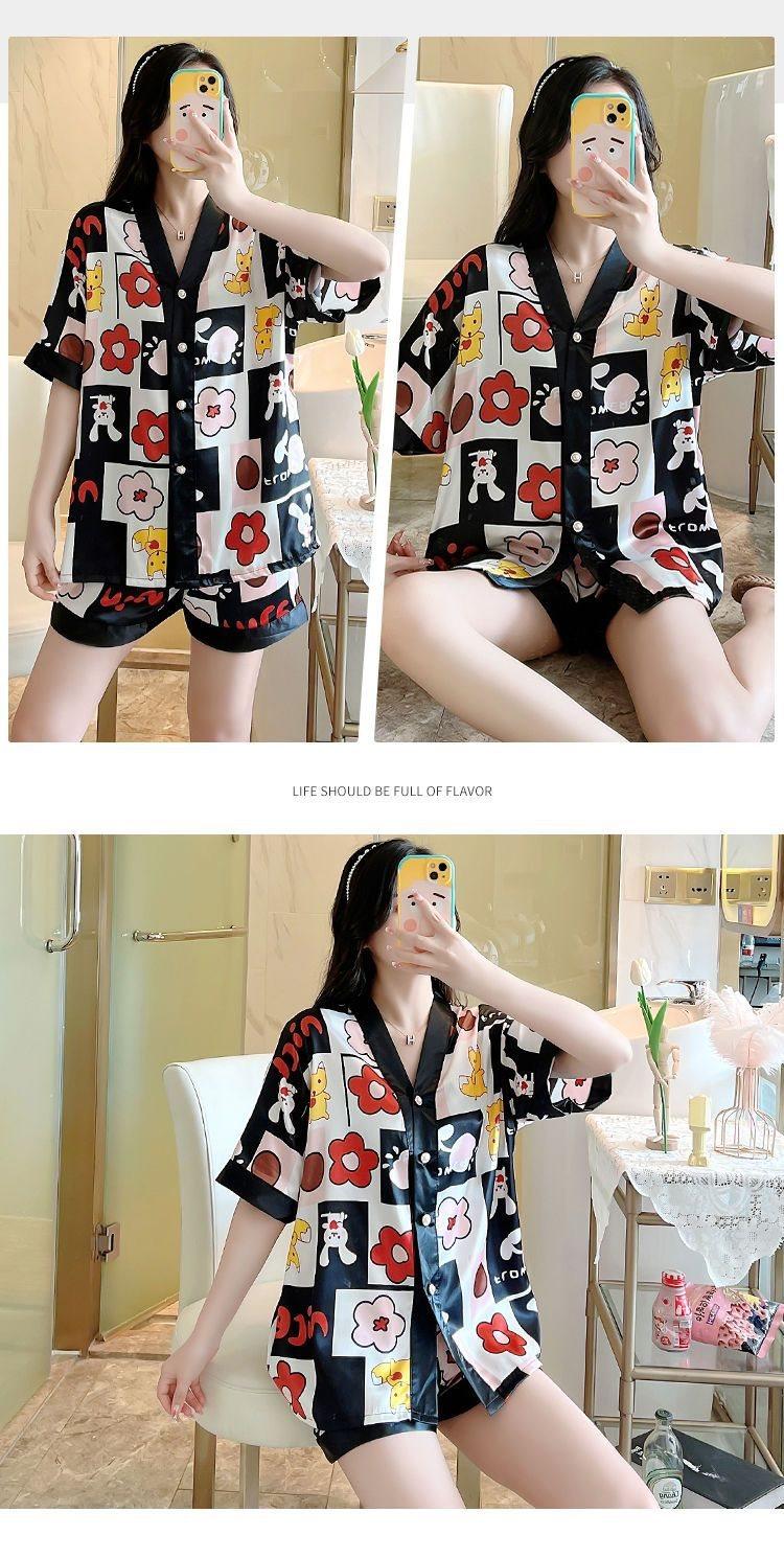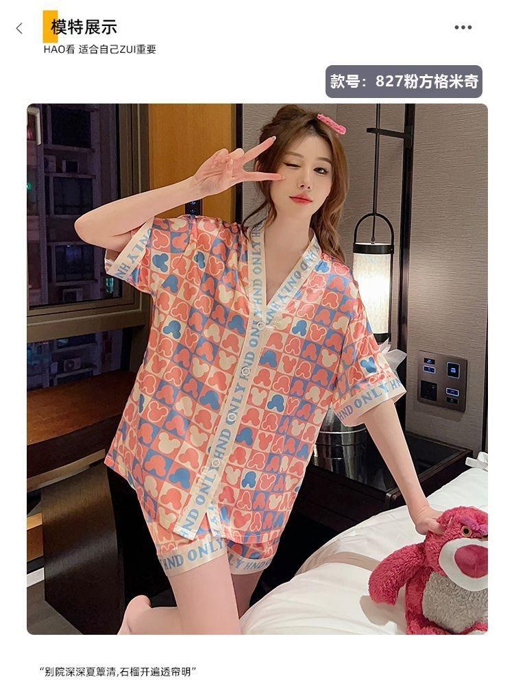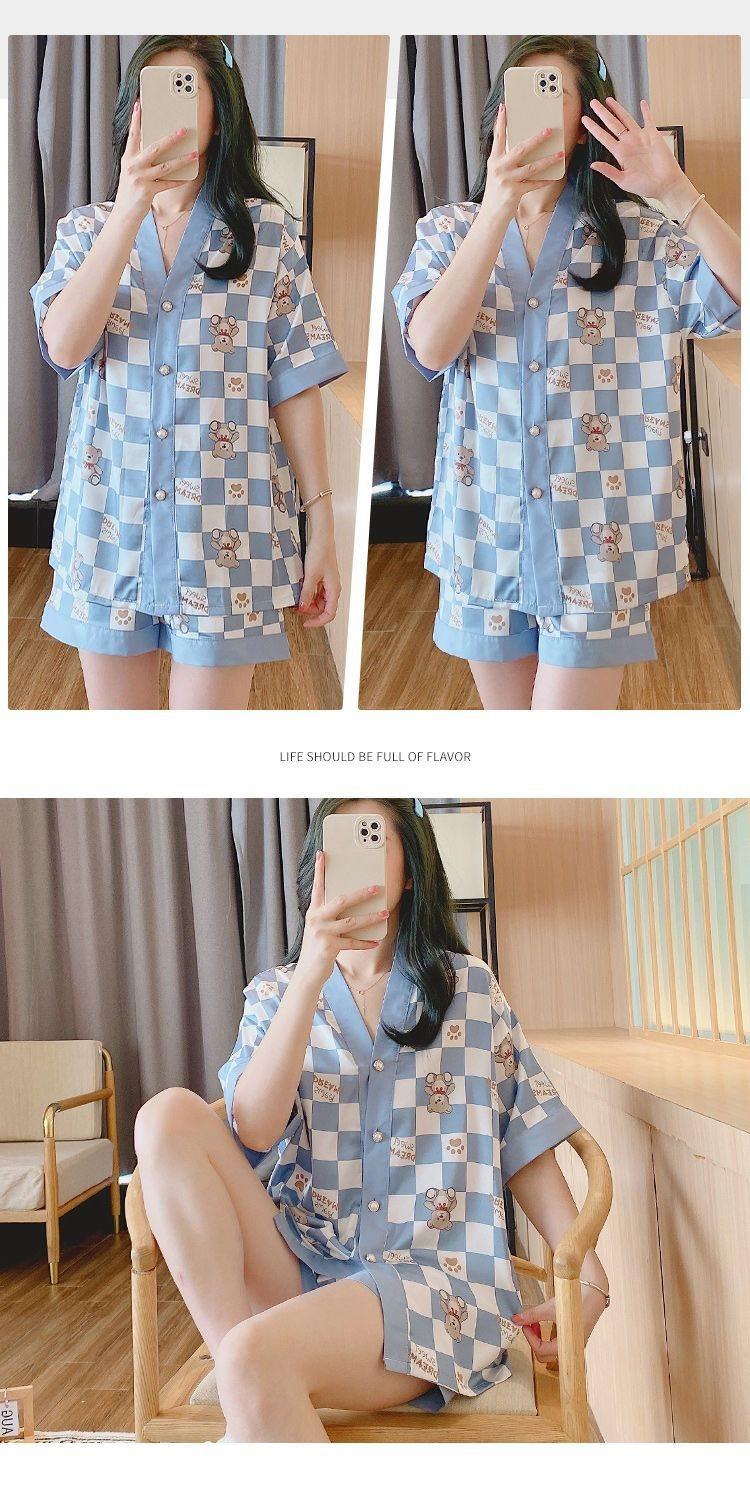Pijama para Mujer Verano Seda de Hielo Manga Corta Estilo Coreano Delgada Estudiante Linda Sexy Verano Traje de Dos Piezas Dibujos Animados Ropa para el Hogar