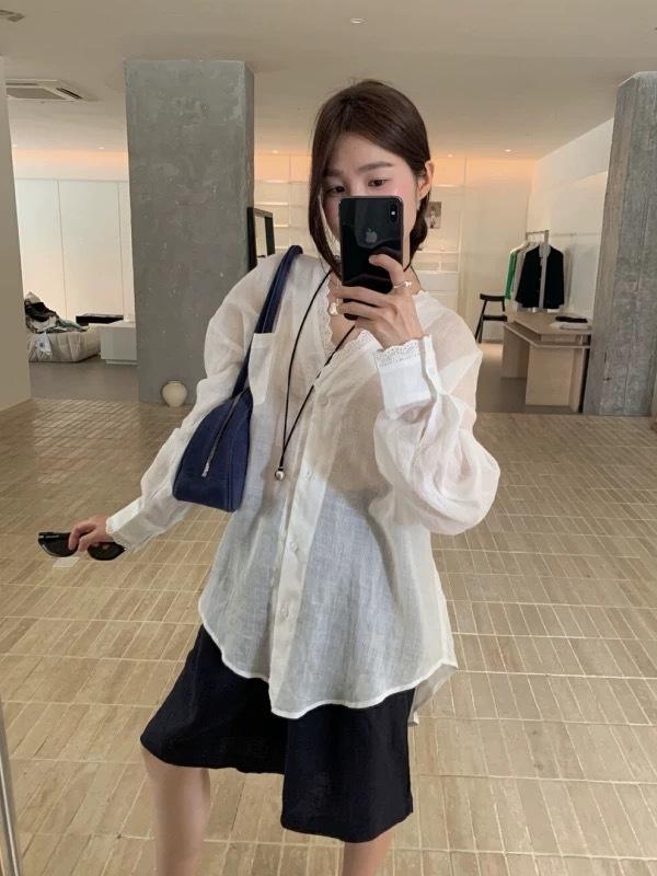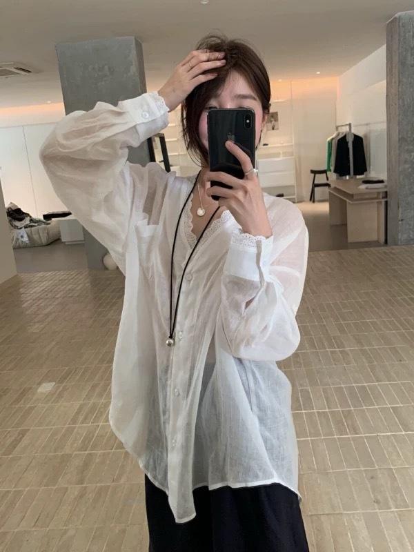 Encaje Cuello en V Ramio Ultrafino Seda de Hielo Camisa Chaqueta Protector Solar para Mujer Verano Nuevo Estilo Perezoso Suelto Manga Larga
