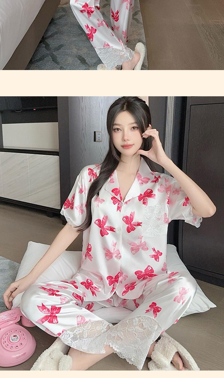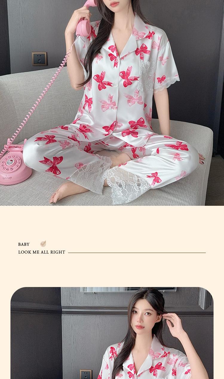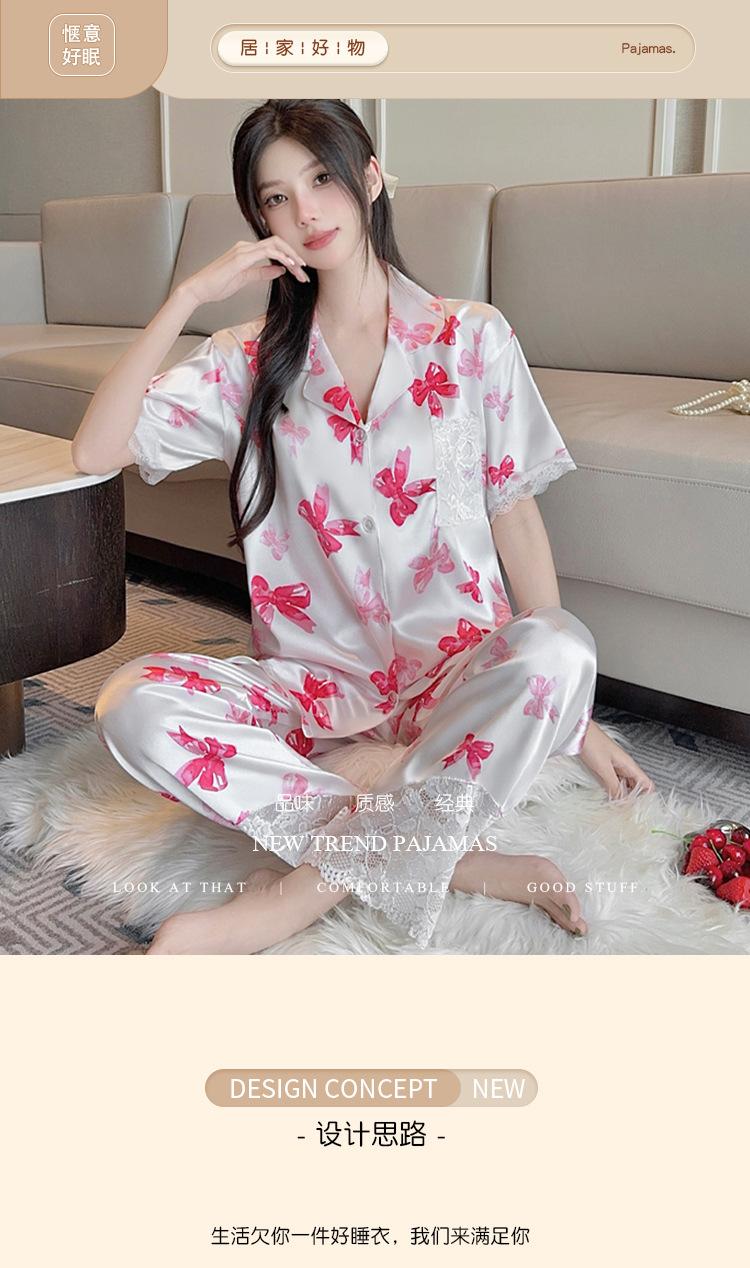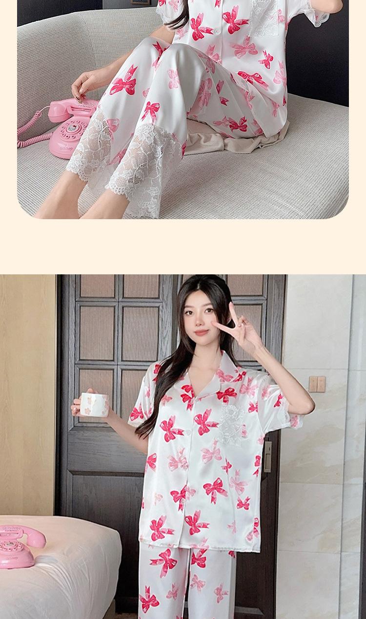 Pijama de Seda de Hielo con Encaje de Lazo Luz de Luna Blanca para Mujer Verano Nuevo Manga Corta Pantalón Ropa Dulce para el Hogar Venta al por Mayor