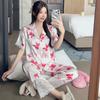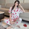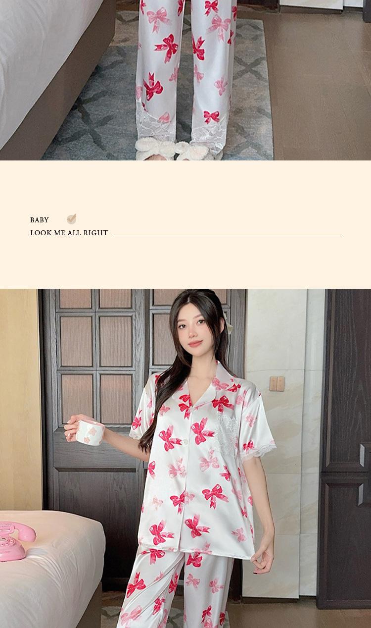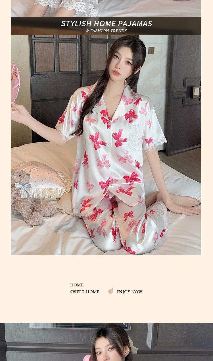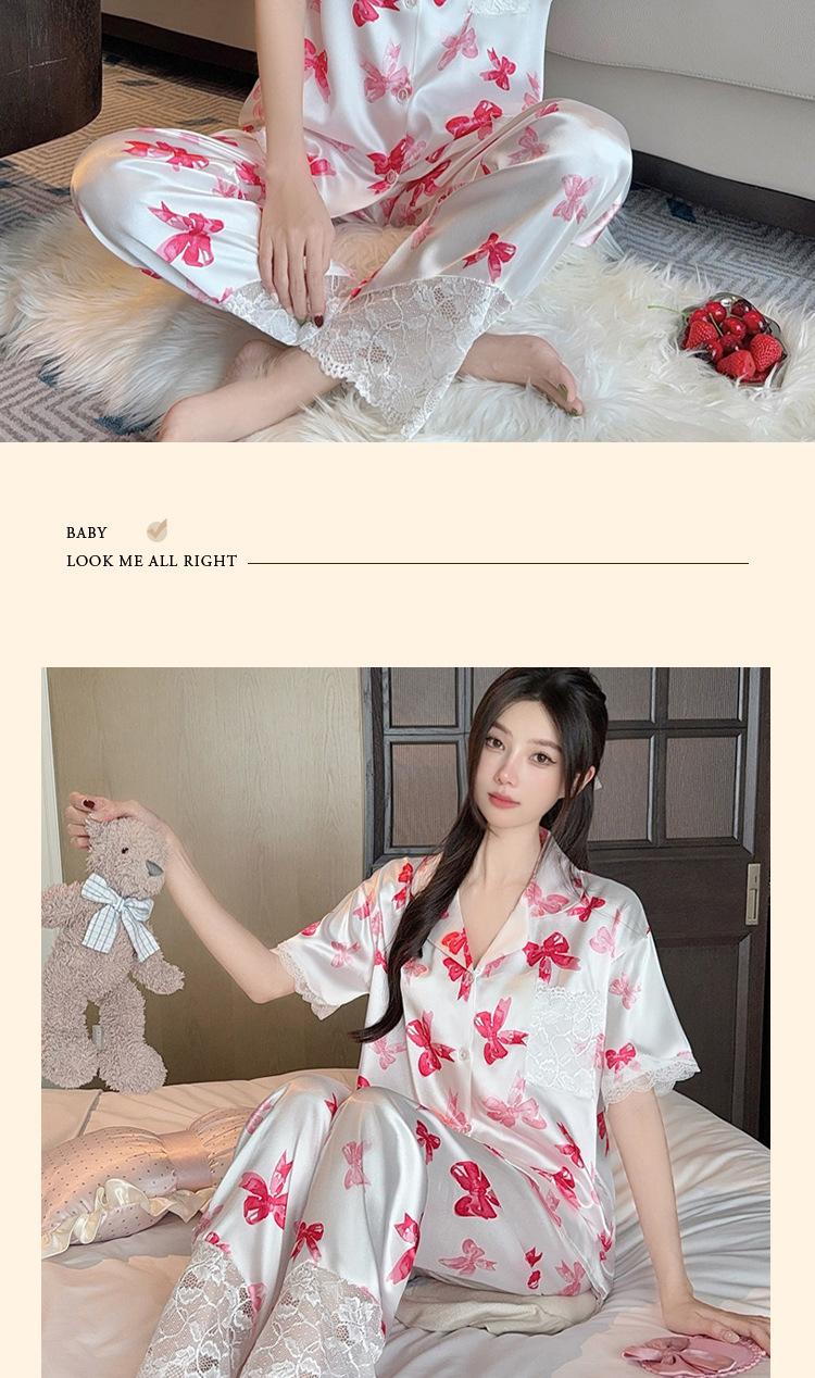 Pijama de Seda de Hielo con Encaje de Lazo Luz de Luna Blanca para Mujer Verano Nuevo Manga Corta Pantalón Ropa Dulce para el Hogar Venta al por Mayor