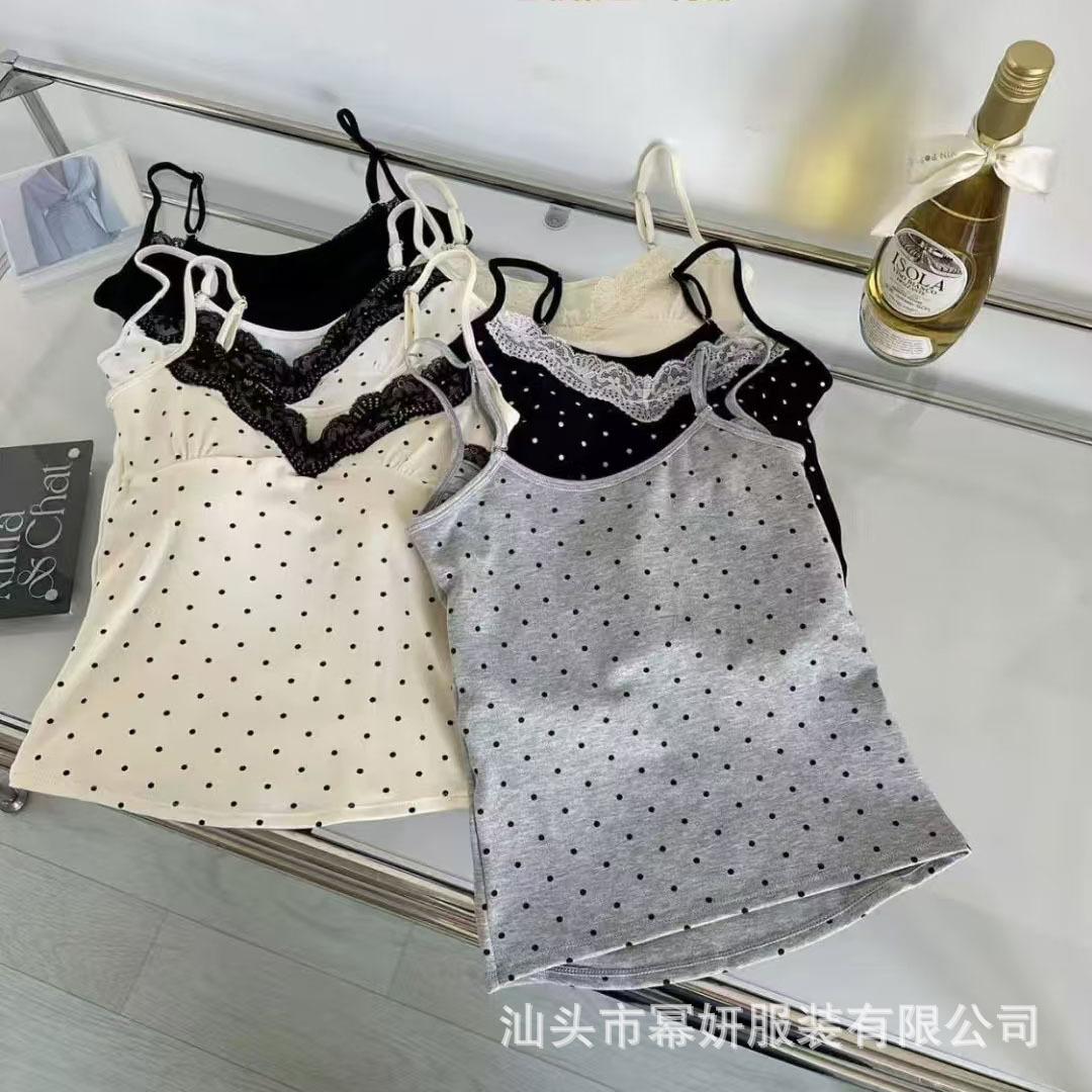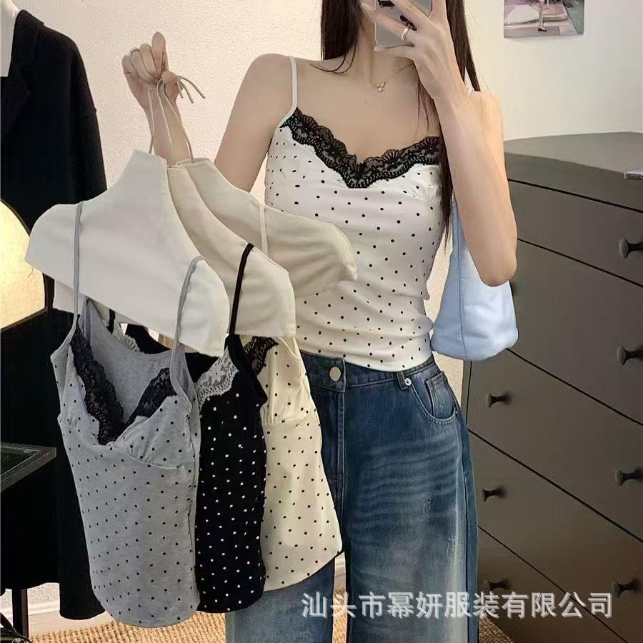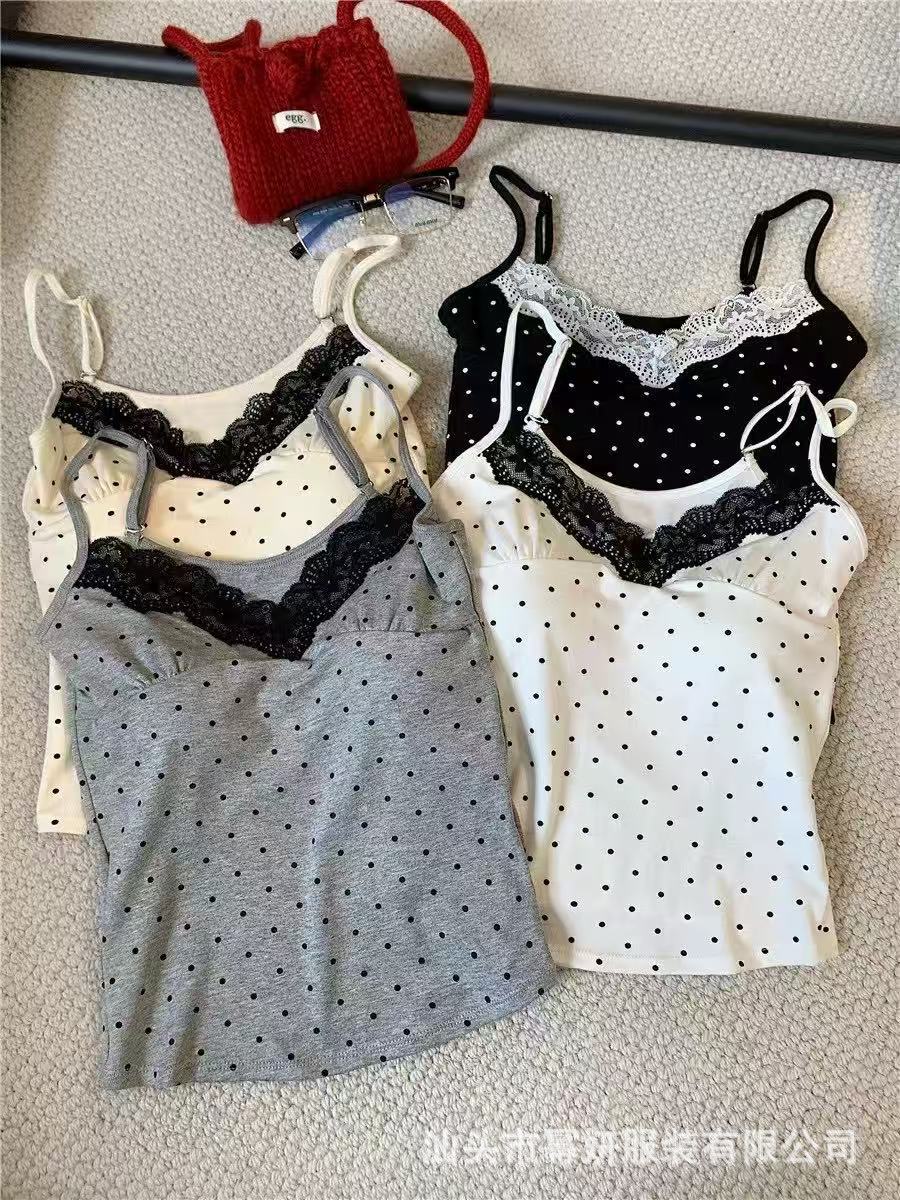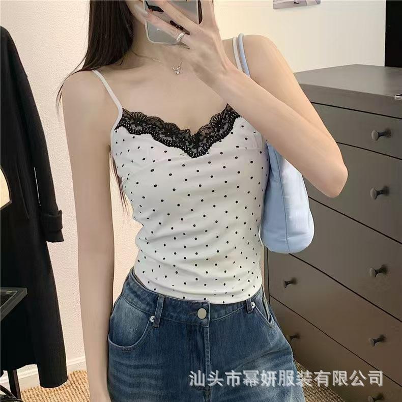 Camisola de encaje de lunares de onda francesa pura para mujer, dulce chica picante, costuras, cuello en V para niña, adelgazante, top combinable