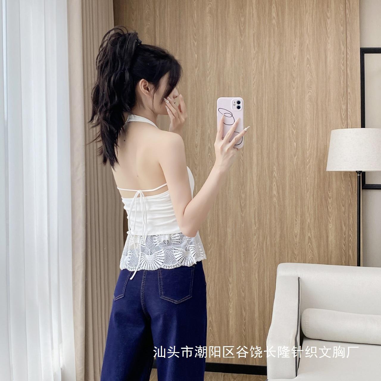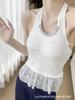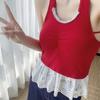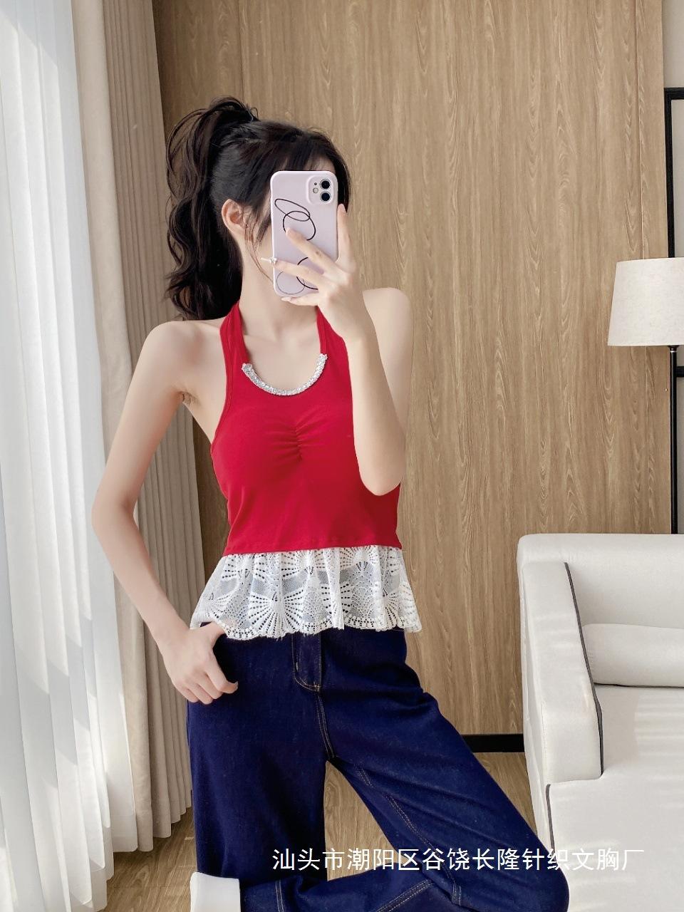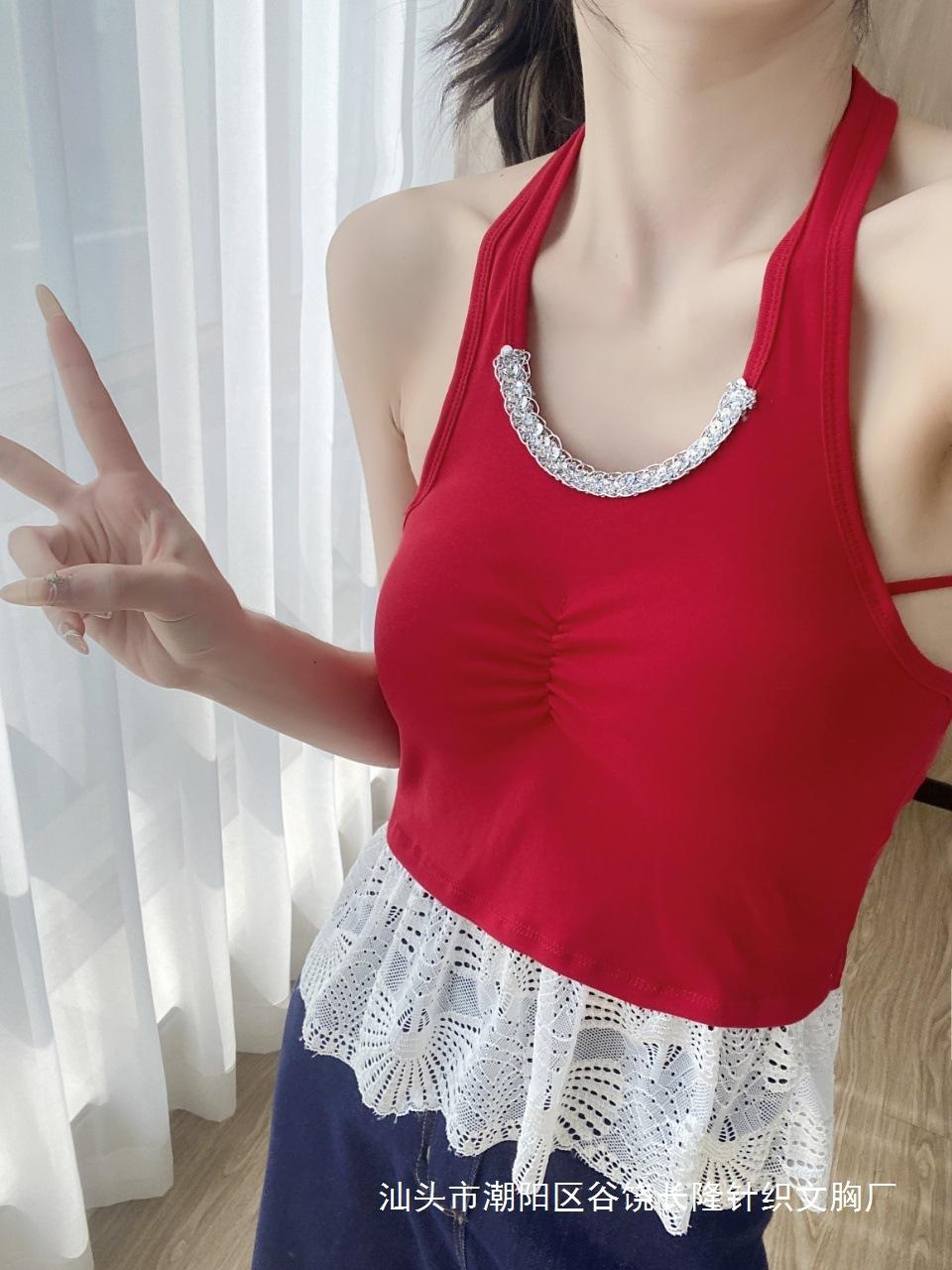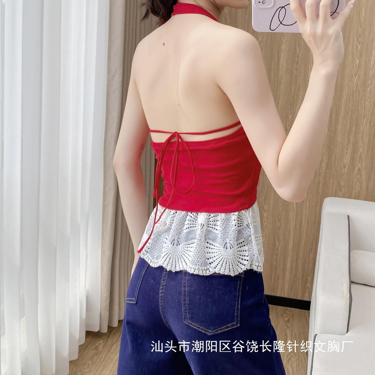 Dulce Vestido Tank Rojo sin Espalda y sin Mangas para Chica Caliente con Lazo, Hermoso Patchwork de Encaje en la Espalda, Cubre el Abdomen, con Copas en el Pecho, Top Halter