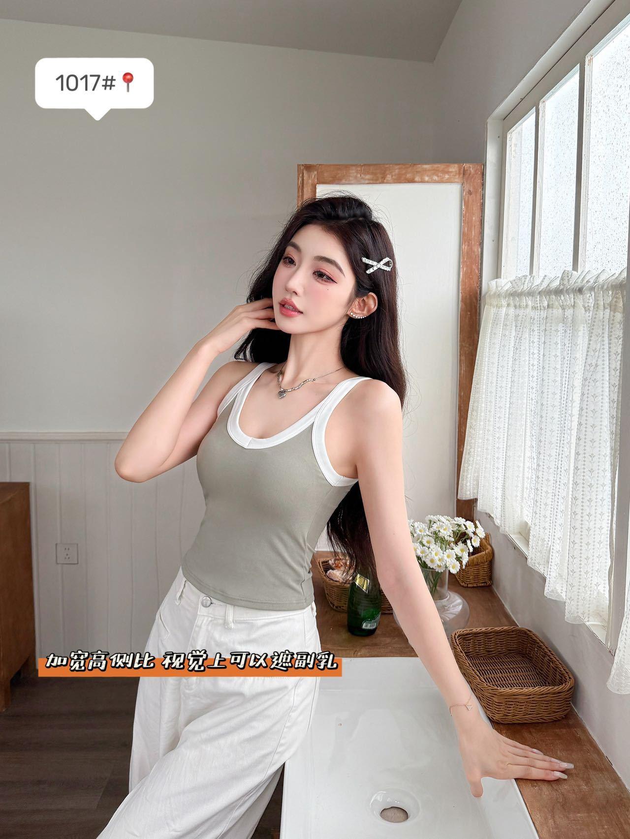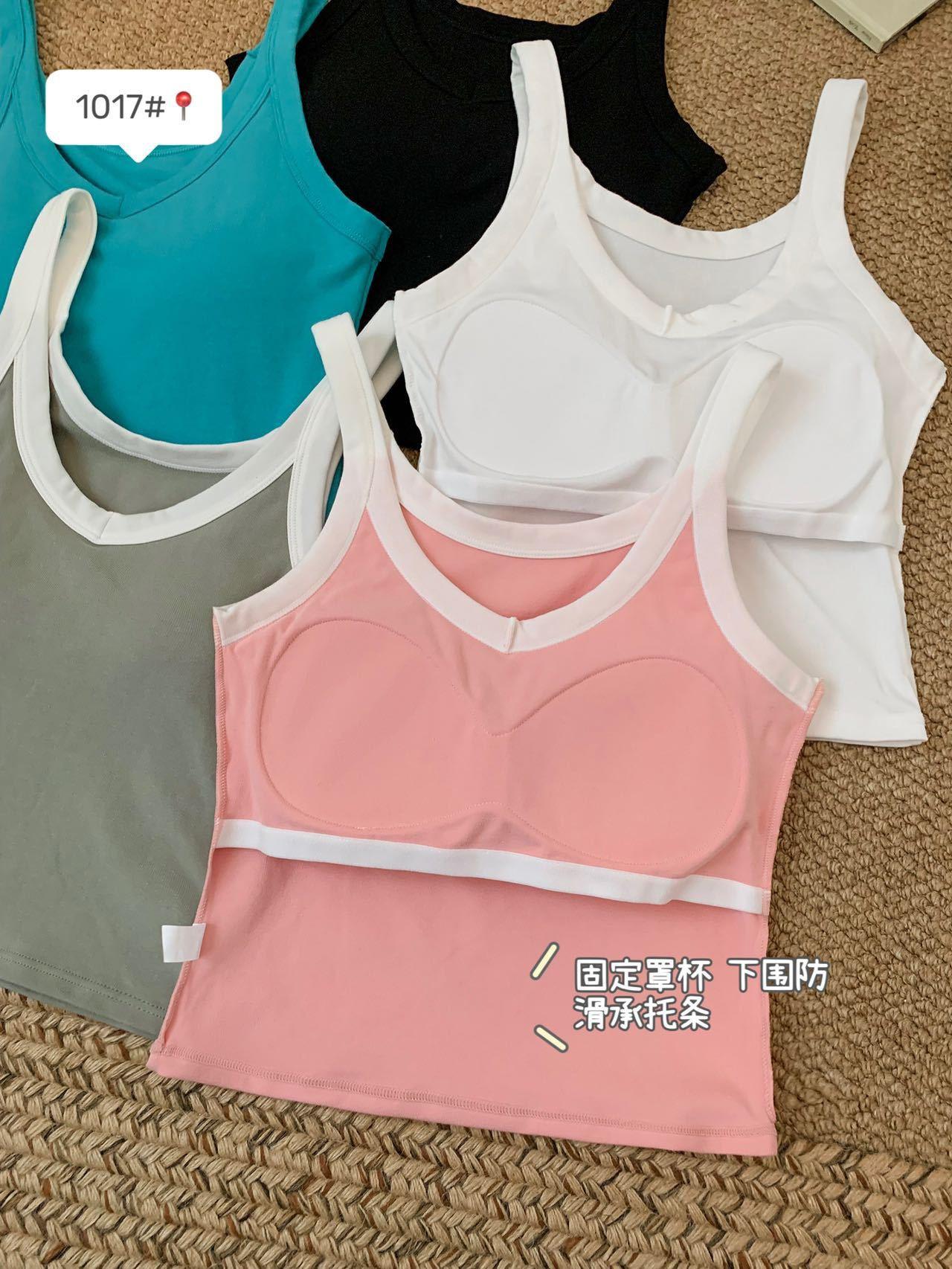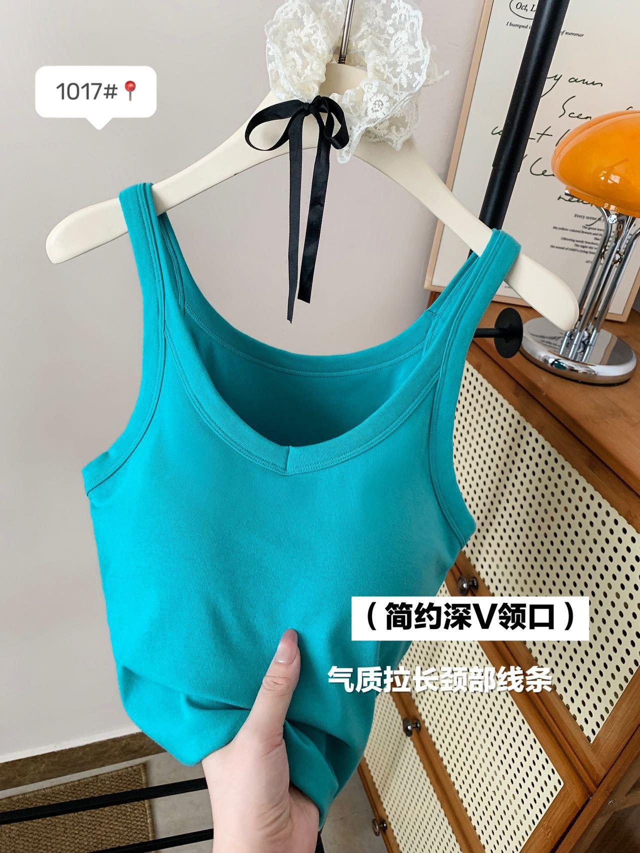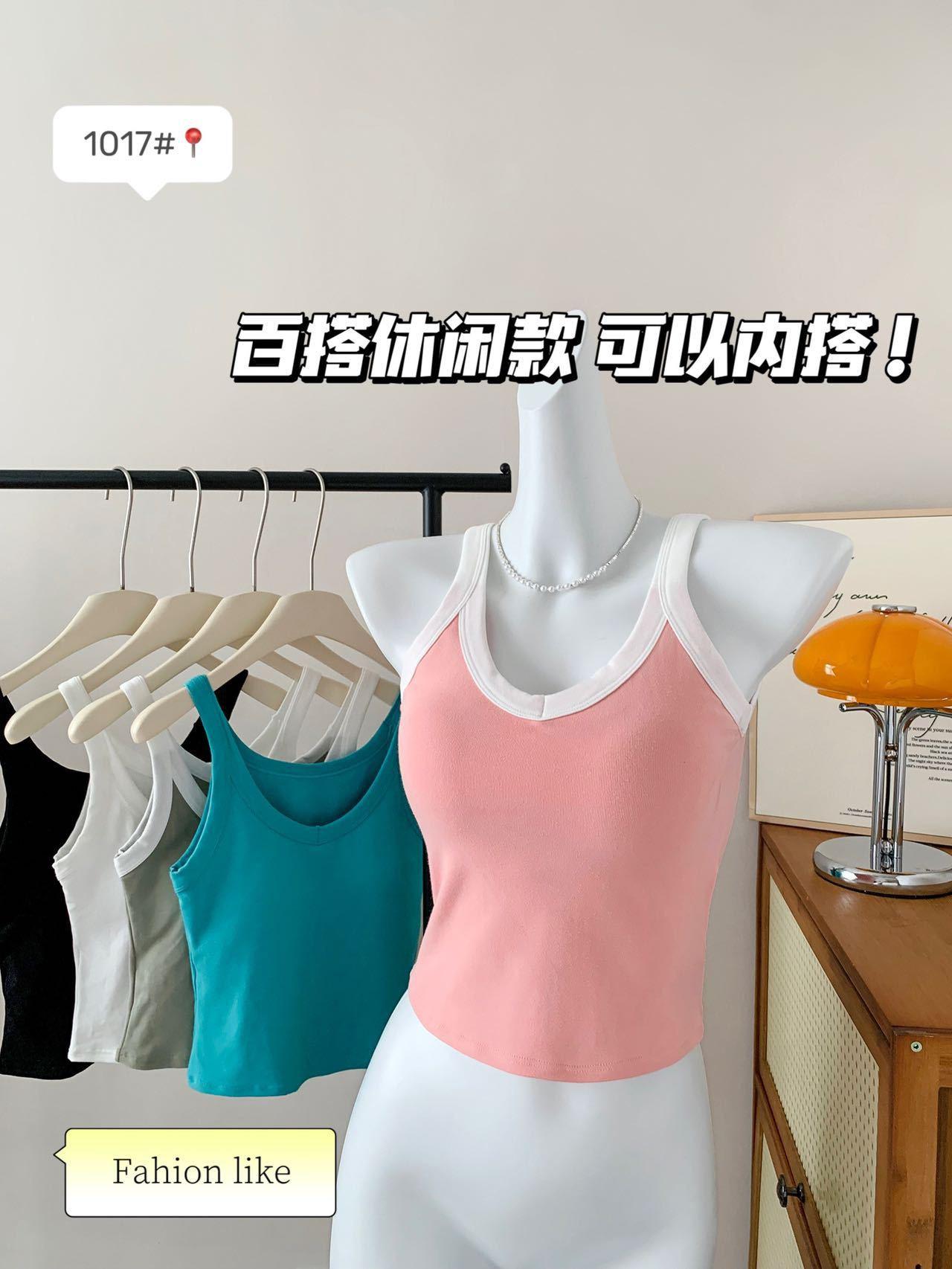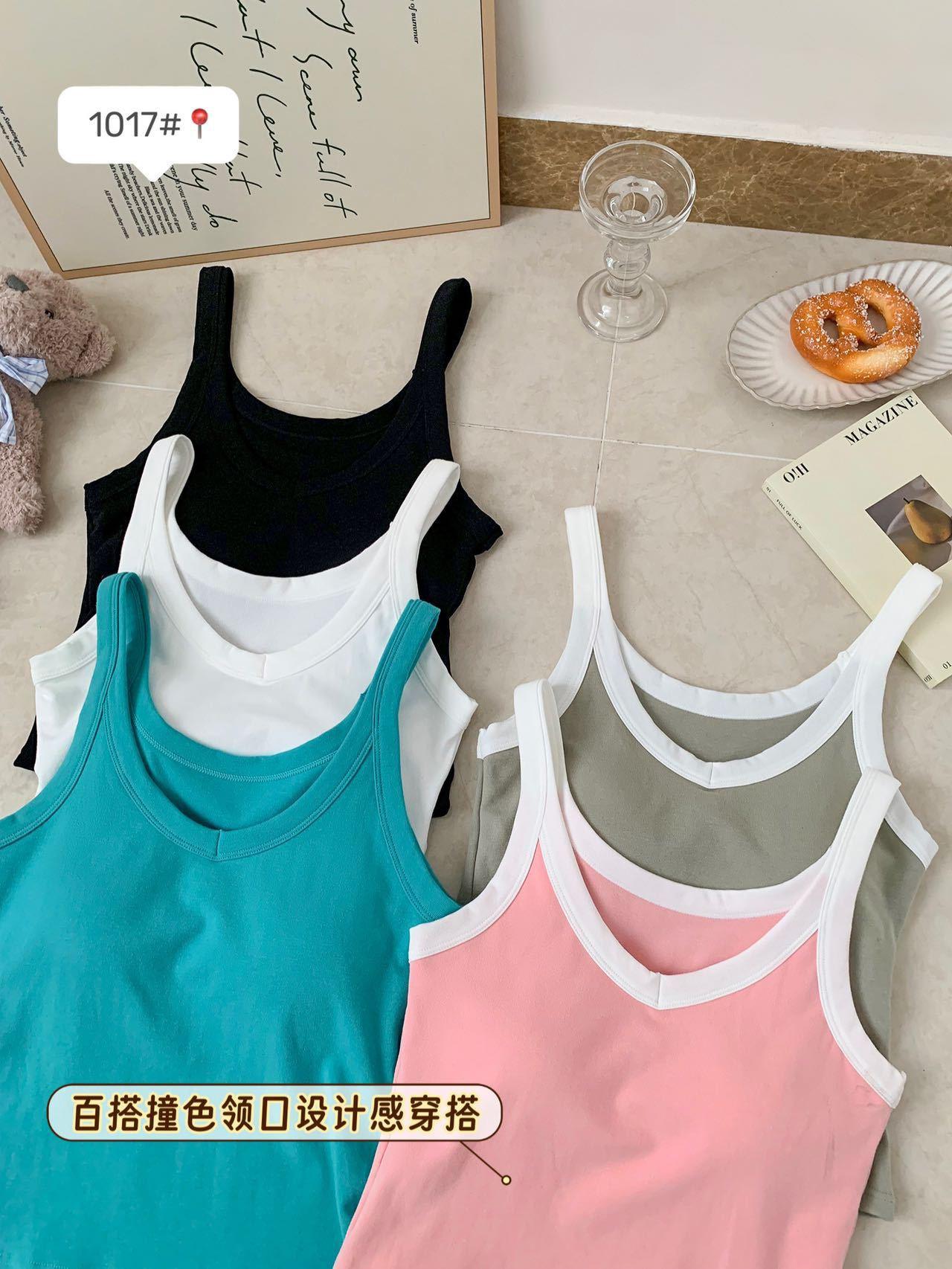1017 # Camisola de Algodón Puro a Contraste con Almohadillas en el Busto para Mujer para Usar por Fuera y por Dentro con Ombligo Descubierto Look Adelgazante Cuello en V Hermosa Espalda Top