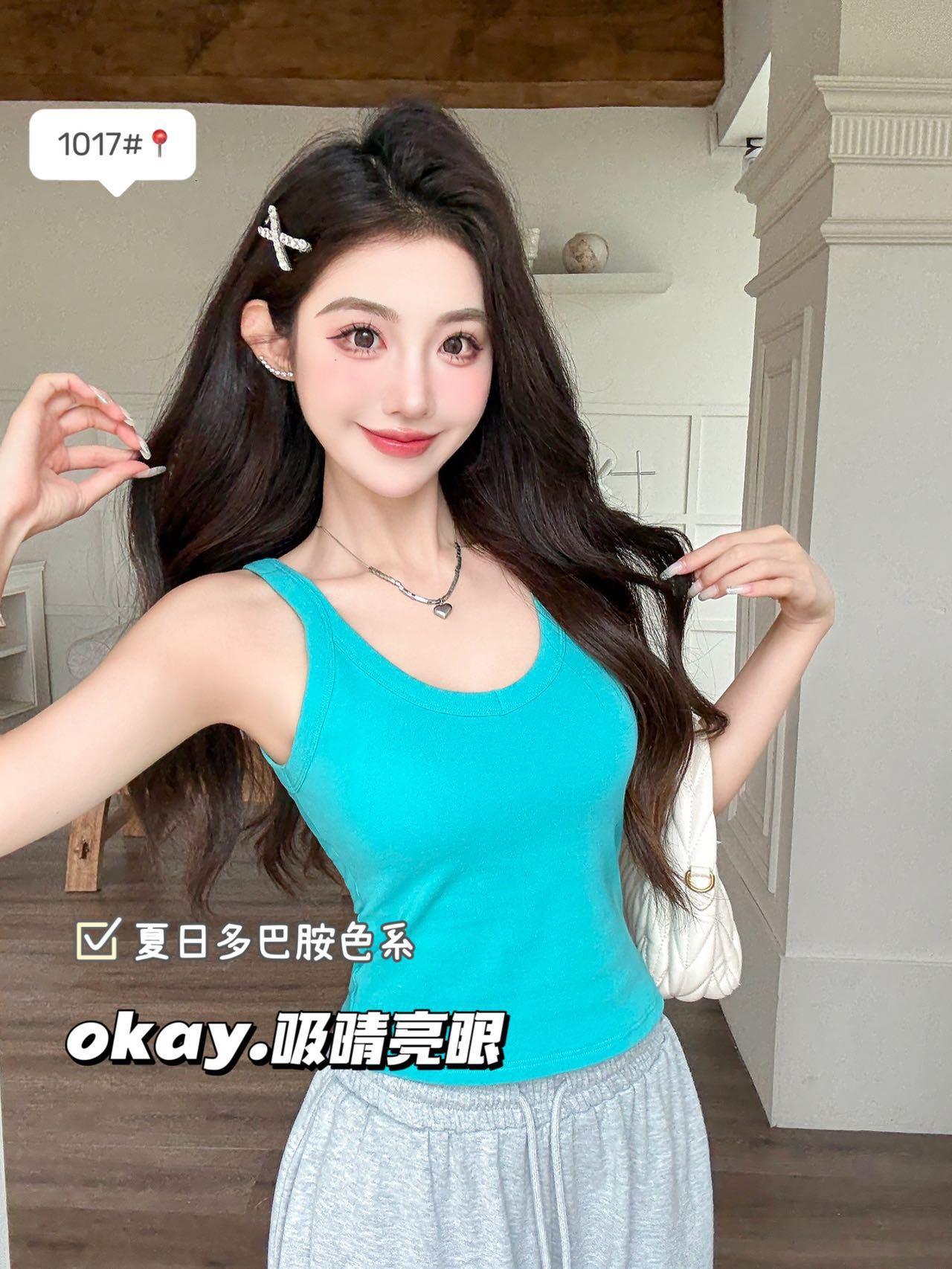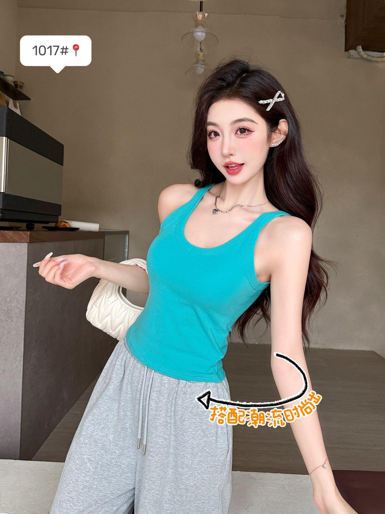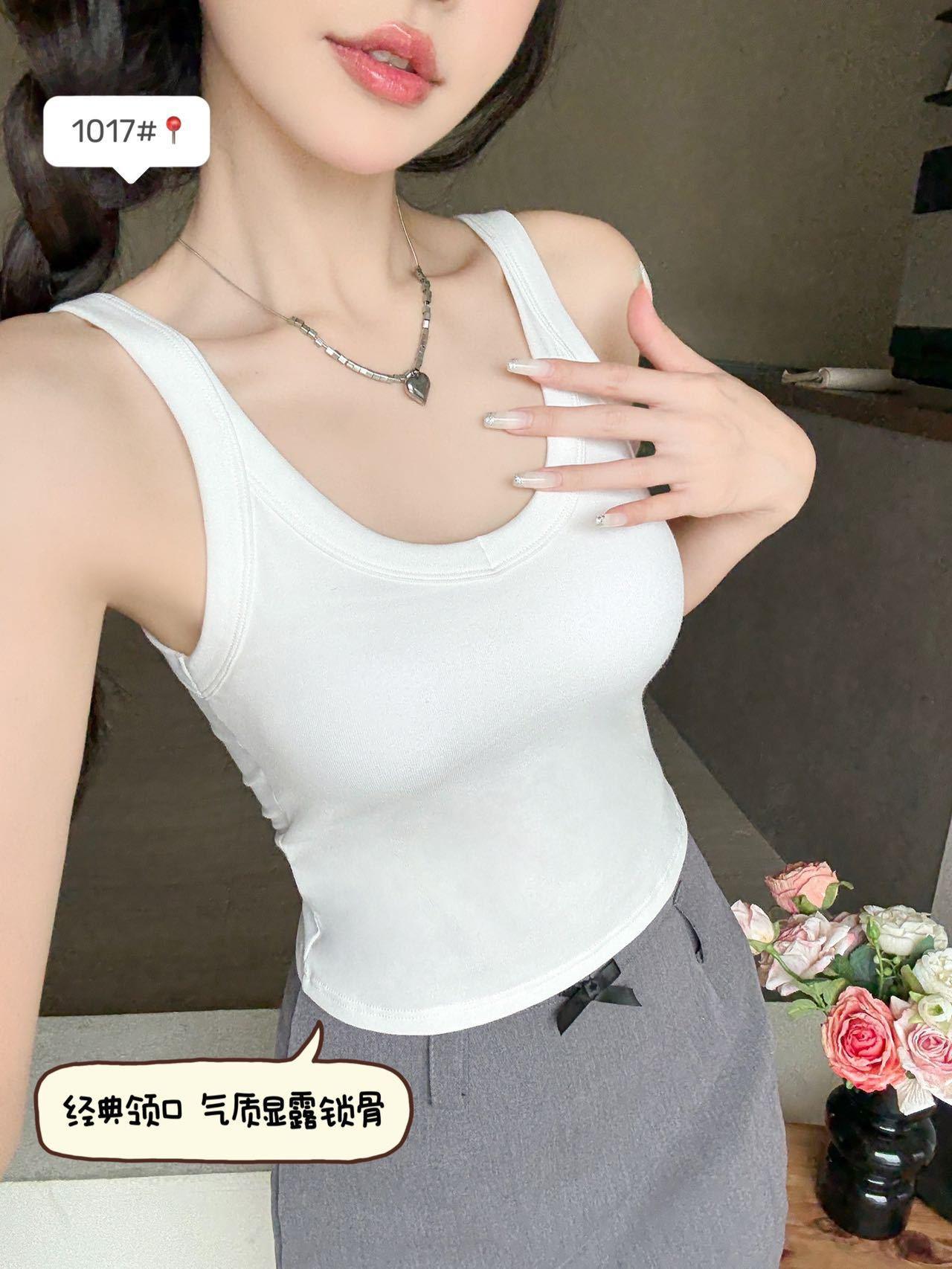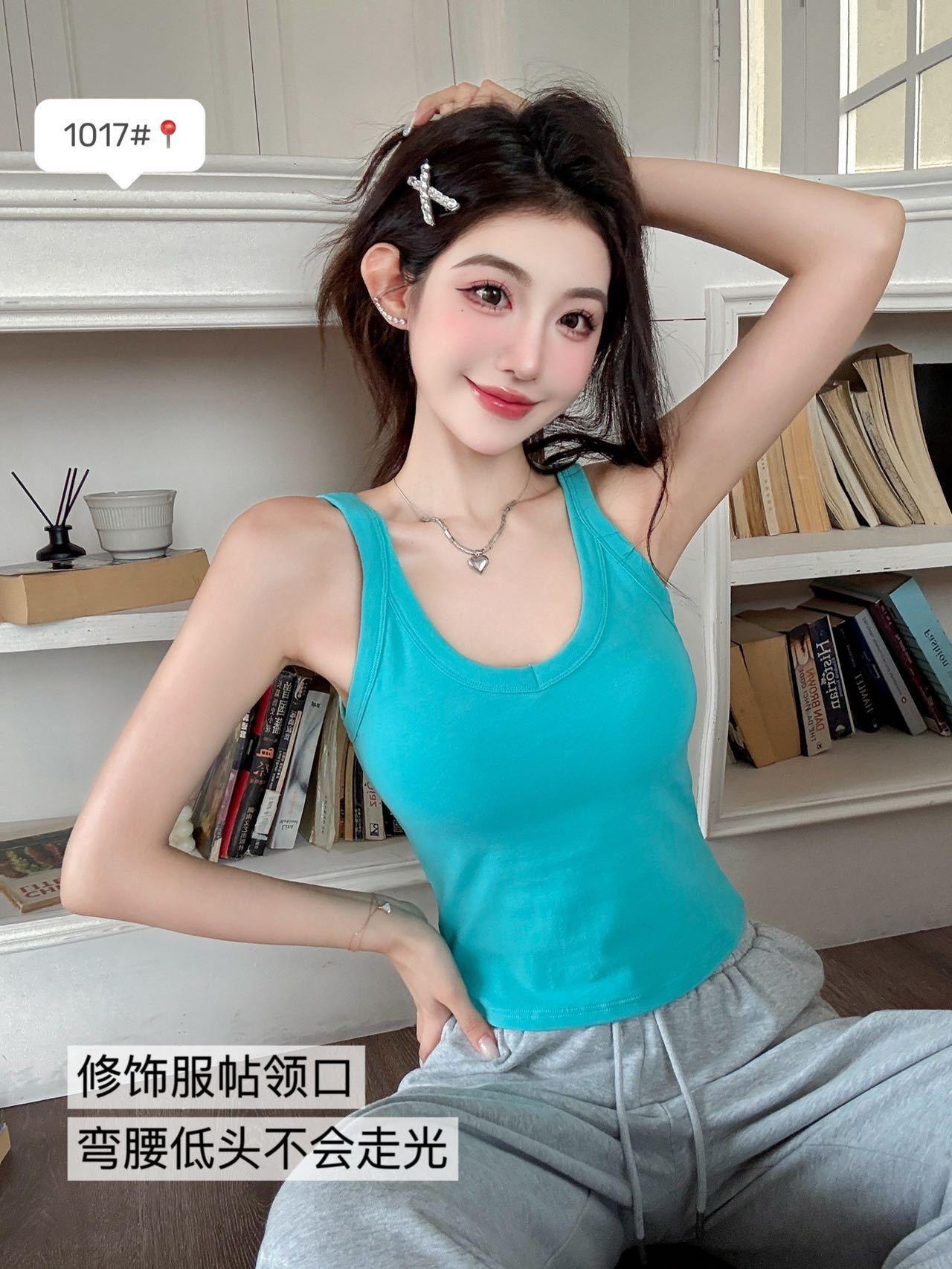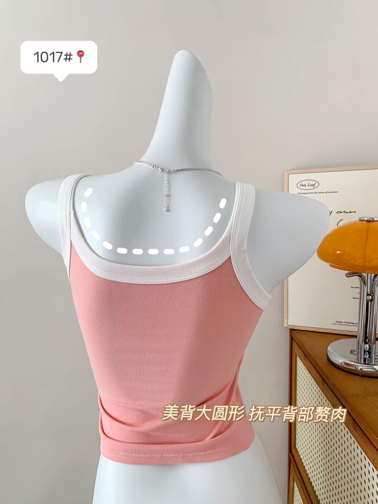 1017 # Camisola de Algodón Puro a Contraste con Almohadillas en el Busto para Mujer para Usar por Fuera y por Dentro con Ombligo Descubierto Look Adelgazante Cuello en V Hermosa Espalda Top