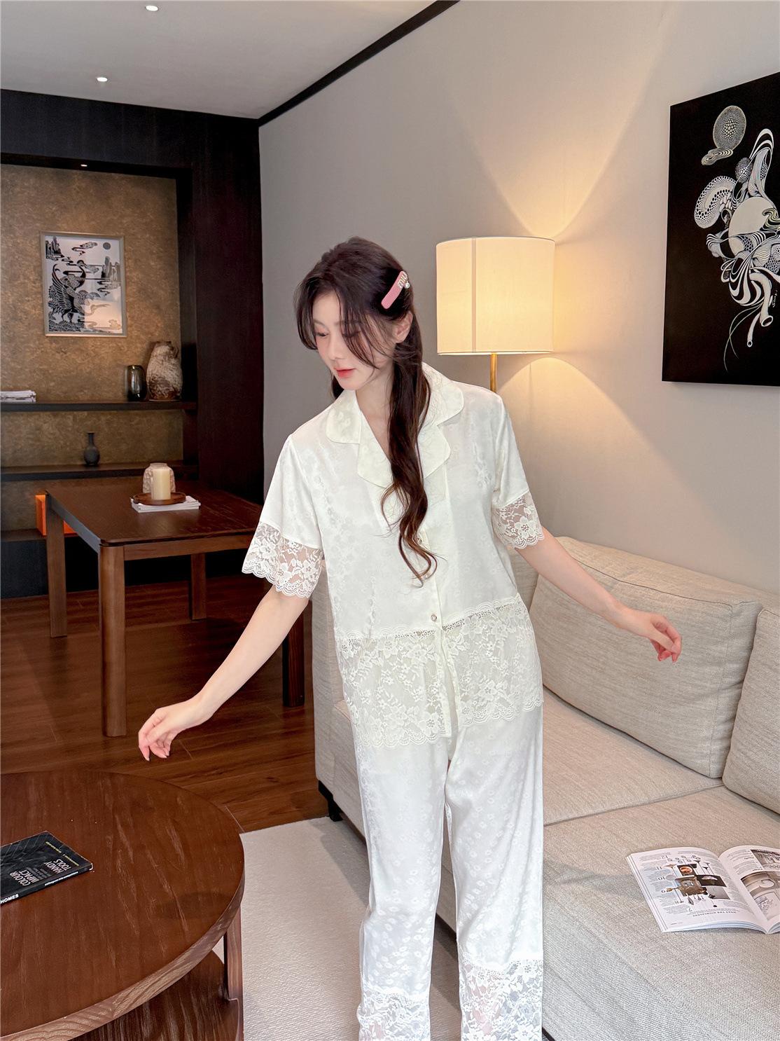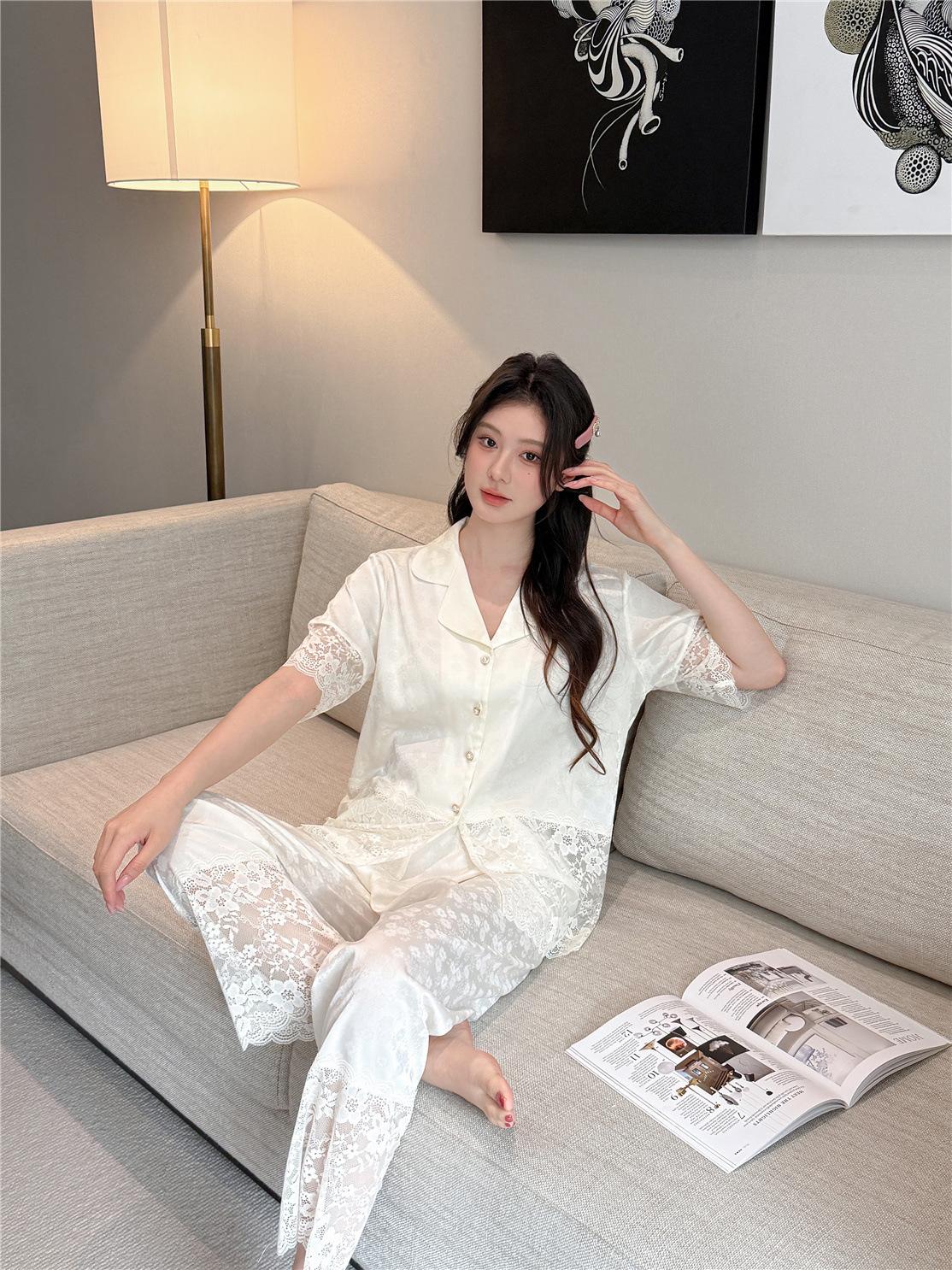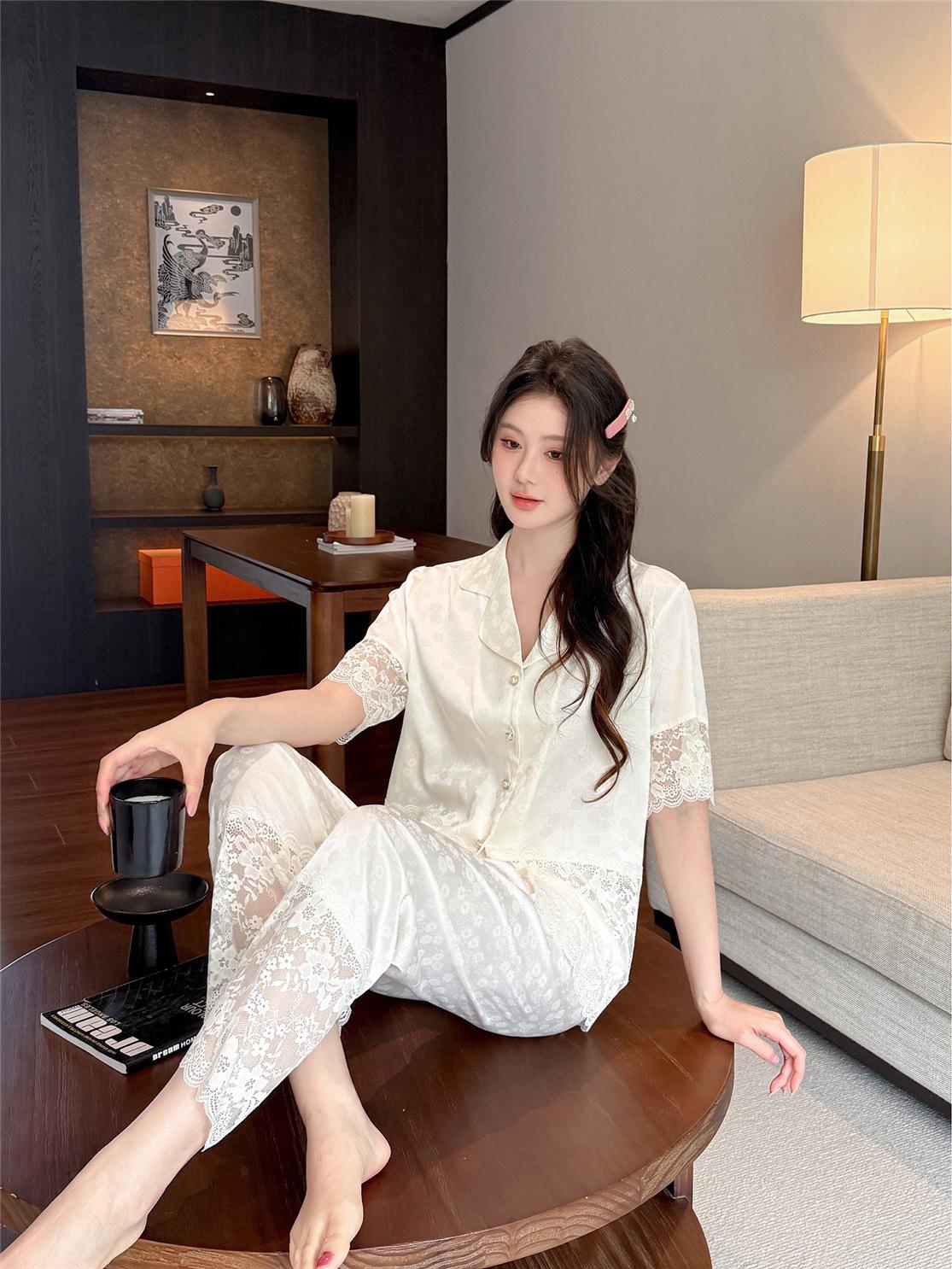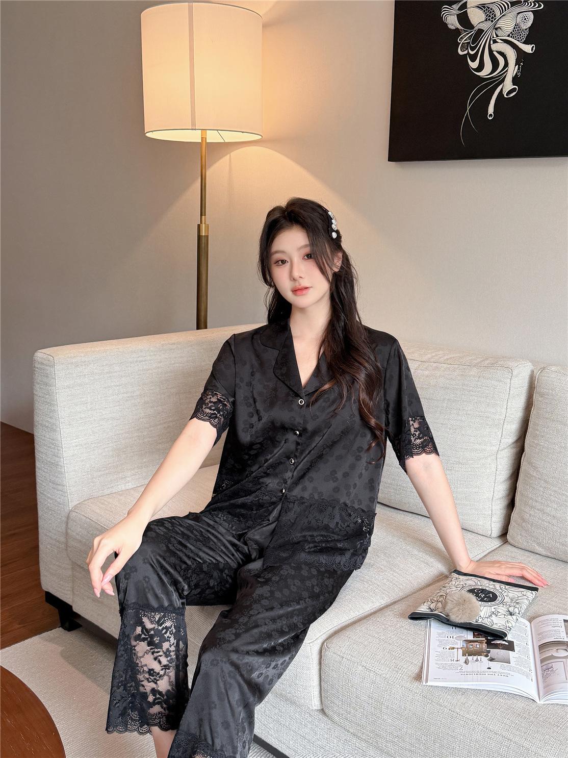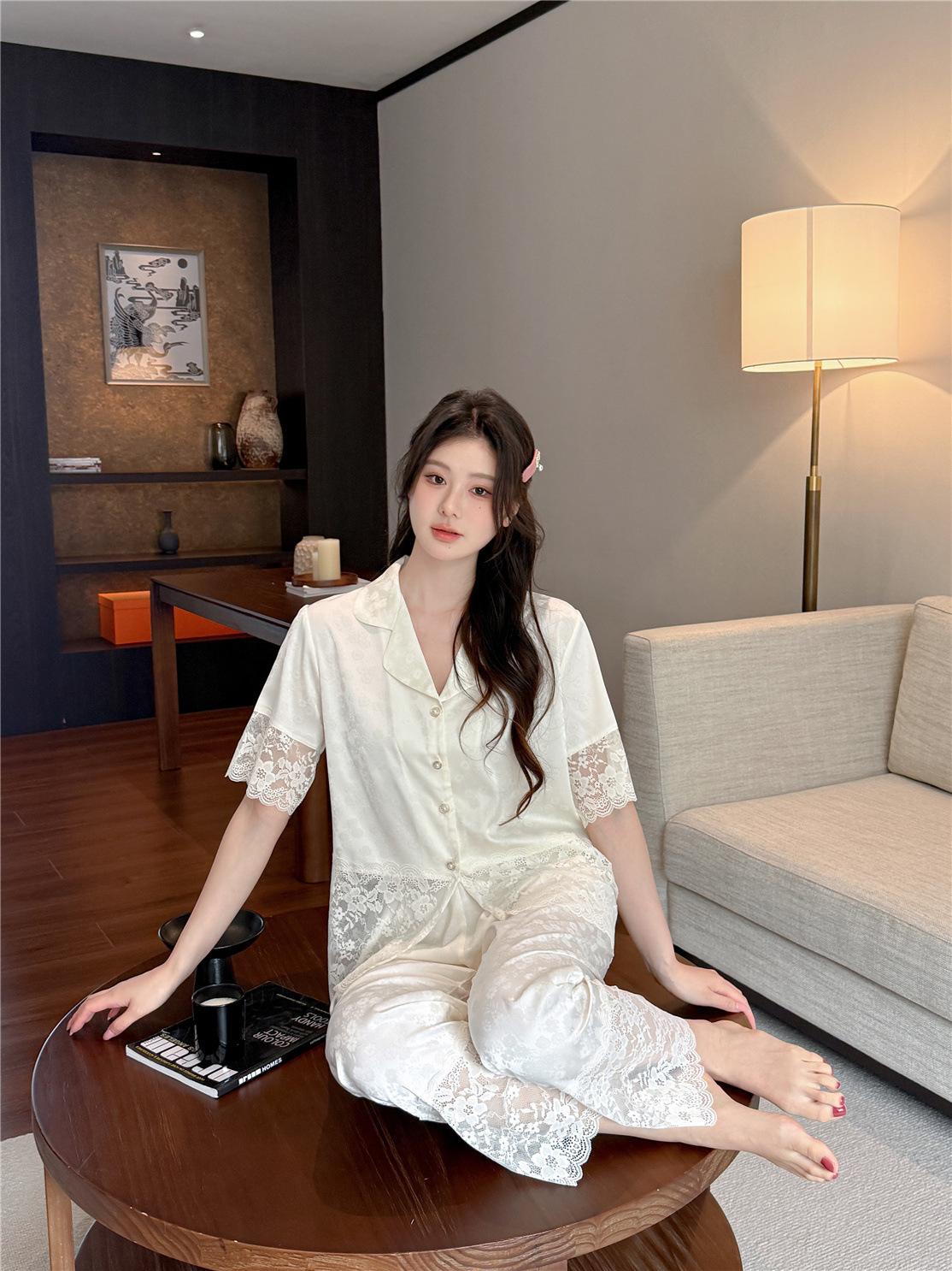 Pijama para Mujer Seda de Hielo Verano Nuevo Sexy Encaje Empalmado Pantalones Manga Corta Conjunto de Dos Piezas Seda de Hielo y Nieve Conjunto para Estar en Casa