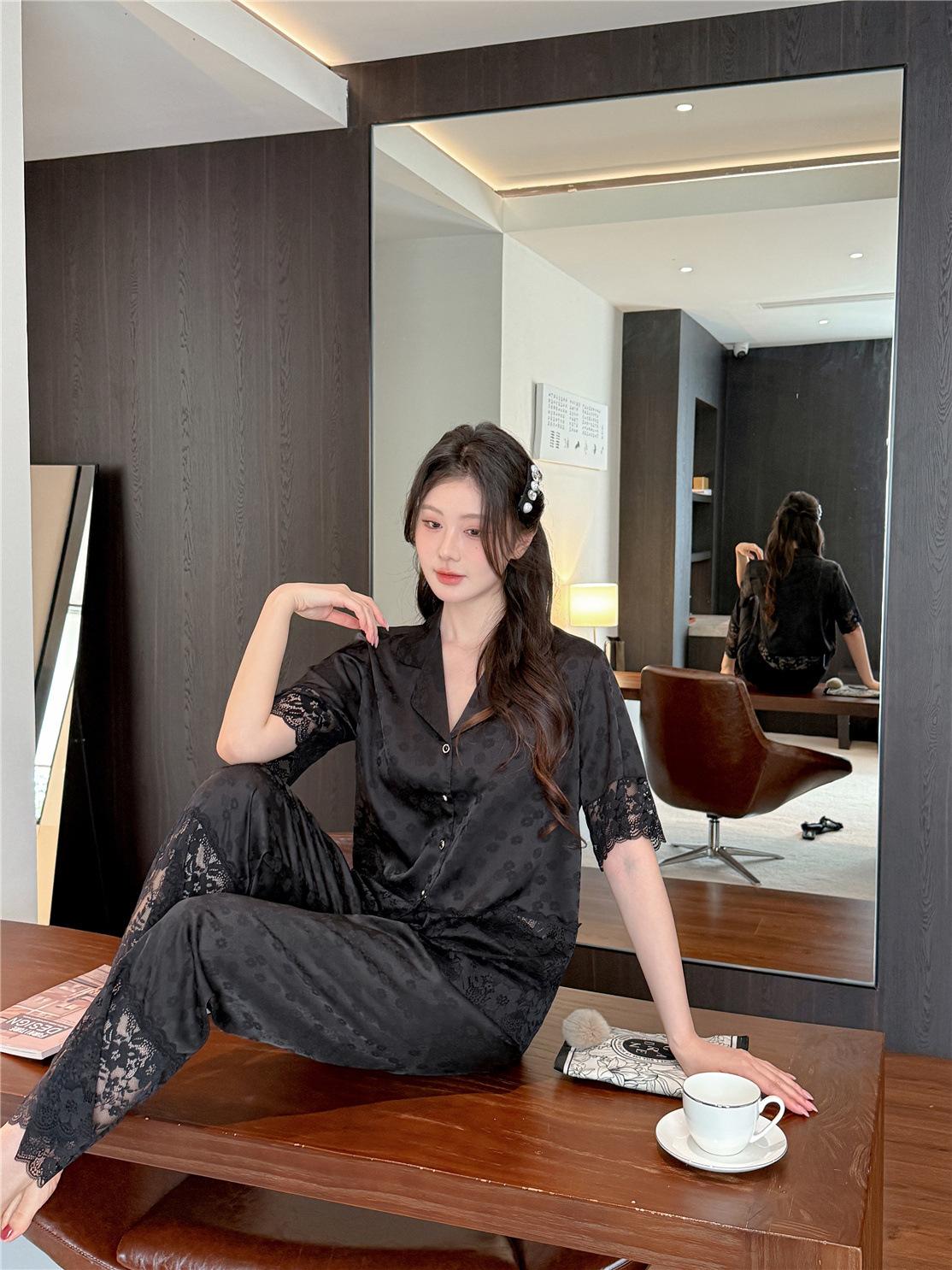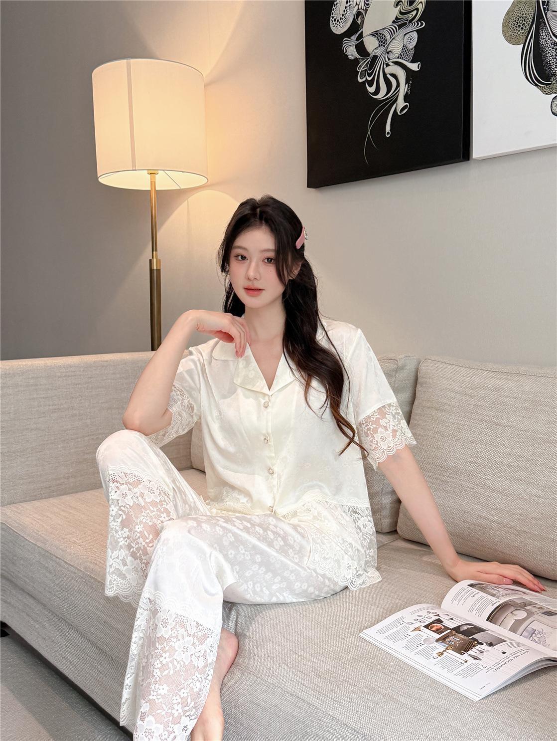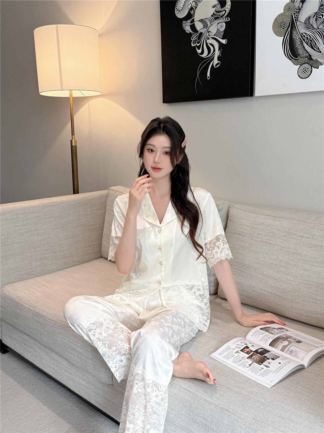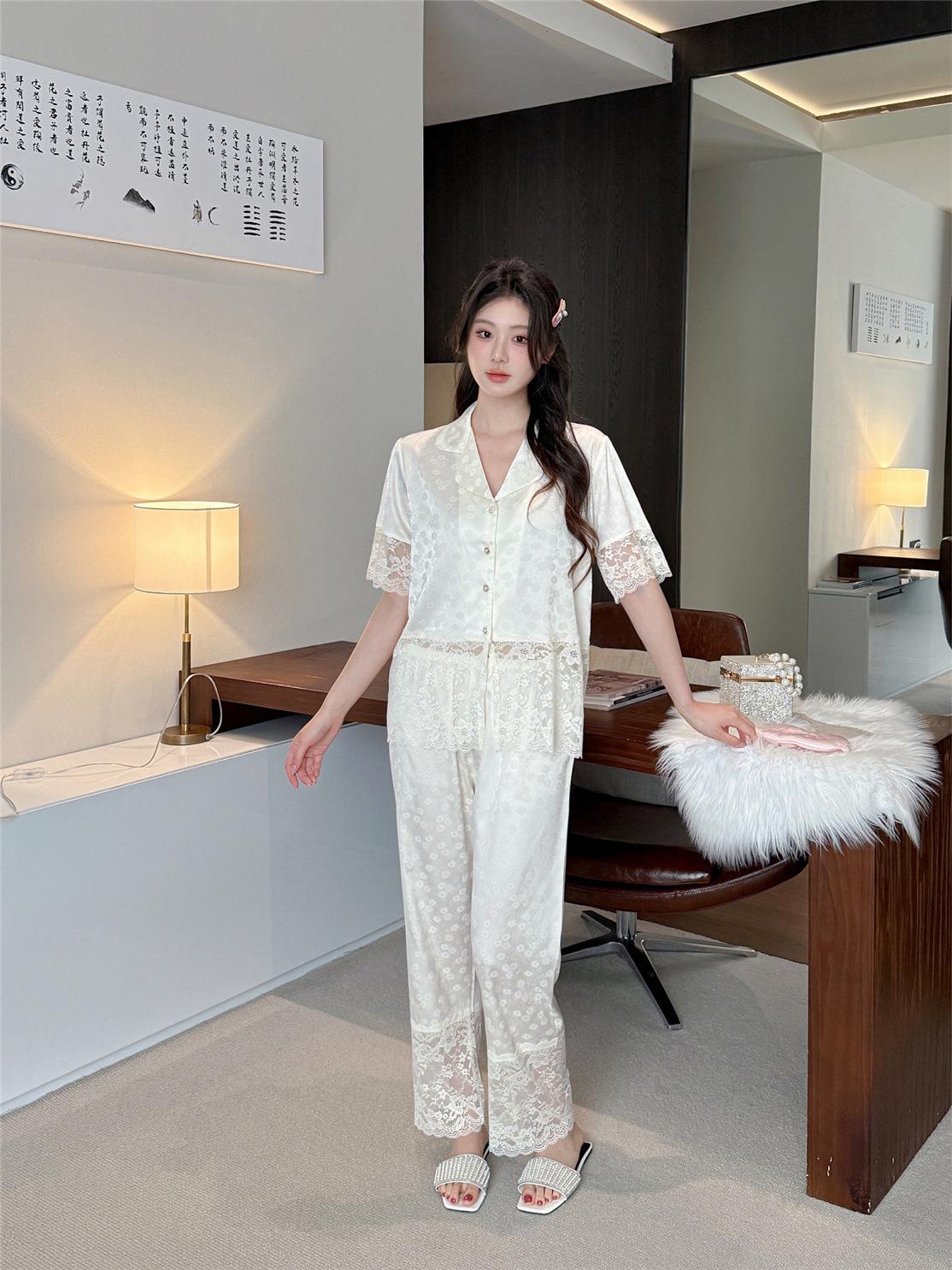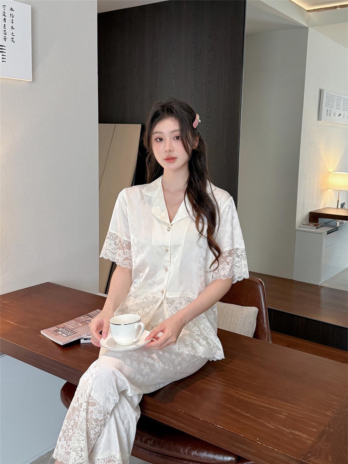 Pijama para Mujer Seda de Hielo Verano Nuevo Sexy Encaje Empalmado Pantalones Manga Corta Conjunto de Dos Piezas Seda de Hielo y Nieve Conjunto para Estar en Casa