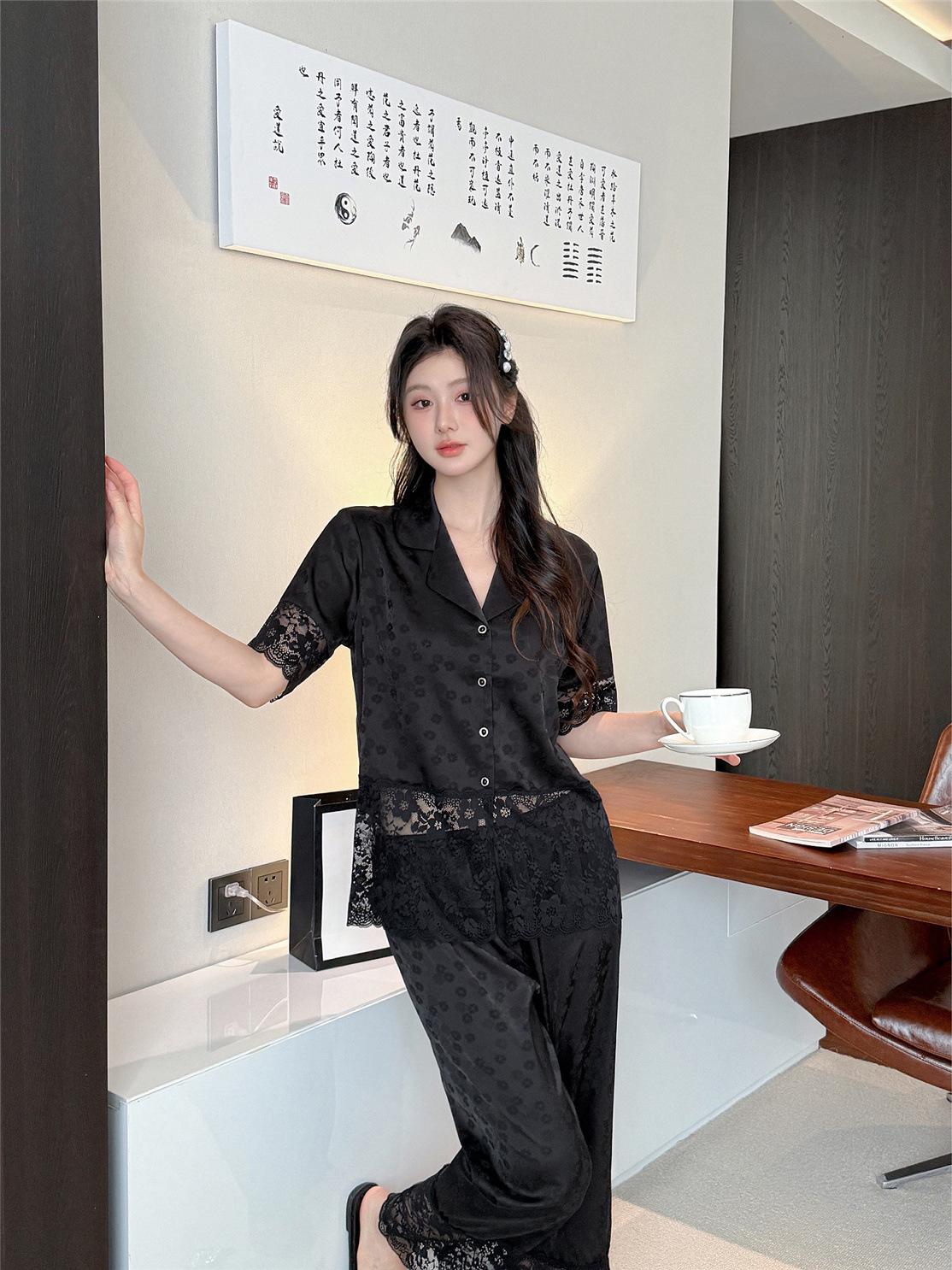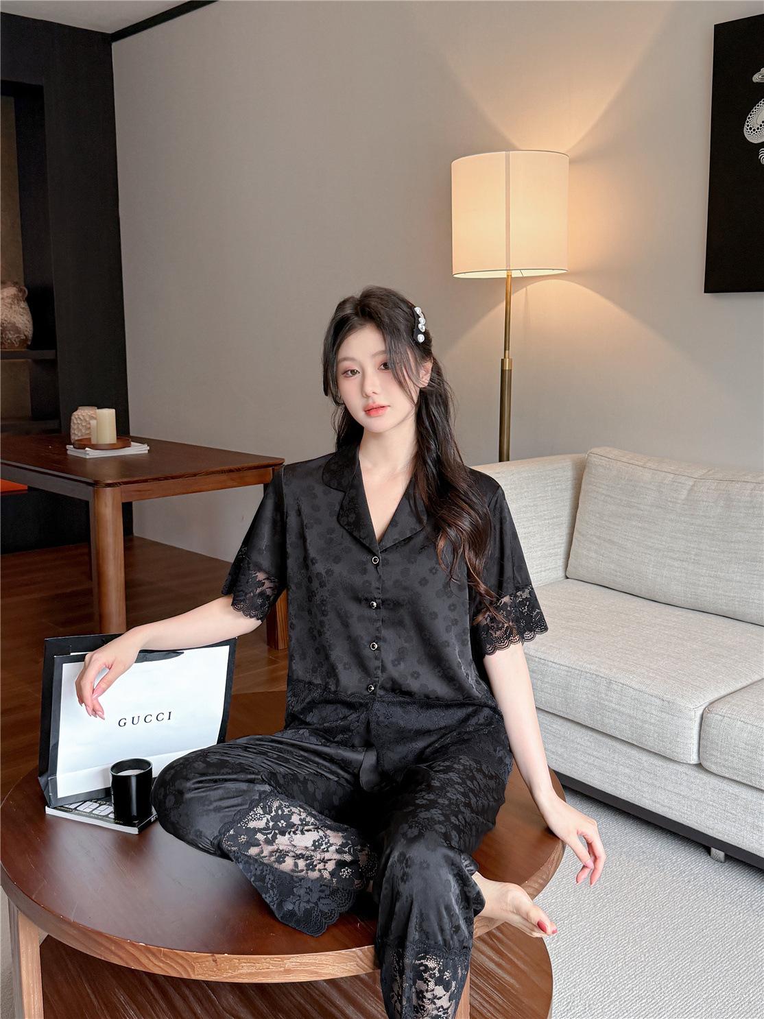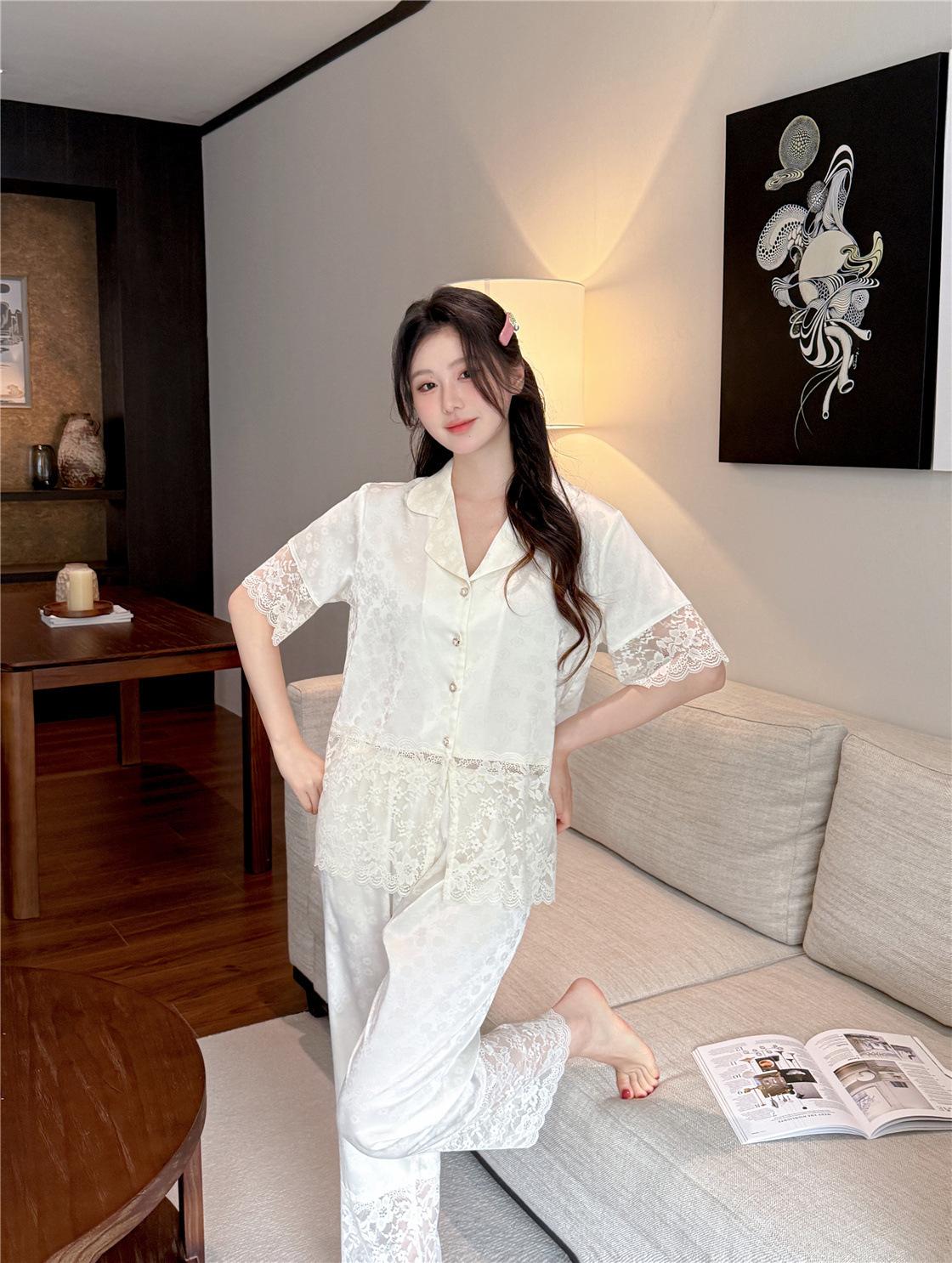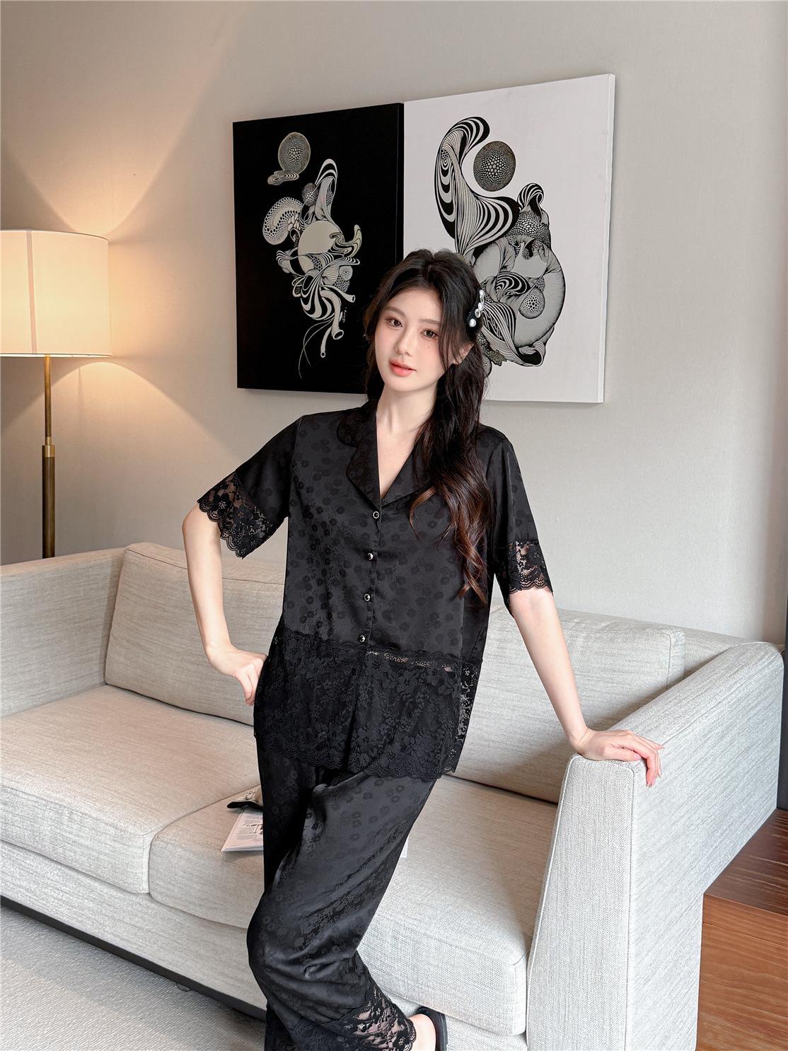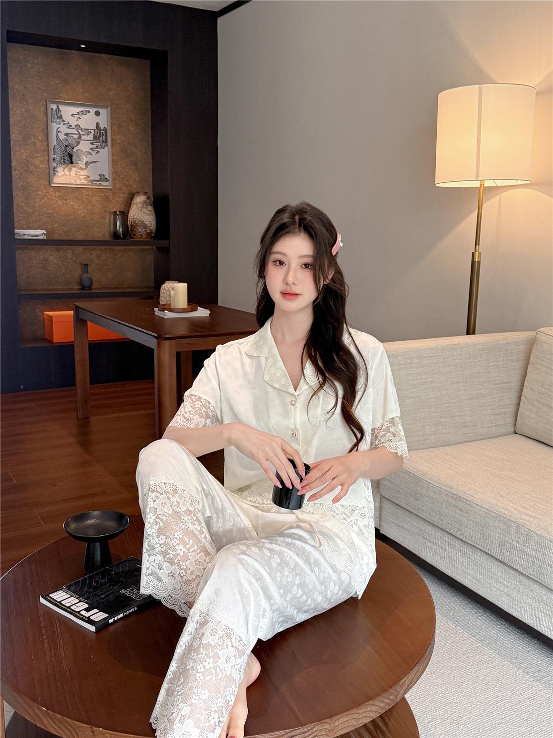 Pijama para Mujer Seda de Hielo Verano Nuevo Sexy Encaje Empalmado Pantalones Manga Corta Conjunto de Dos Piezas Seda de Hielo y Nieve Conjunto para Estar en Casa