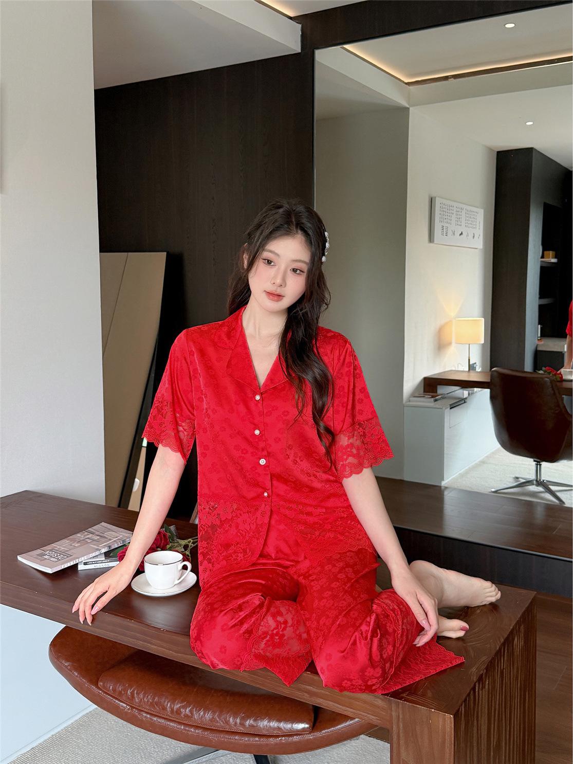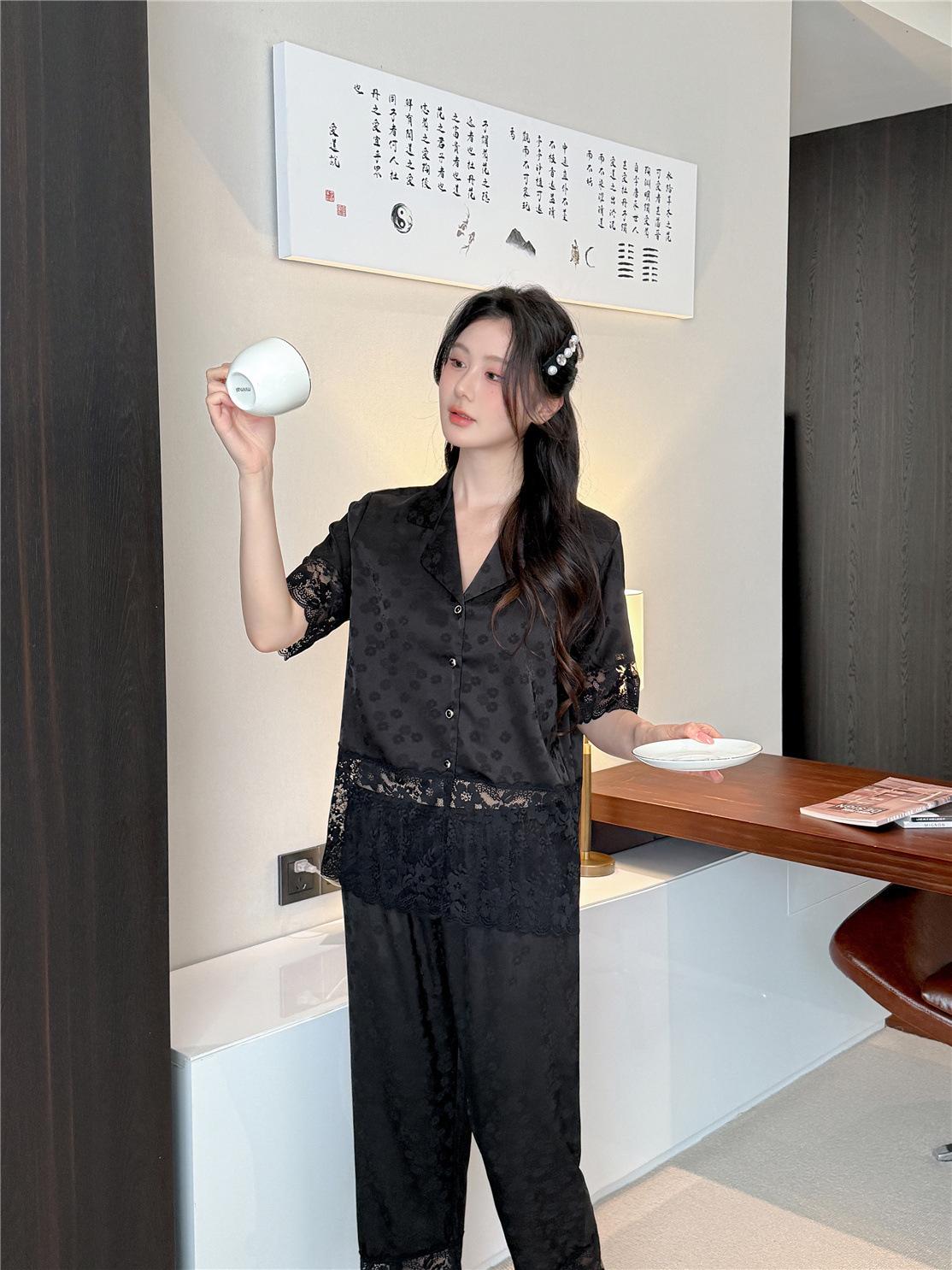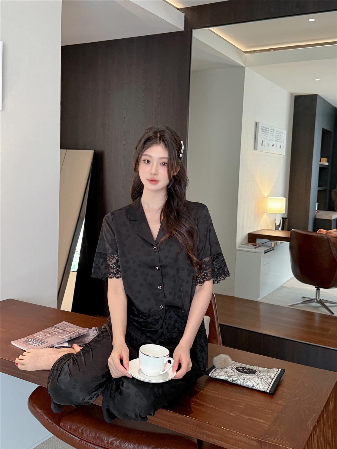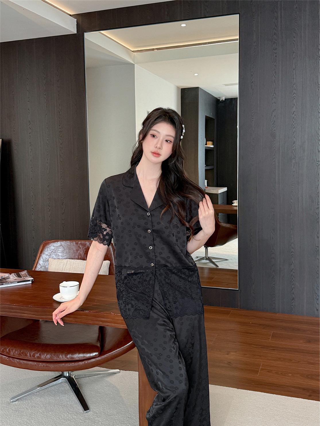 Pijama para Mujer Seda de Hielo Verano Nuevo Sexy Encaje Empalmado Pantalones Manga Corta Conjunto de Dos Piezas Seda de Hielo y Nieve Conjunto para Estar en Casa