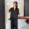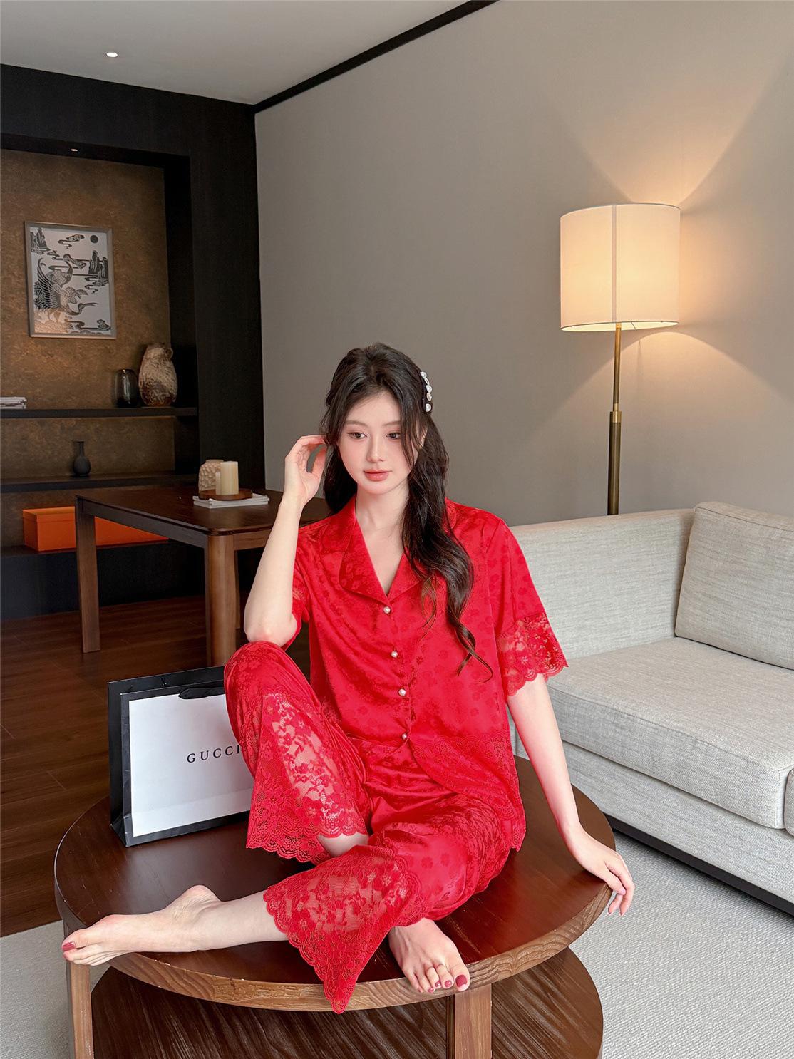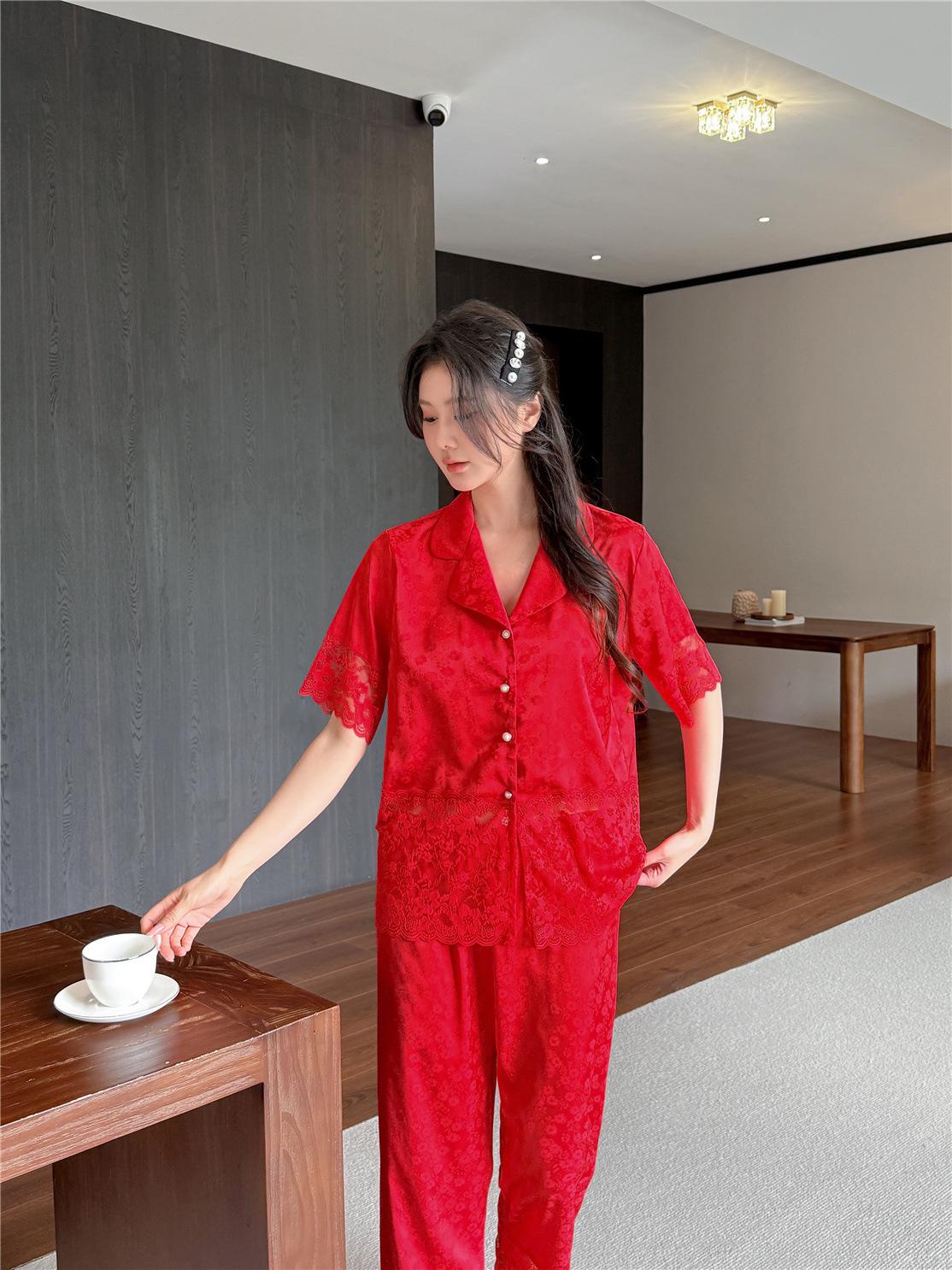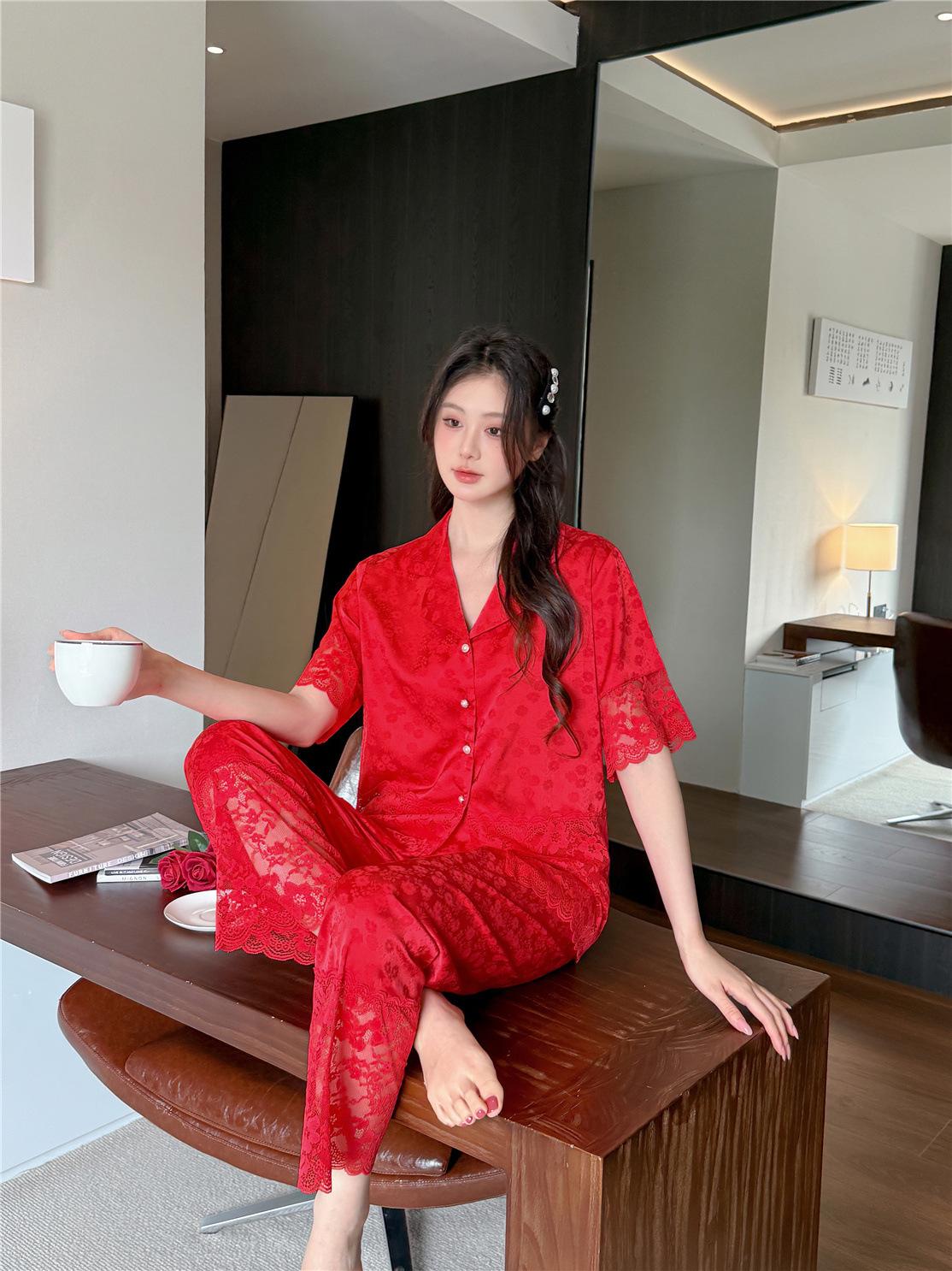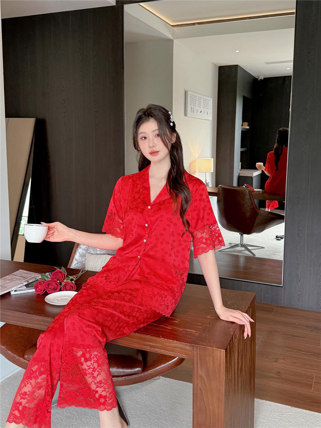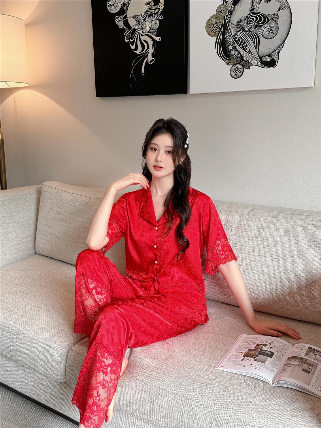 Pijama para Mujer Seda de Hielo Verano Nuevo Sexy Encaje Empalmado Pantalones Manga Corta Conjunto de Dos Piezas Seda de Hielo y Nieve Conjunto para Estar en Casa