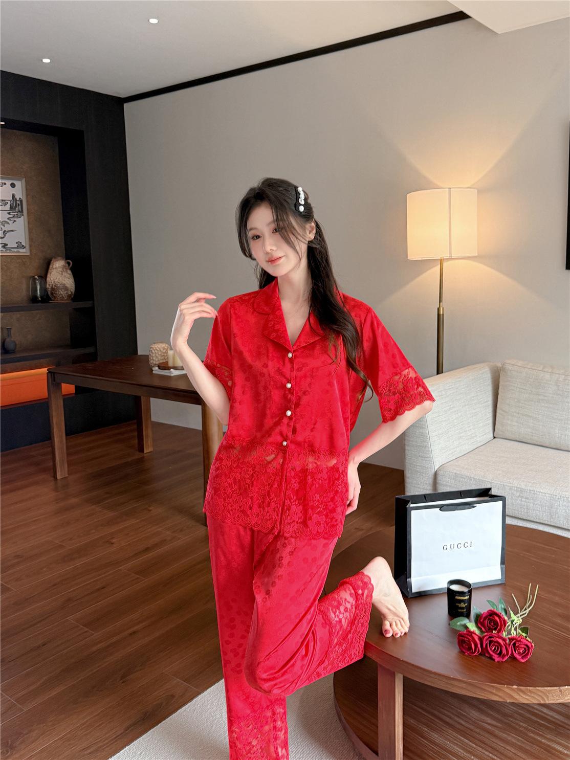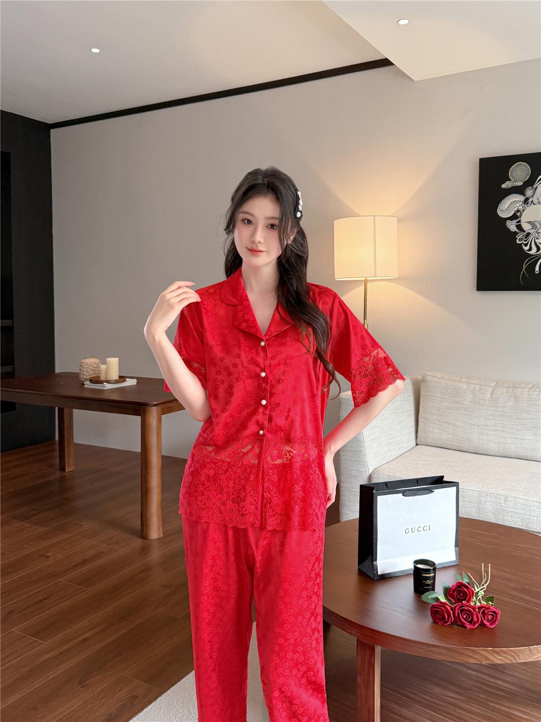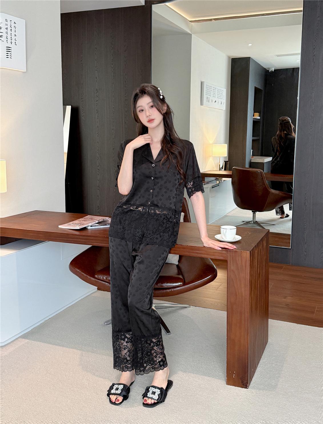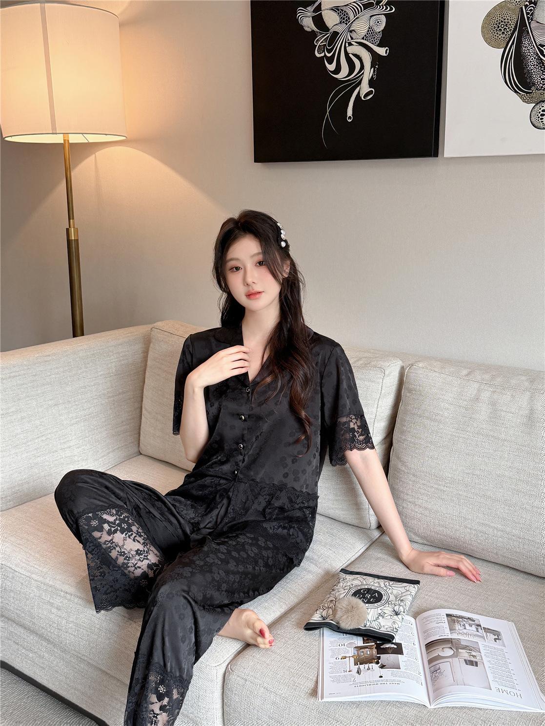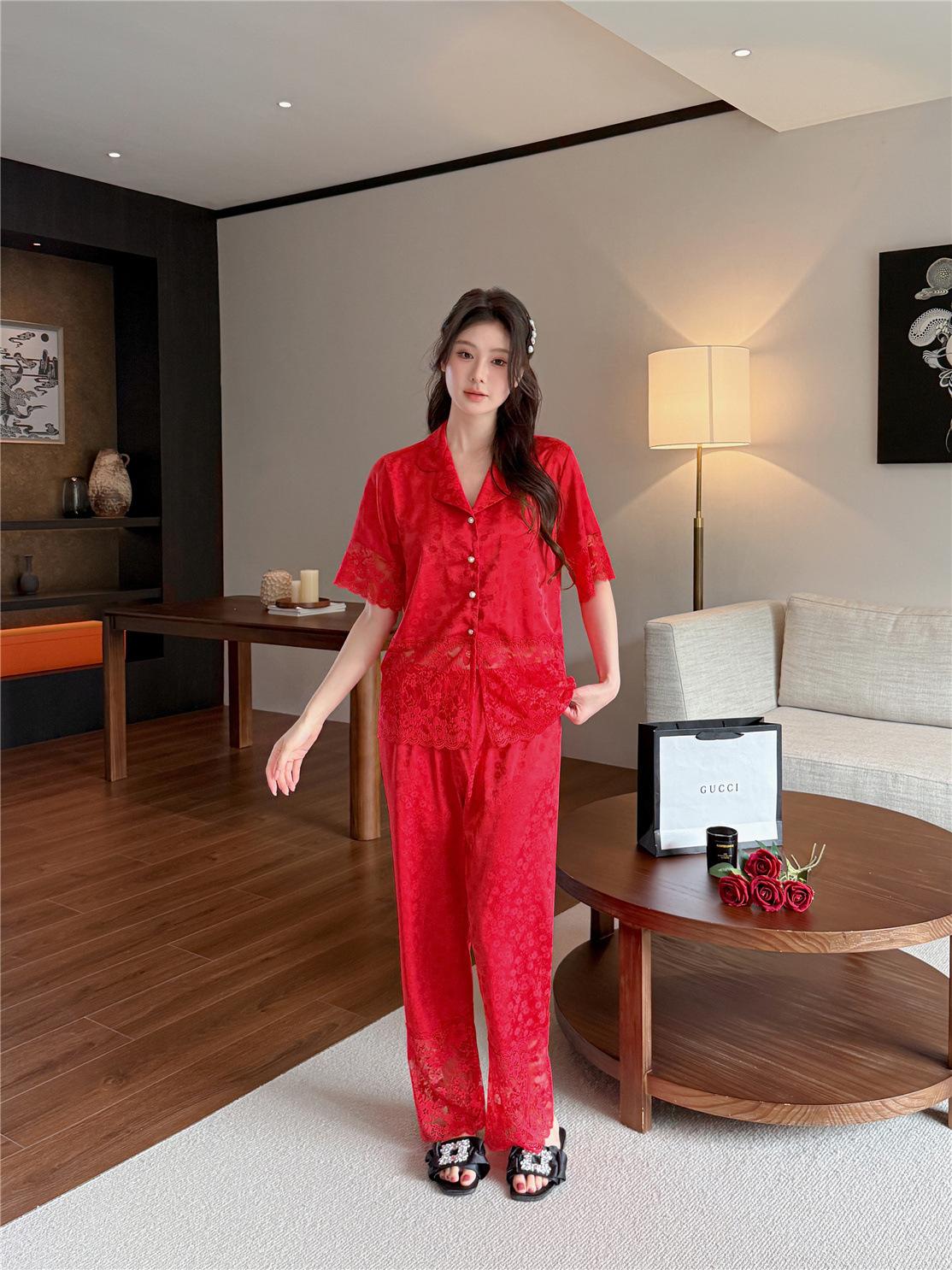 Pijama para Mujer Seda de Hielo Verano Nuevo Sexy Encaje Empalmado Pantalones Manga Corta Conjunto de Dos Piezas Seda de Hielo y Nieve Conjunto para Estar en Casa