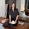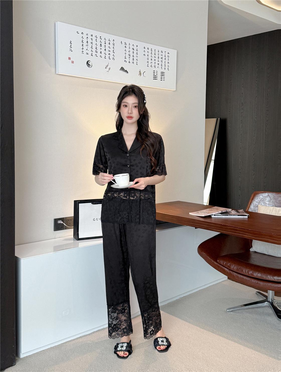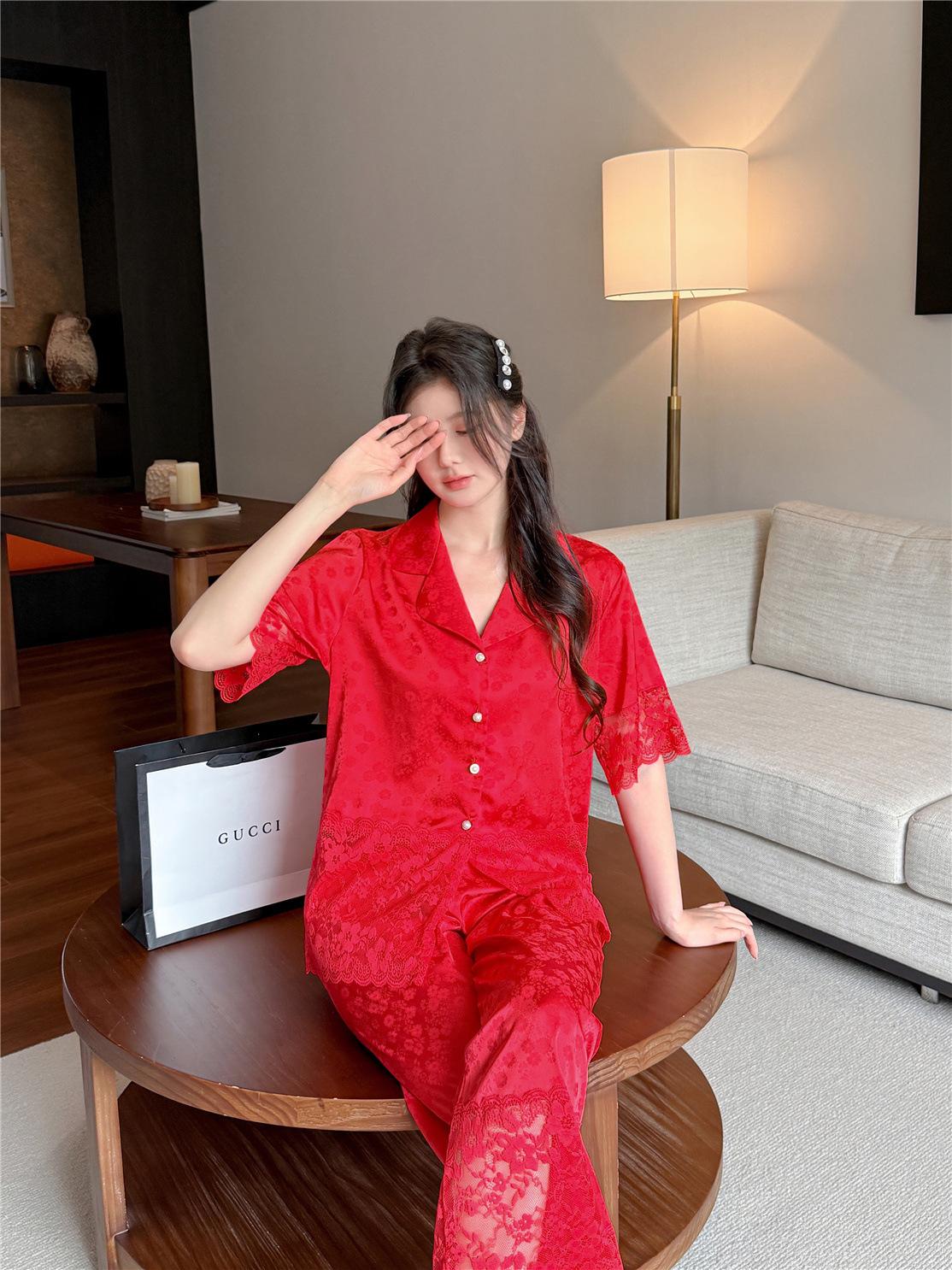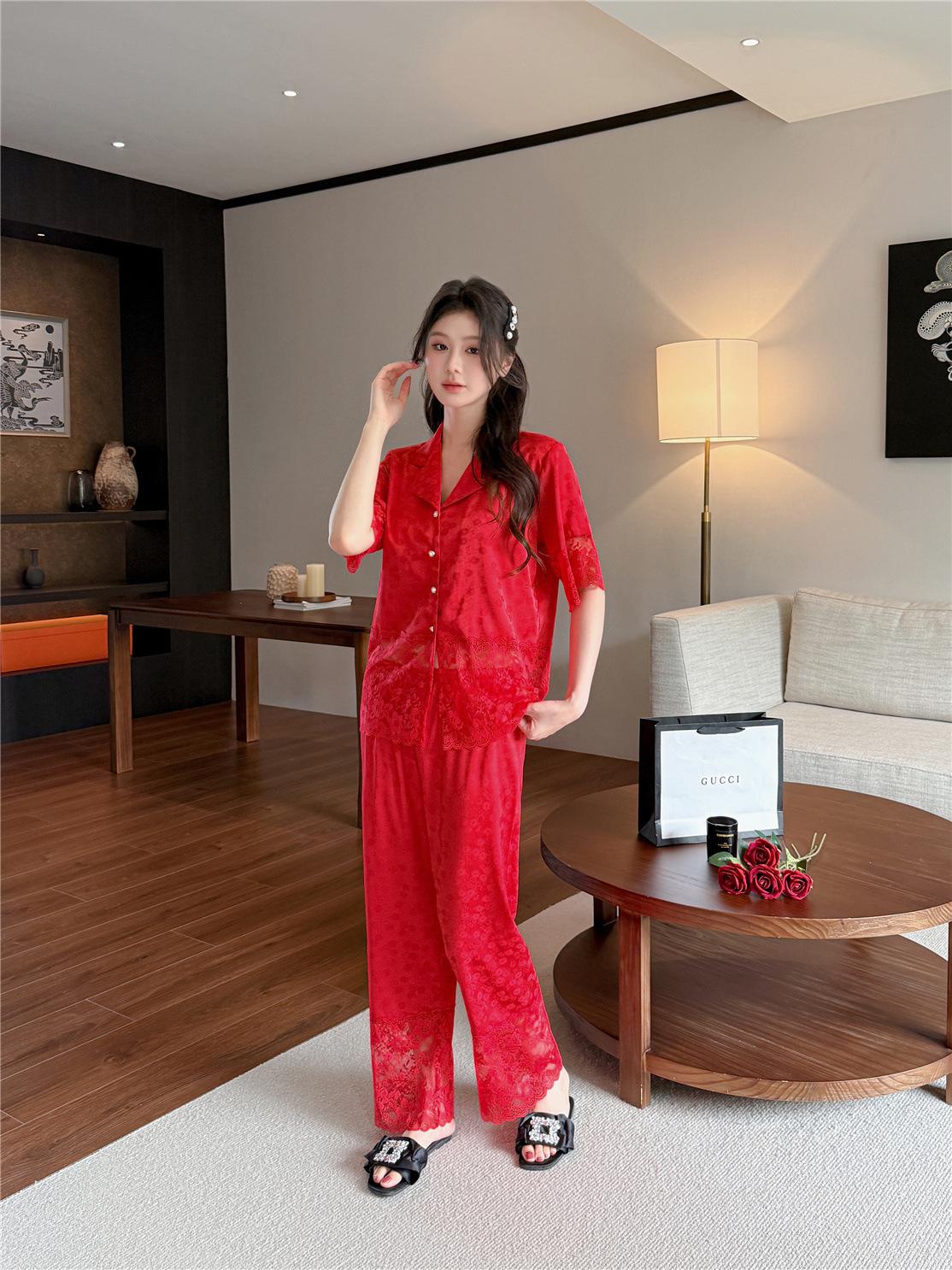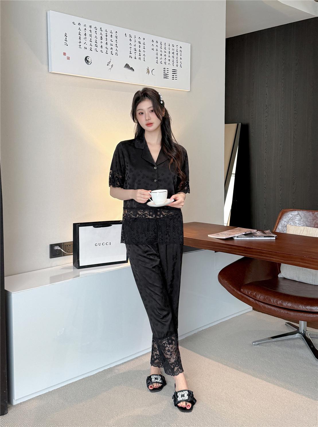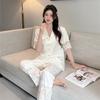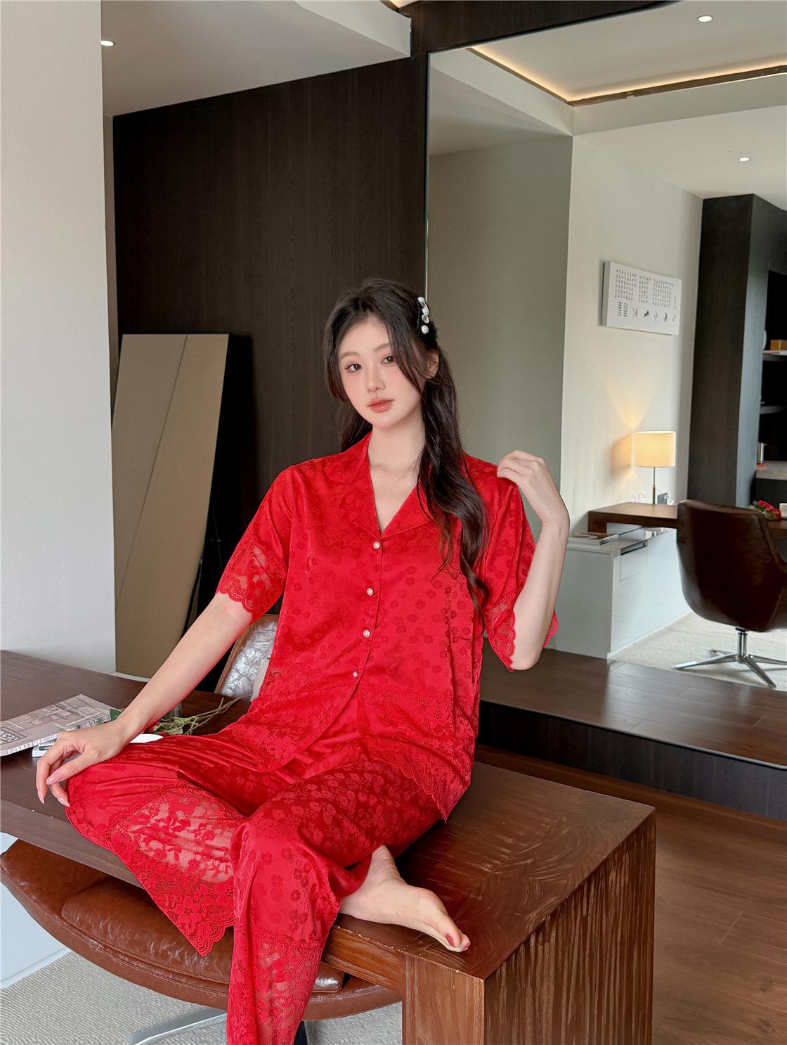 Pijama para Mujer Seda de Hielo Verano Nuevo Sexy Encaje Empalmado Pantalones Manga Corta Conjunto de Dos Piezas Seda de Hielo y Nieve Conjunto para Estar en Casa