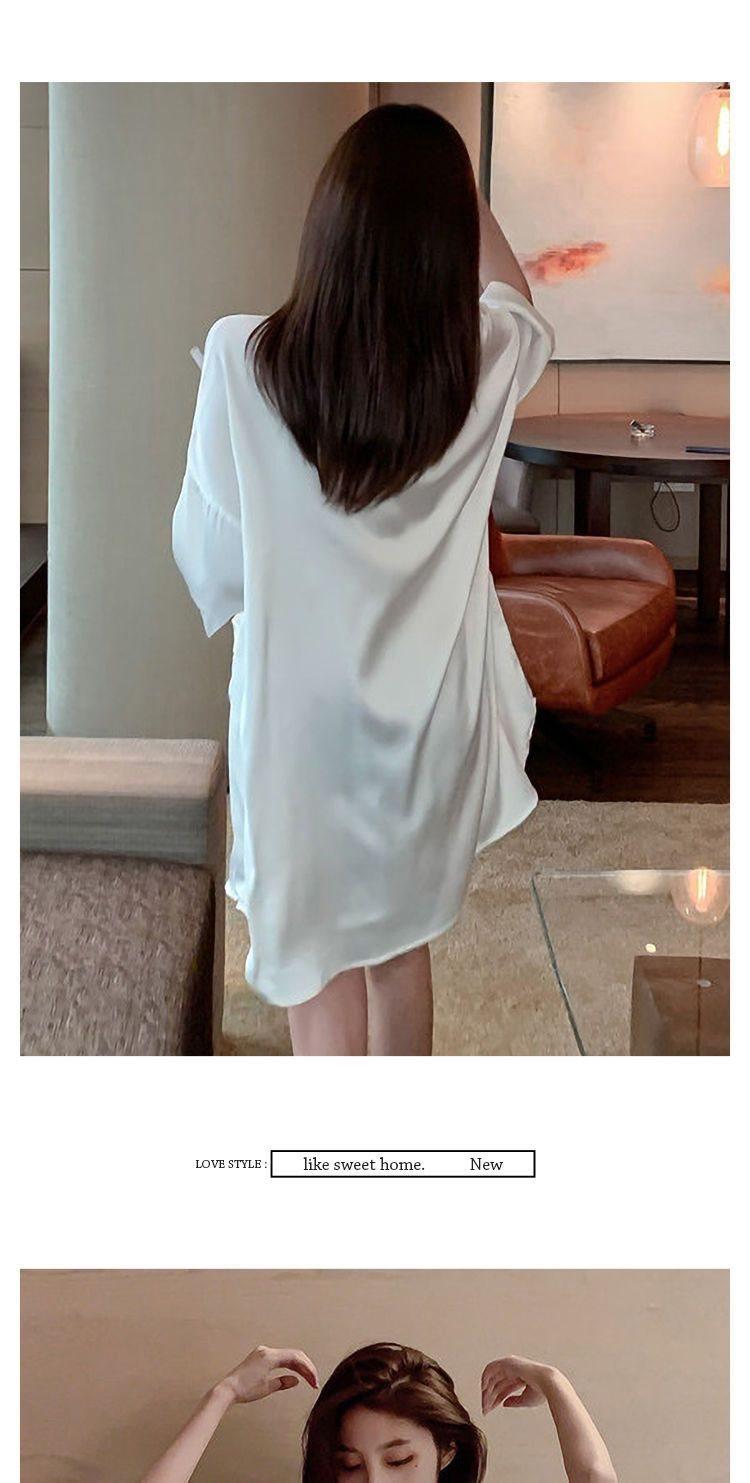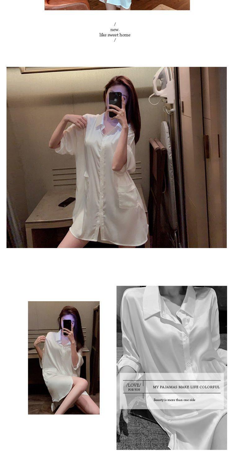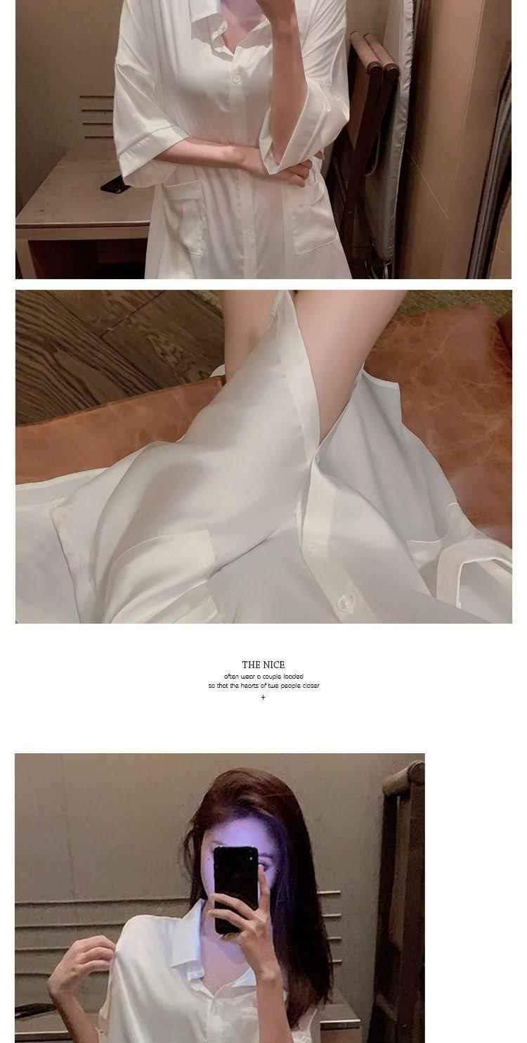 Camisón 2025 para Mujer Primavera y Verano Seda de Hielo Sexy Delgado Estilo Novio Camisa Blanca Popular Media Longitud Pijama de Seda Imitación