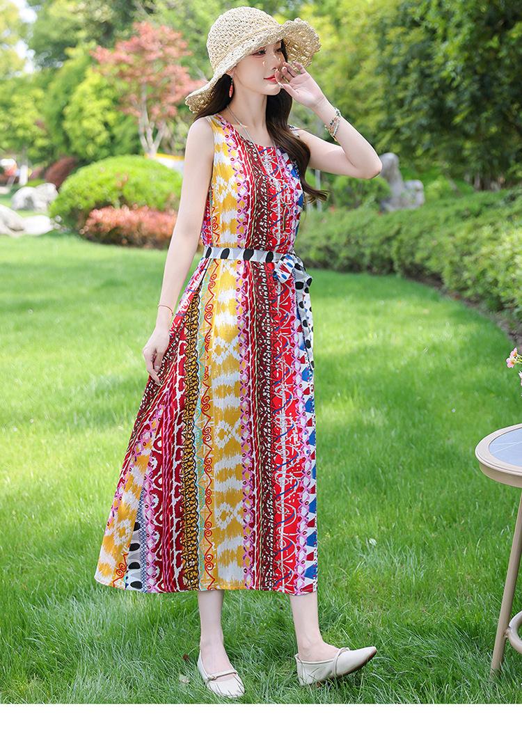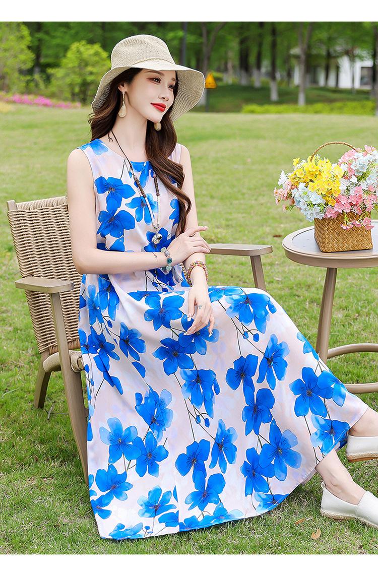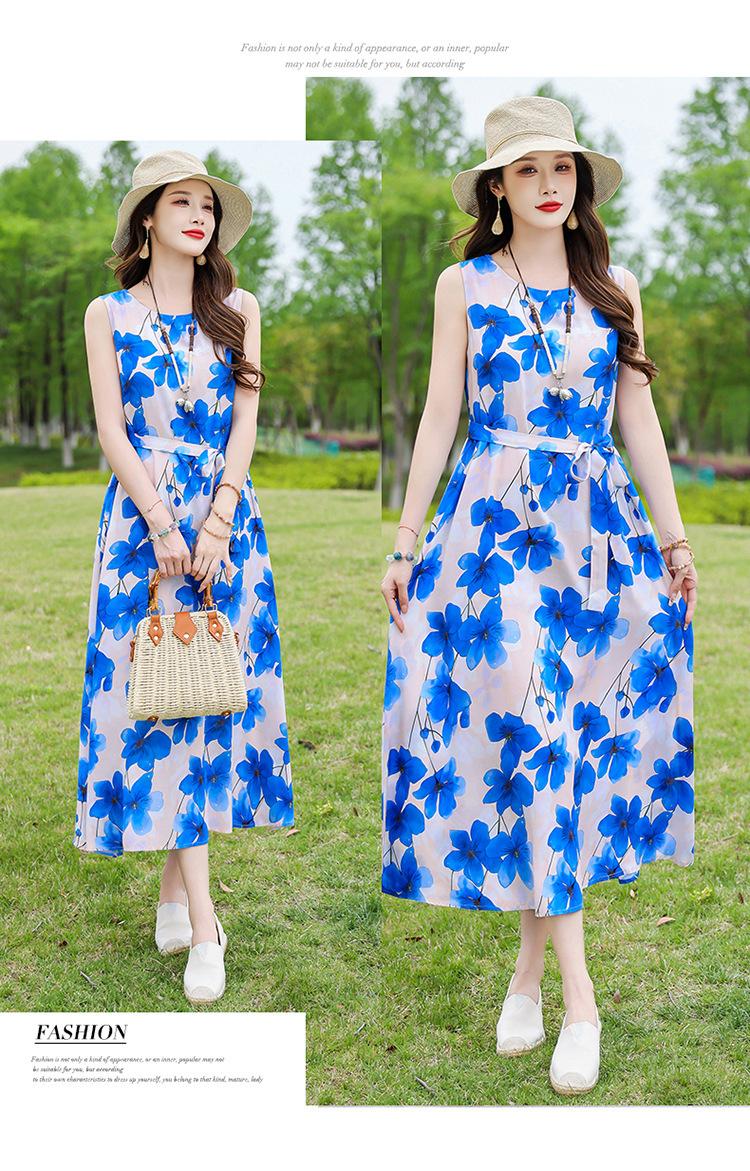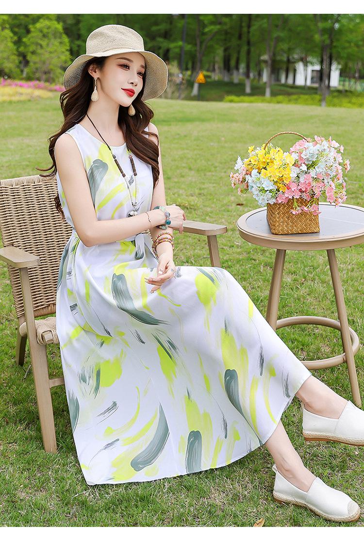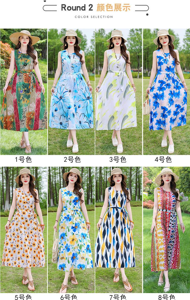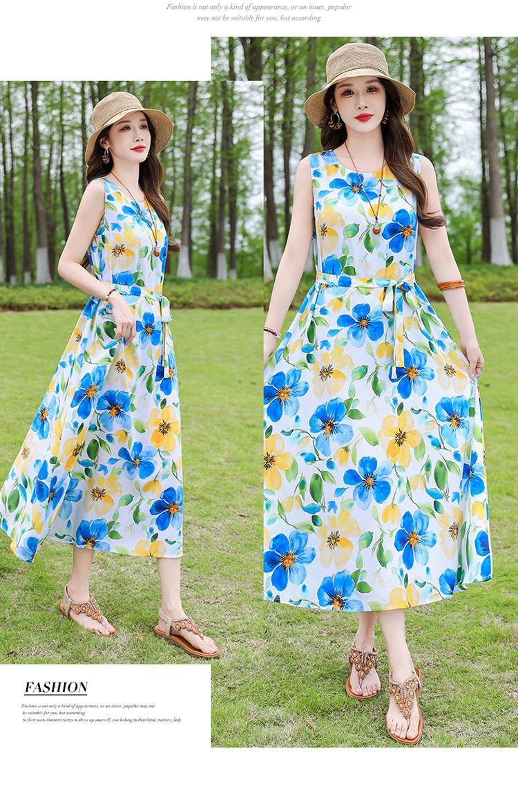 Nuevo Vestido sin Mangas de Algodón Seda Estilo Resort Costero Ceñido a la Cintura para Mujer Talla Extra Look Adelgazante Gordo mm Playa Tirantes Falda Larga