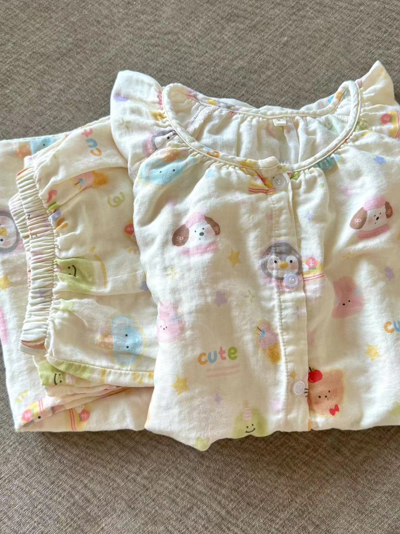 Producto Nuevo de Verano~Pijama de Pantalón y Manga Corta con Cuello Redondo para Mascotas Felices y Lindas Gasa de Doble Capa de Algodón Puro Conjunto de Ropa para el Hogar