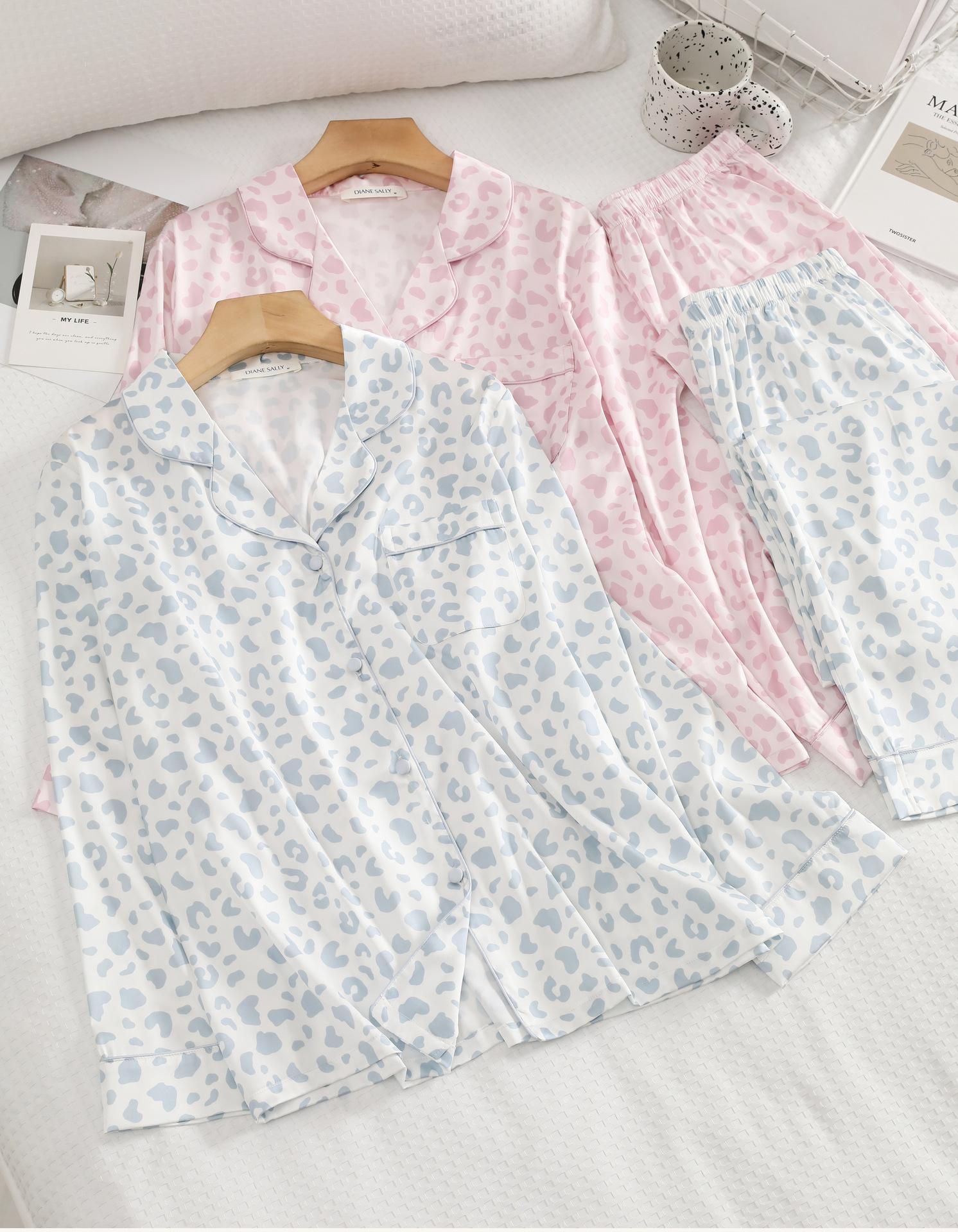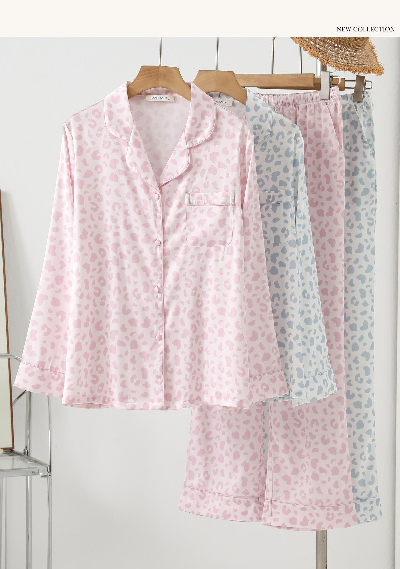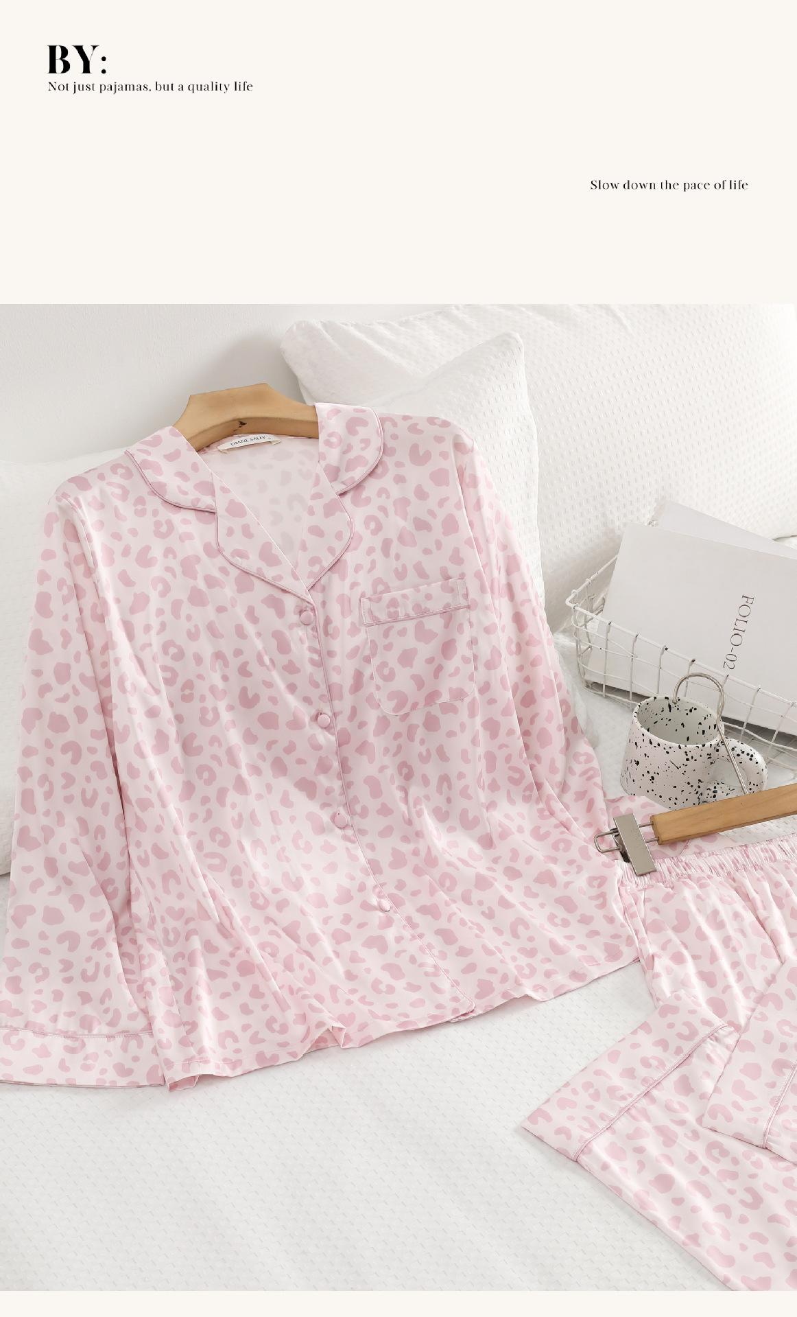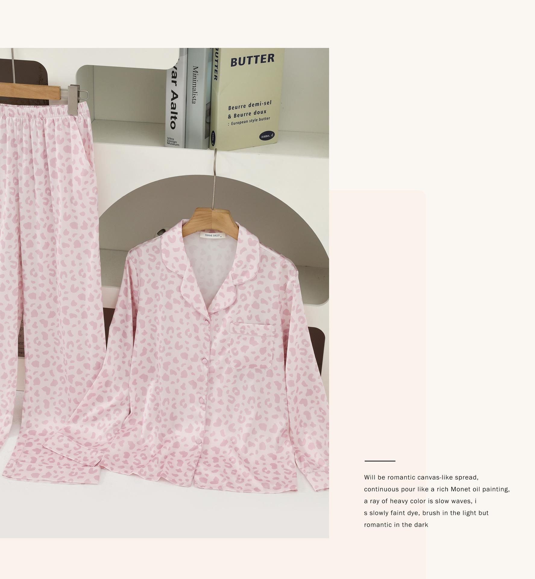 [Personalización de Pijama] Pijama de Estampado de Leopardo Rosa para Mujer de Seda Helada Fina de Manga Larga de Dos Piezas Tipo Seda Traje de Ropa para el Hogar