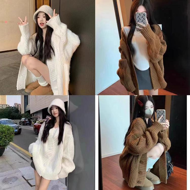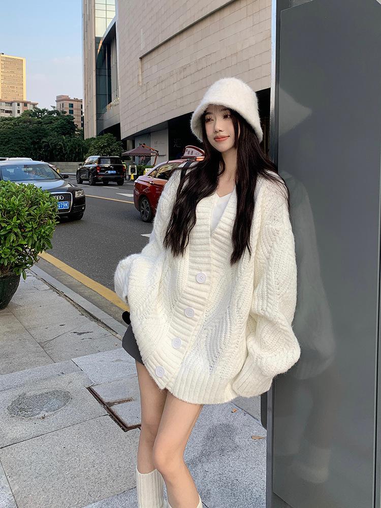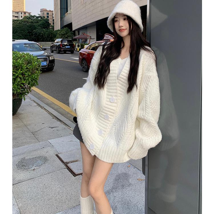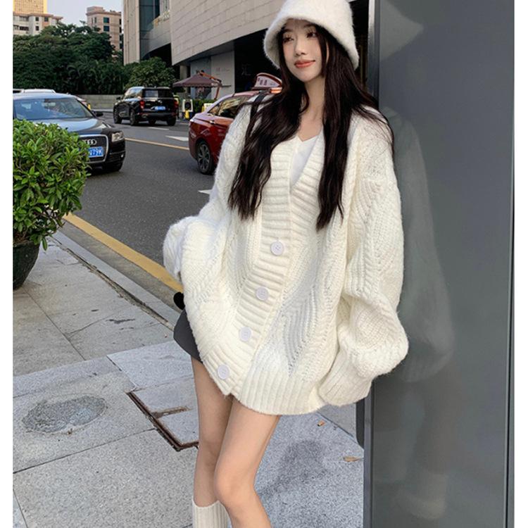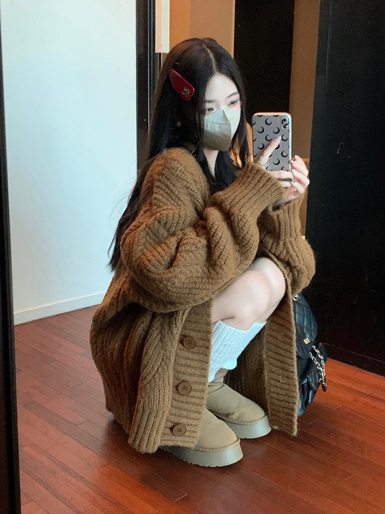 Estilo K de Primavera y Otoño 2025 Estilo Cálido y Perezoso Color Puro Cuello en V Manga Larga Suéter Grueso Chaqueta Cárdigan para Mujer