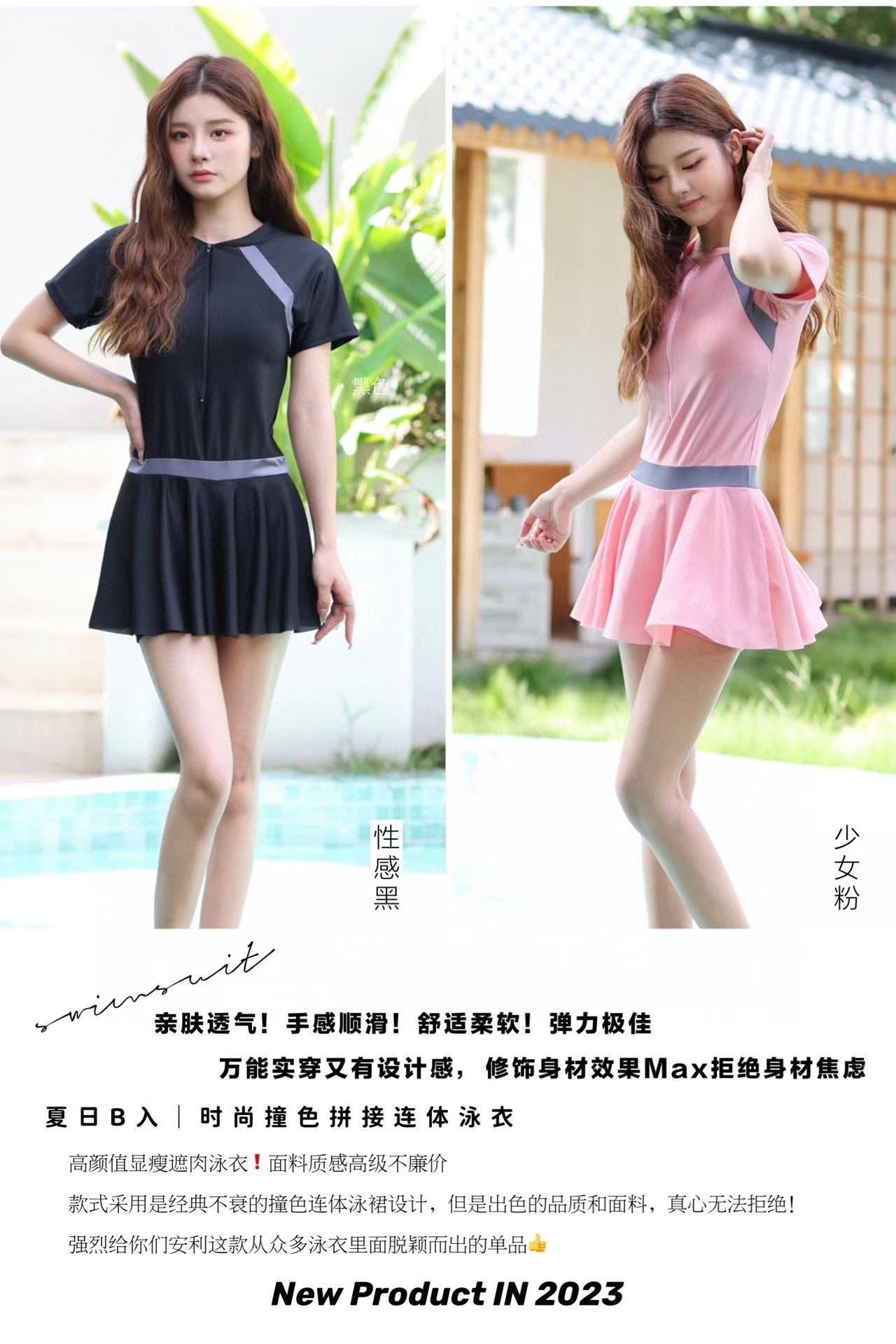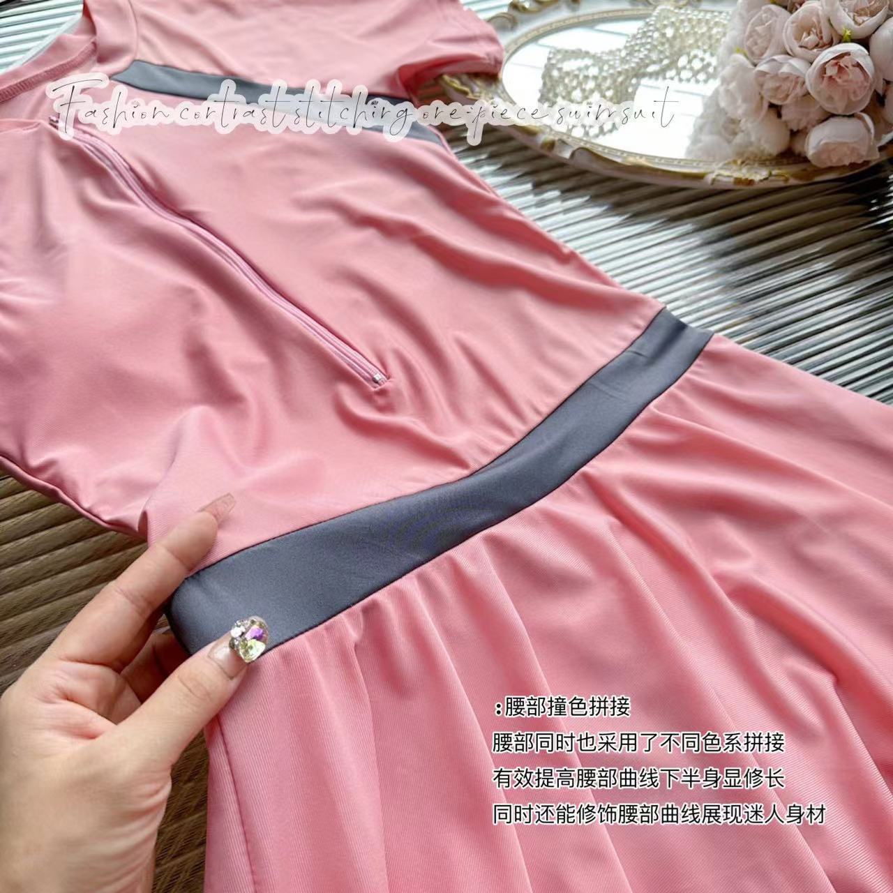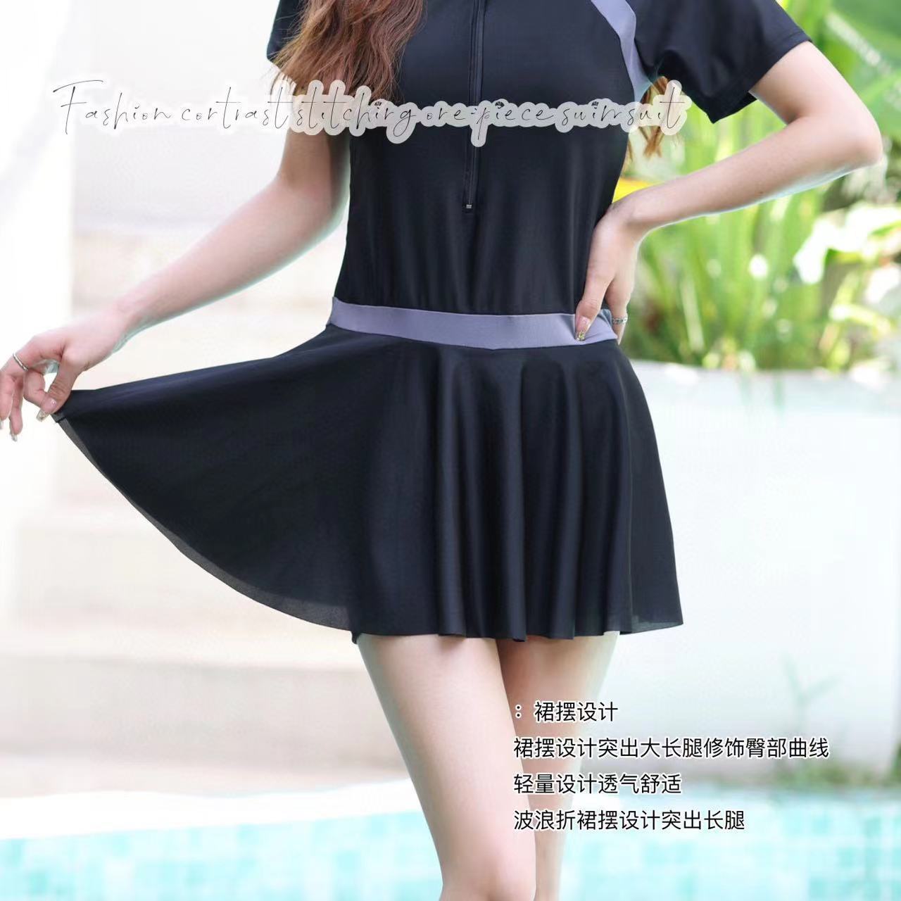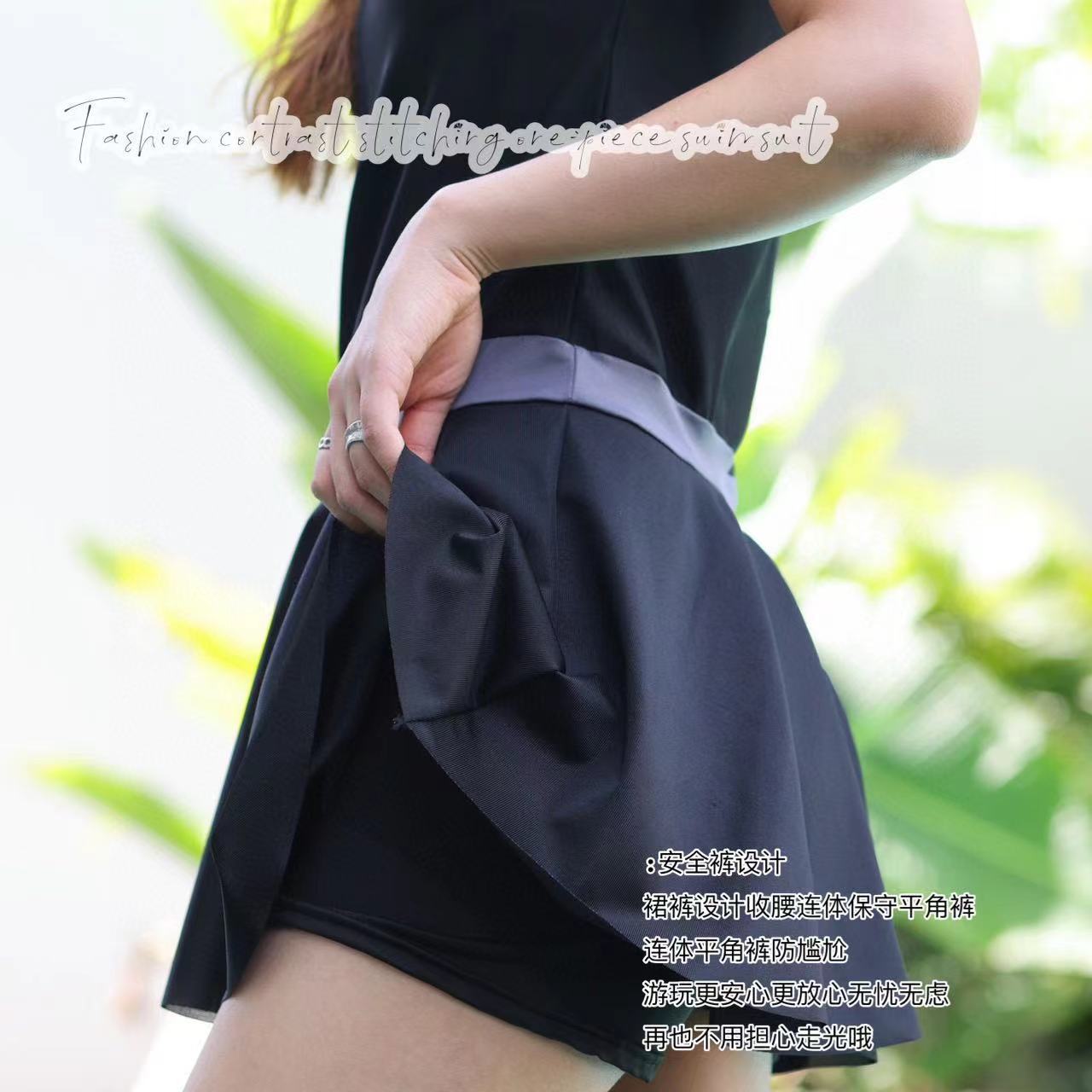 Traje de baño de una pieza con costuras de color en contraste para mujer, que cubre el vientre, adelgazamiento de moda, falda delgada conservadora, traje de baño para nadar al aire libre con protección solar.