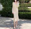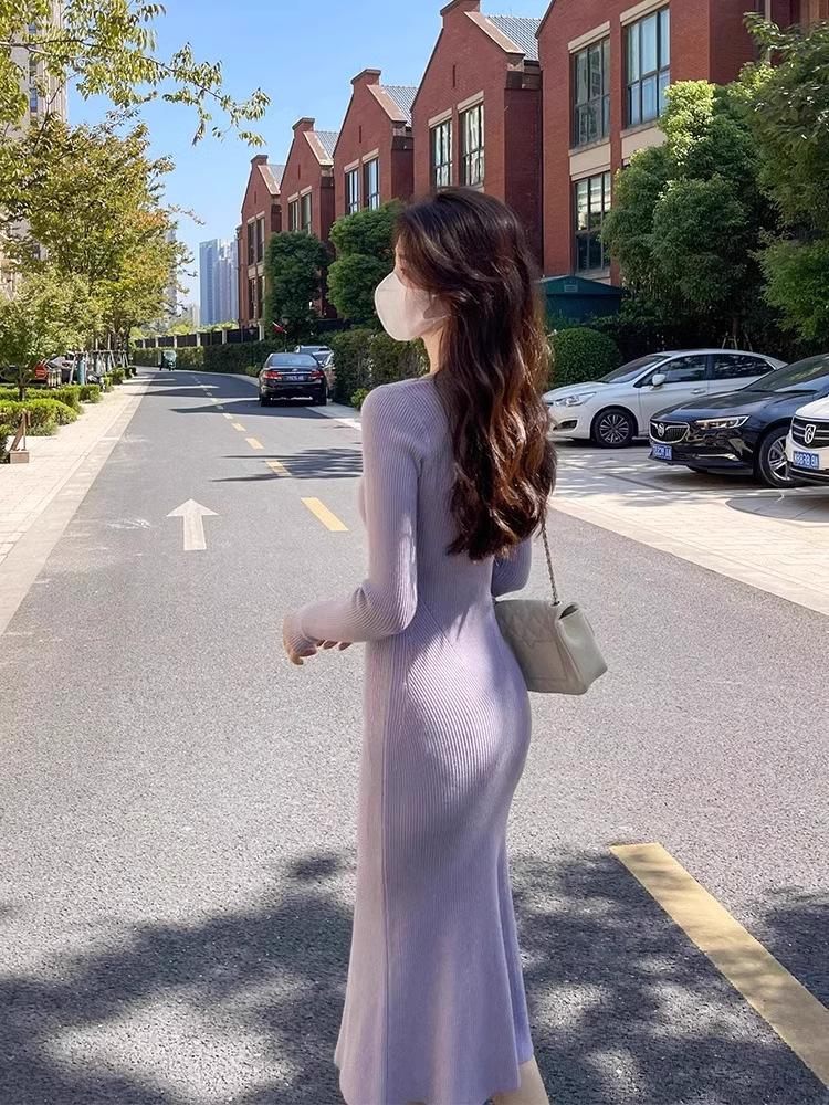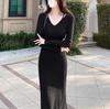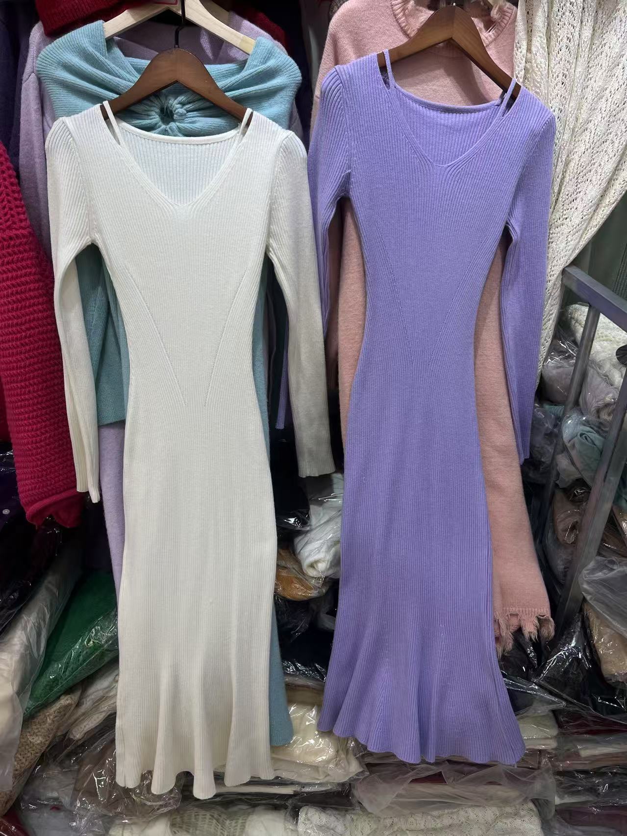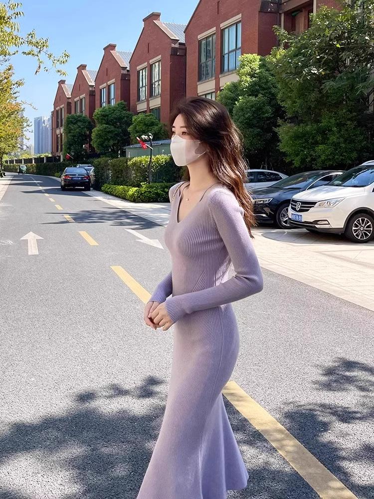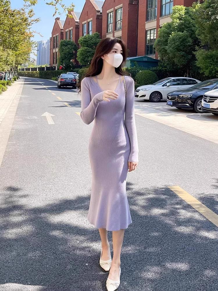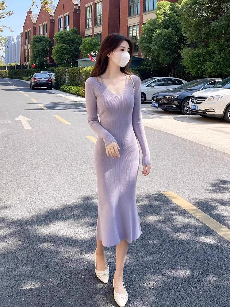 Vestido de Punto Moda Otoñal Tirantes Espagueti Socialité Versátil Temperamento Gentil Suéter Delgado Cuello en V Vestido Bodycon