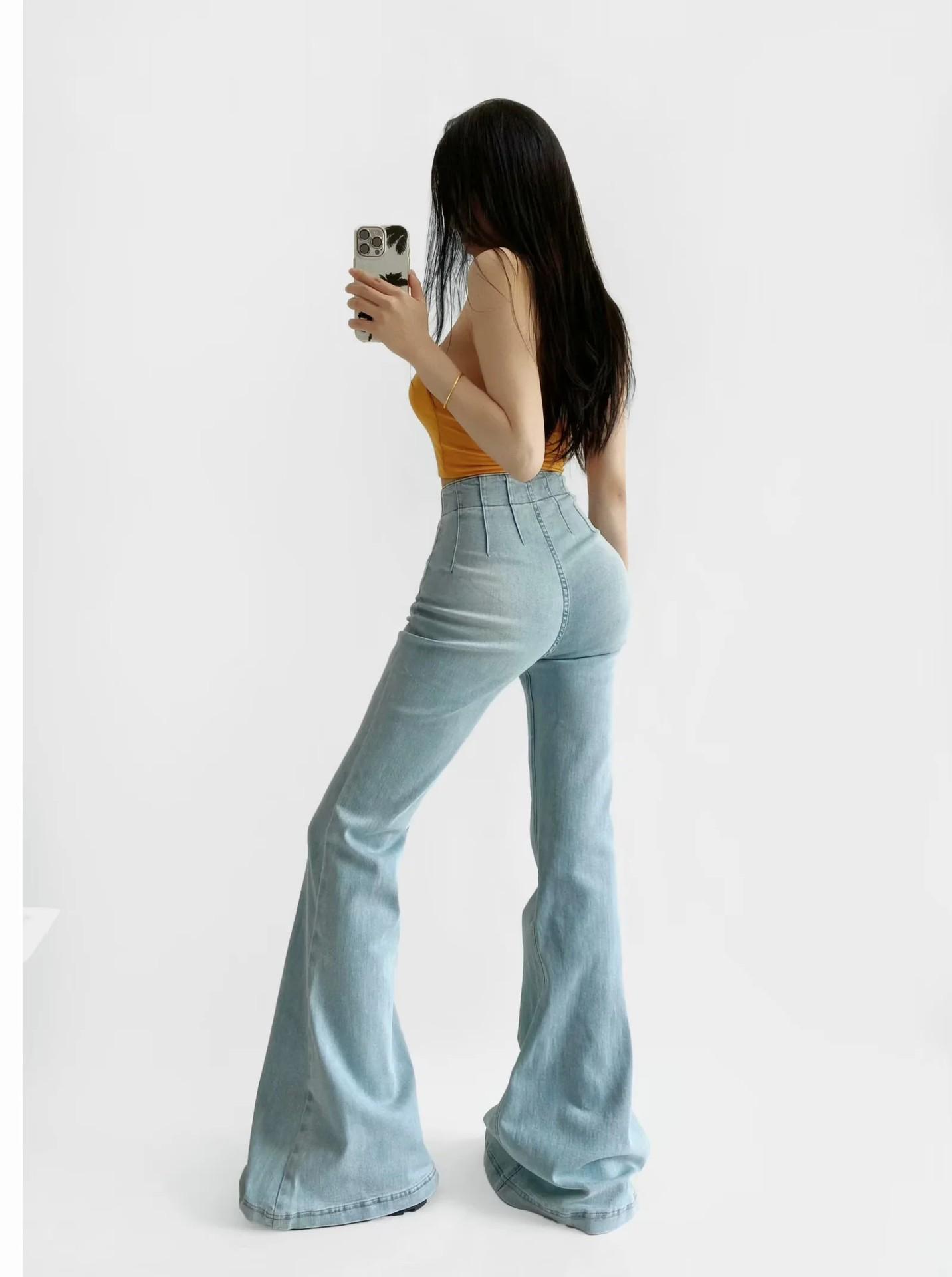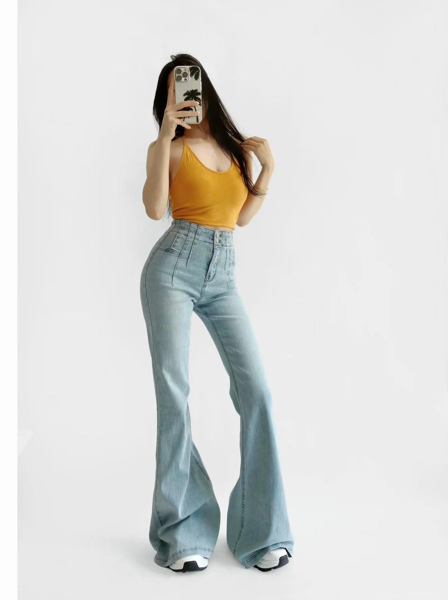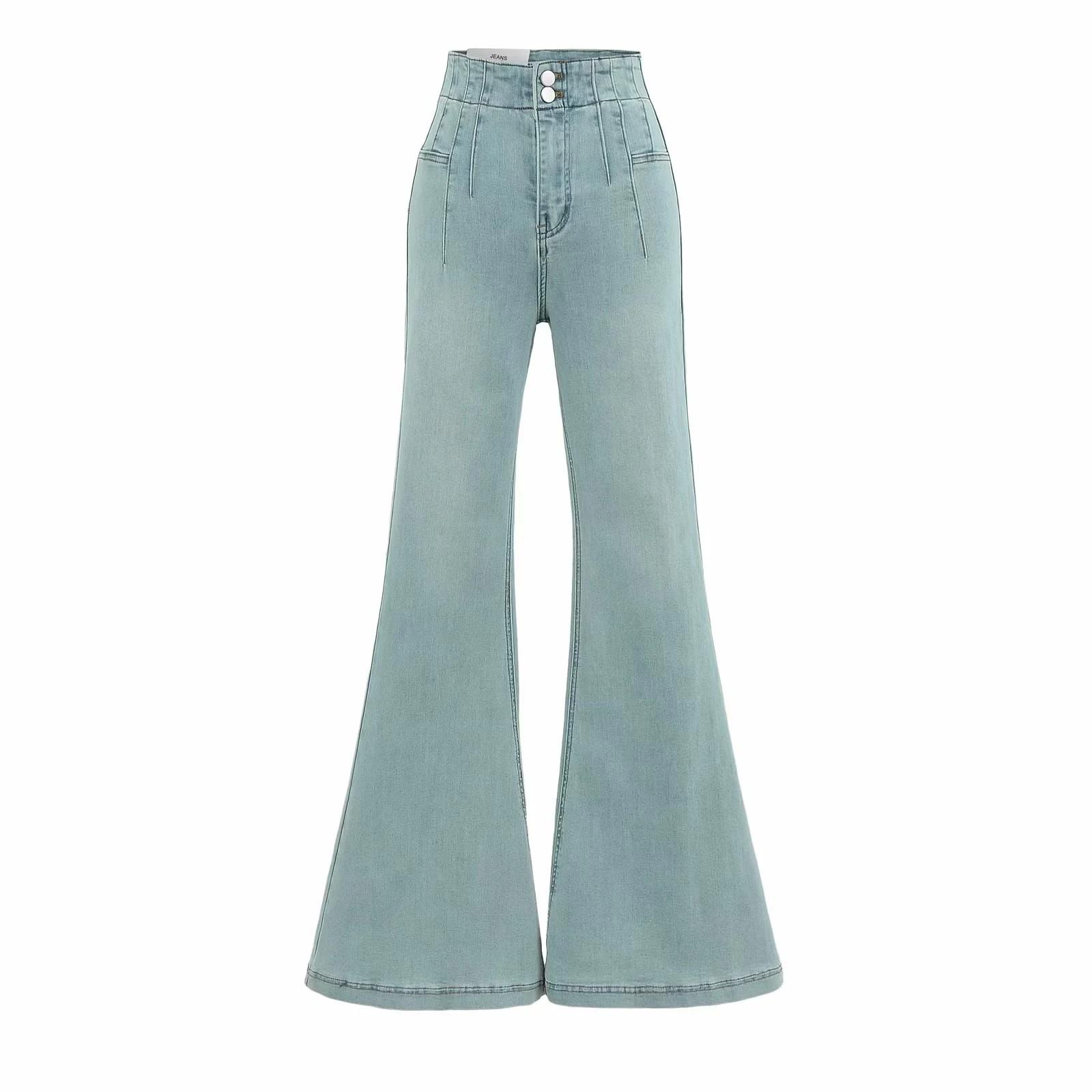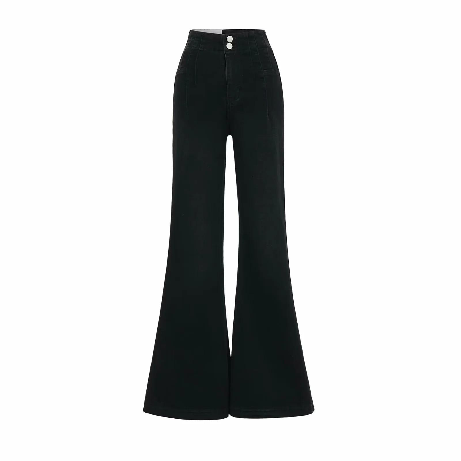 Jeans Micro Acampanados de Verano 2024 de Cintura Alta con Doble Botón Retro Nostálgicos para Mujer Elásticos Ajustados Pantalones Largos hasta el Piso