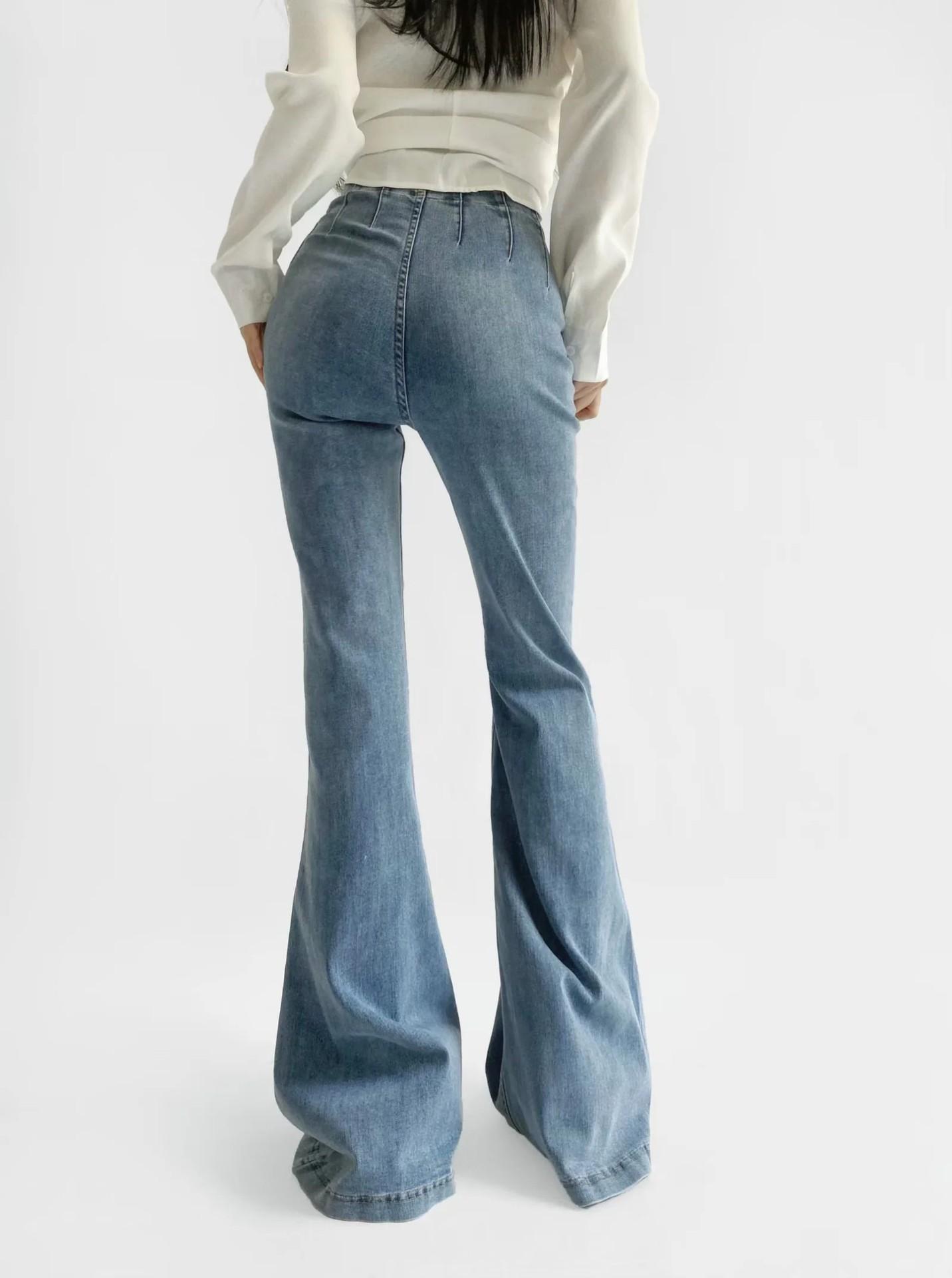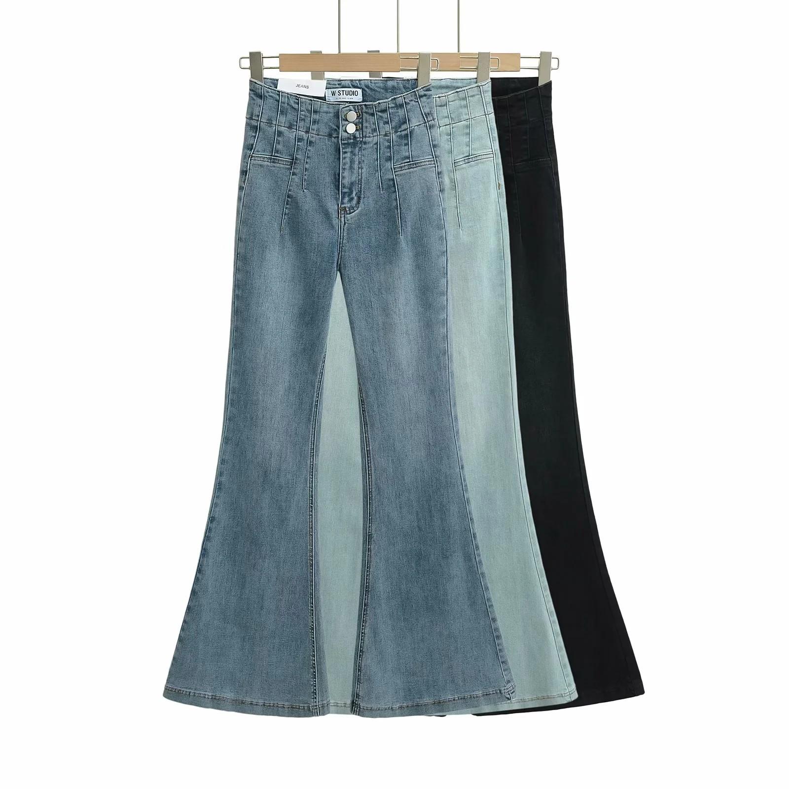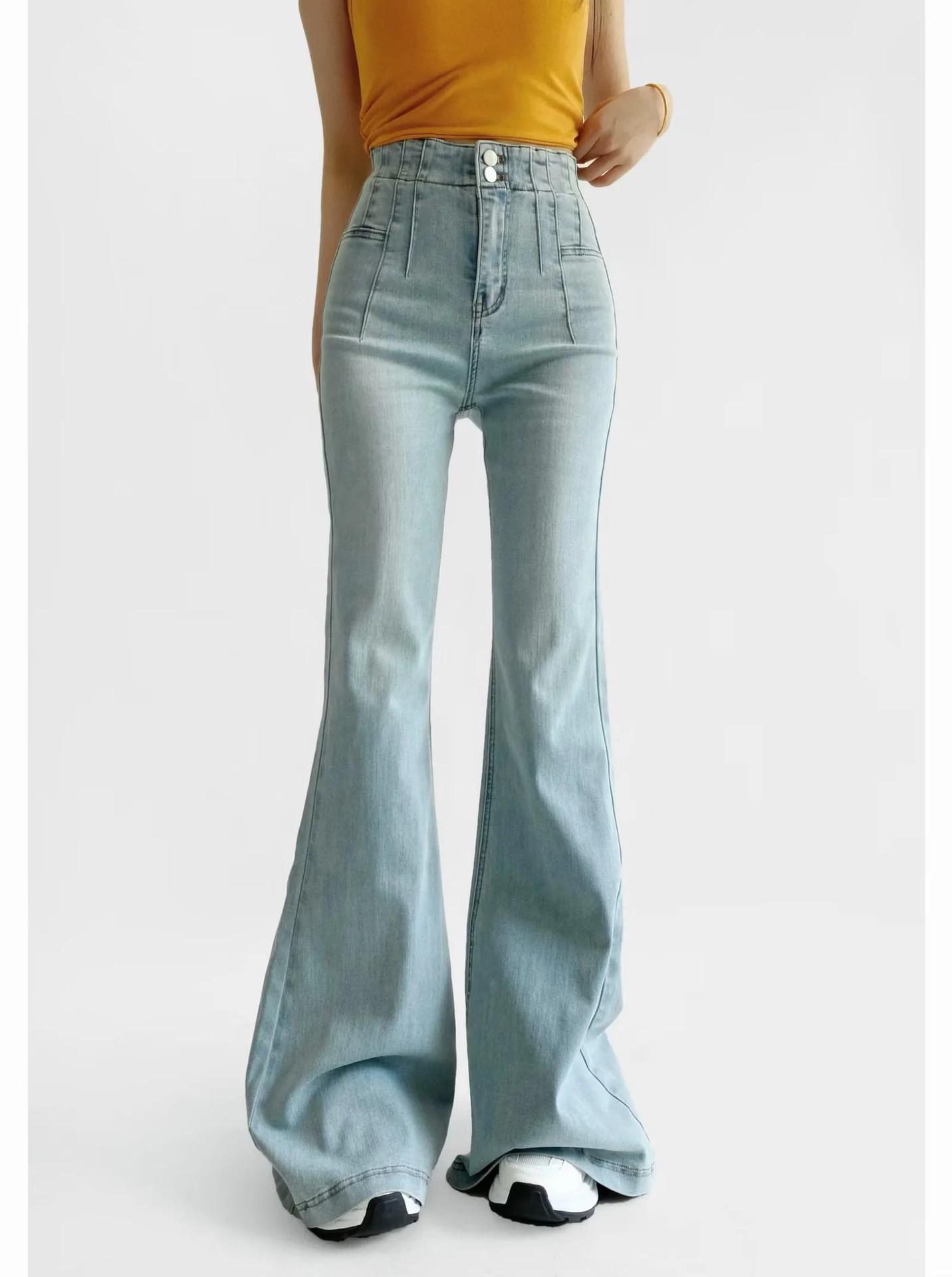 Jeans Micro Acampanados de Verano 2024 de Cintura Alta con Doble Botón Retro Nostálgicos para Mujer Elásticos Ajustados Pantalones Largos hasta el Piso