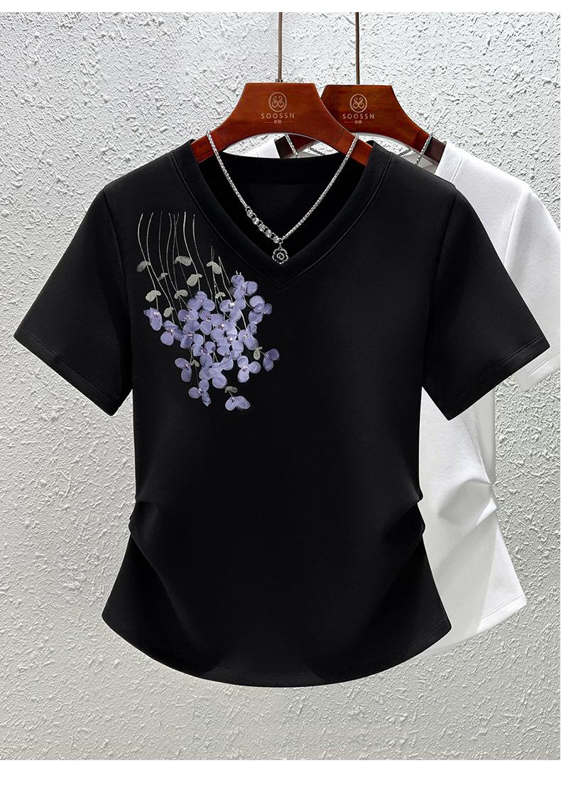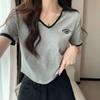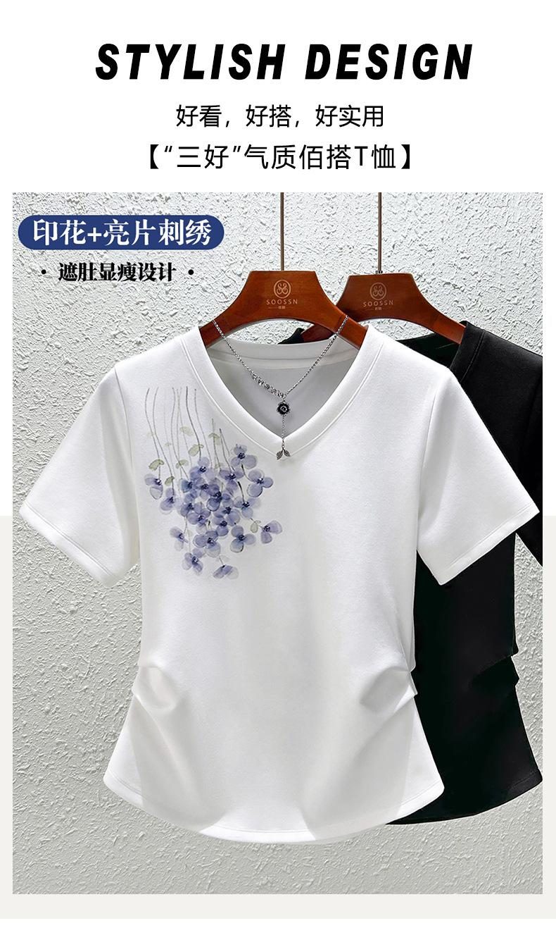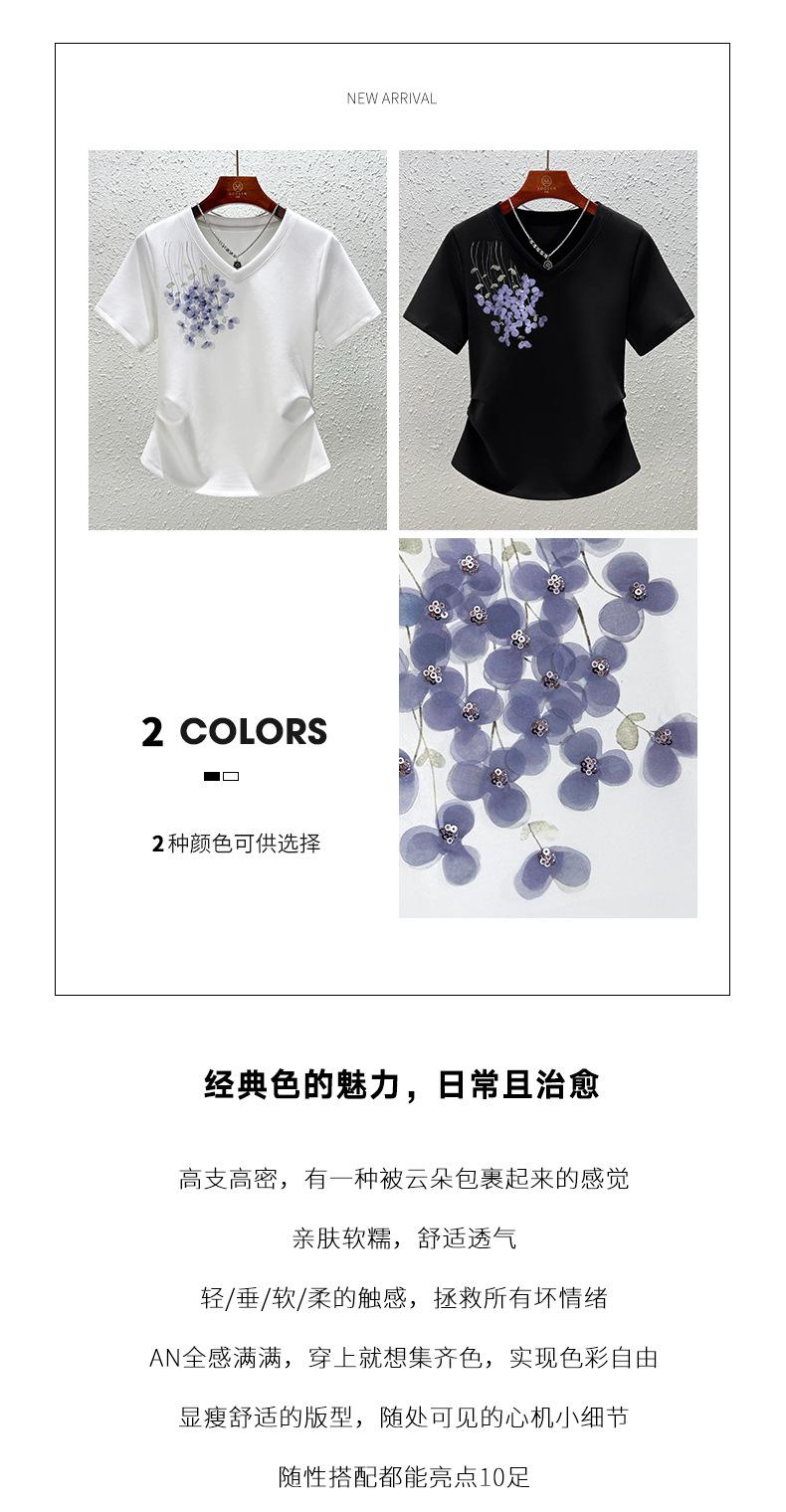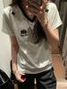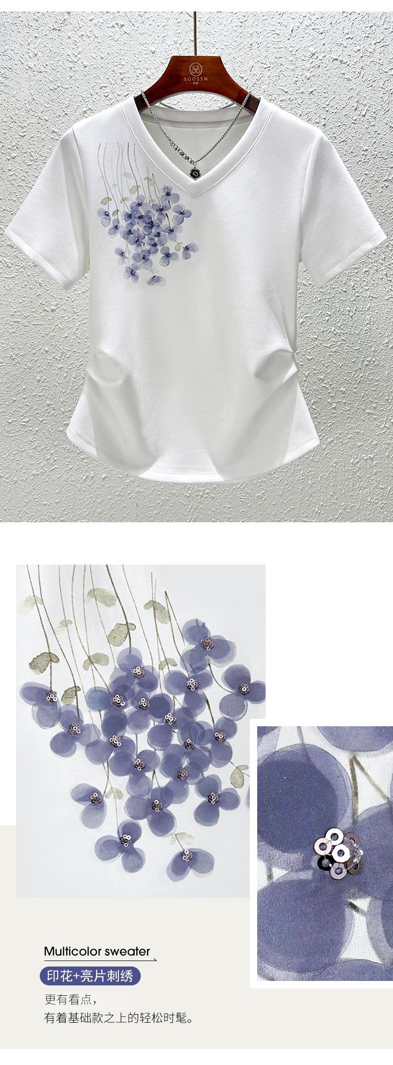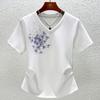 Camiseta Blanca de Manga Corta para Mujer 2025 Nueva Ropa de Verano Simple y Versátil Ropa de Trabajo Bordado de Lentejuelas Hombro Derecho Cuello en V Top Holgado