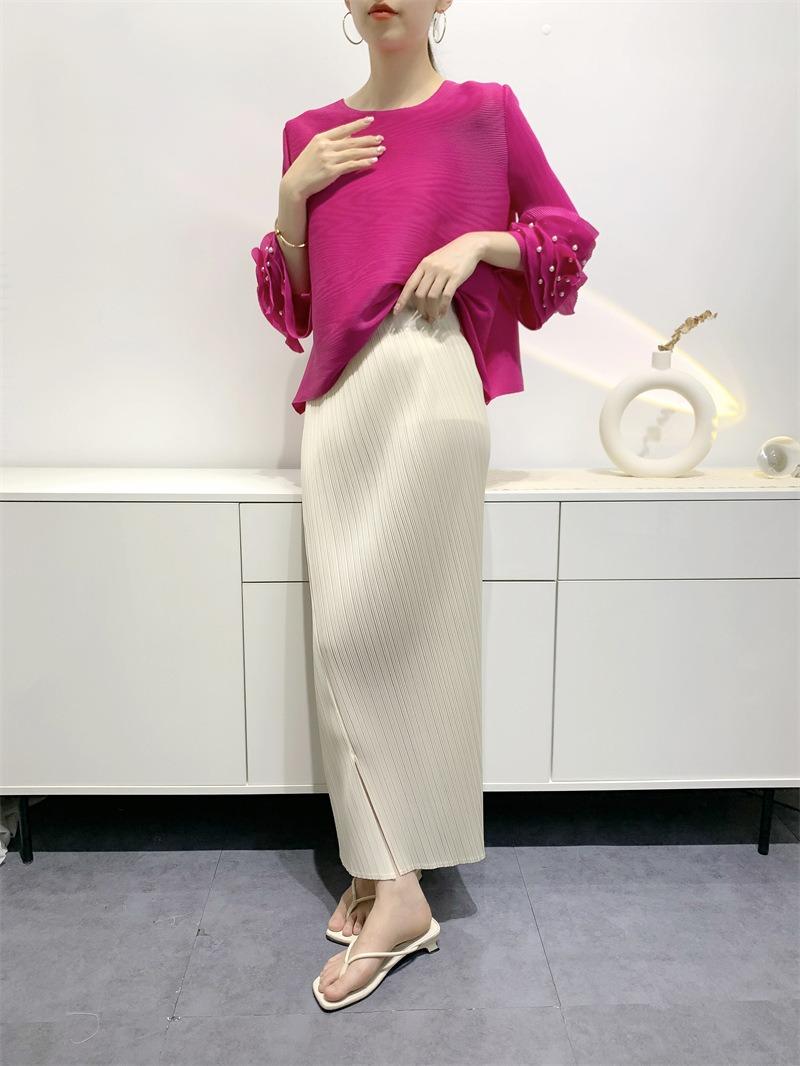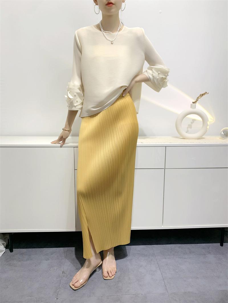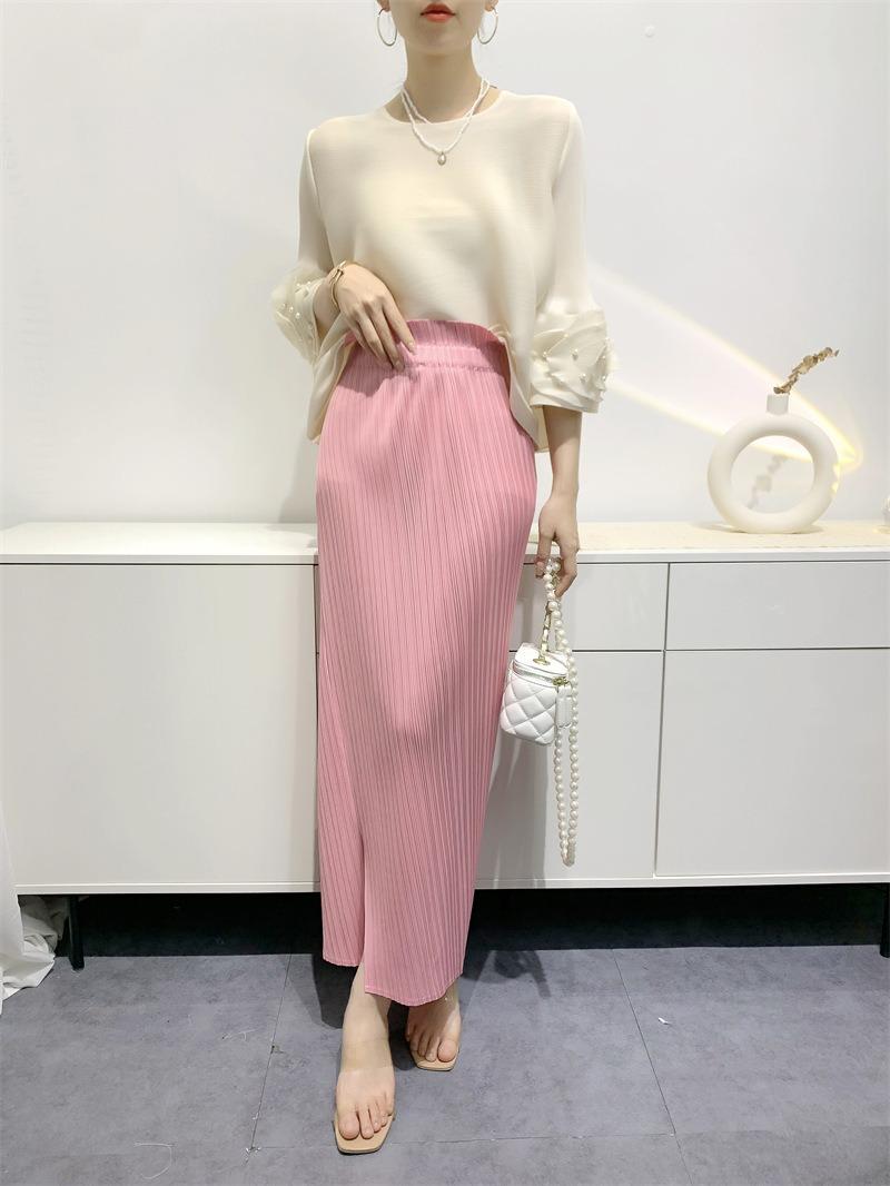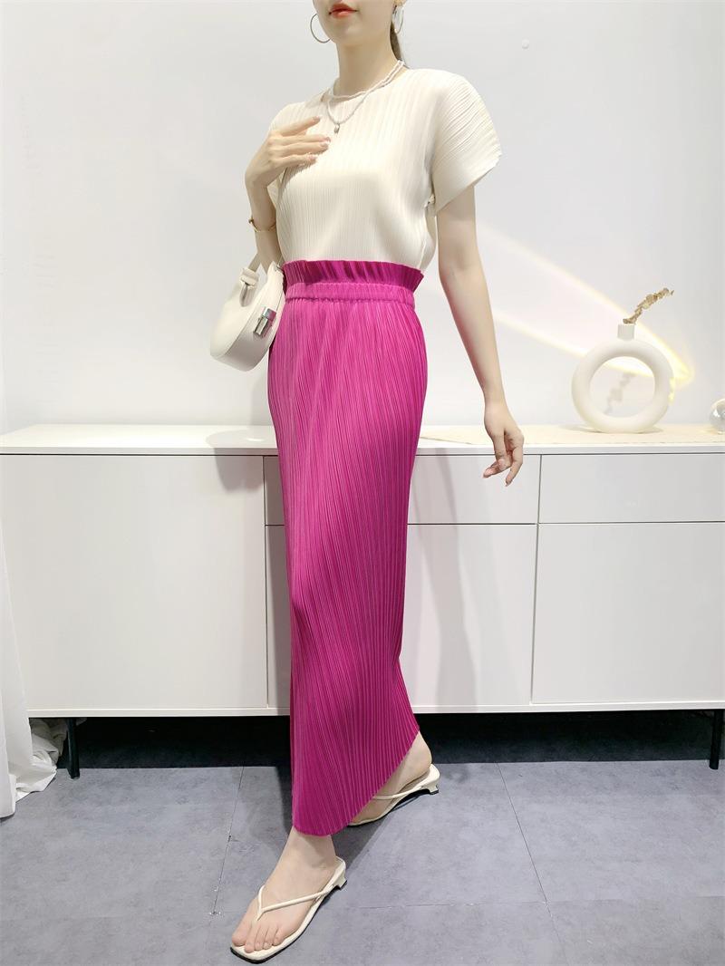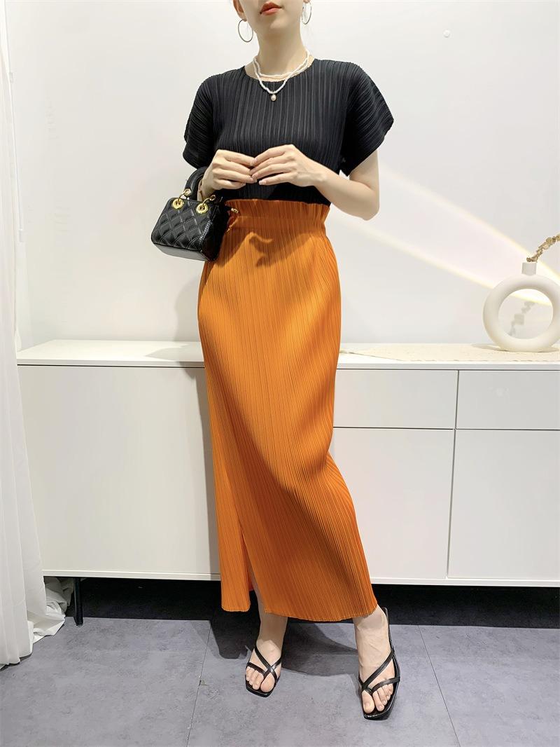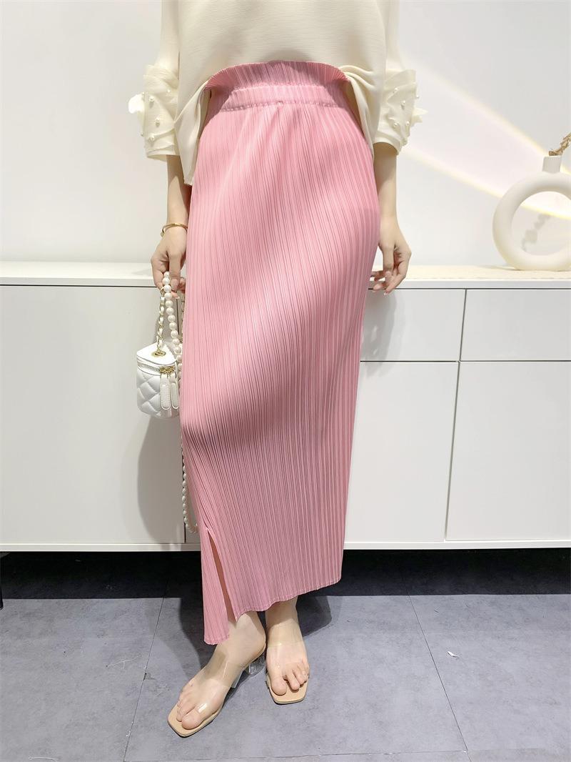 Falda Plisada Estilo Miyake Verano 2024 Adelgazante Cintura Alta Elástica Talla Grande Abertura Falda Larga Plisada Casual Japonés y Coreano