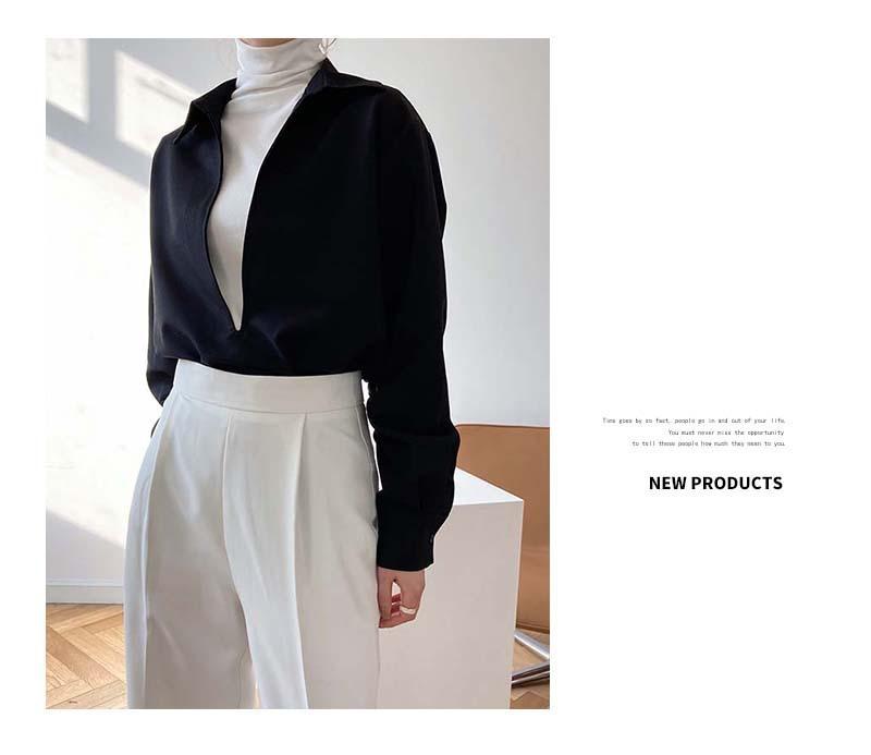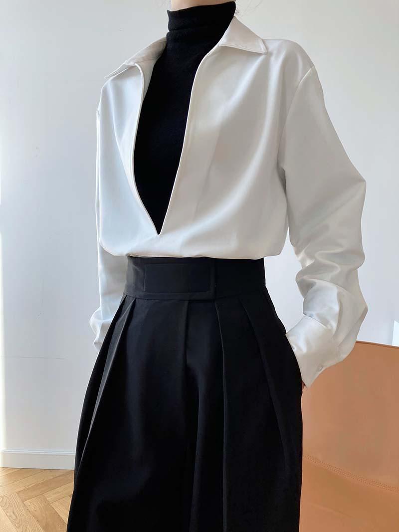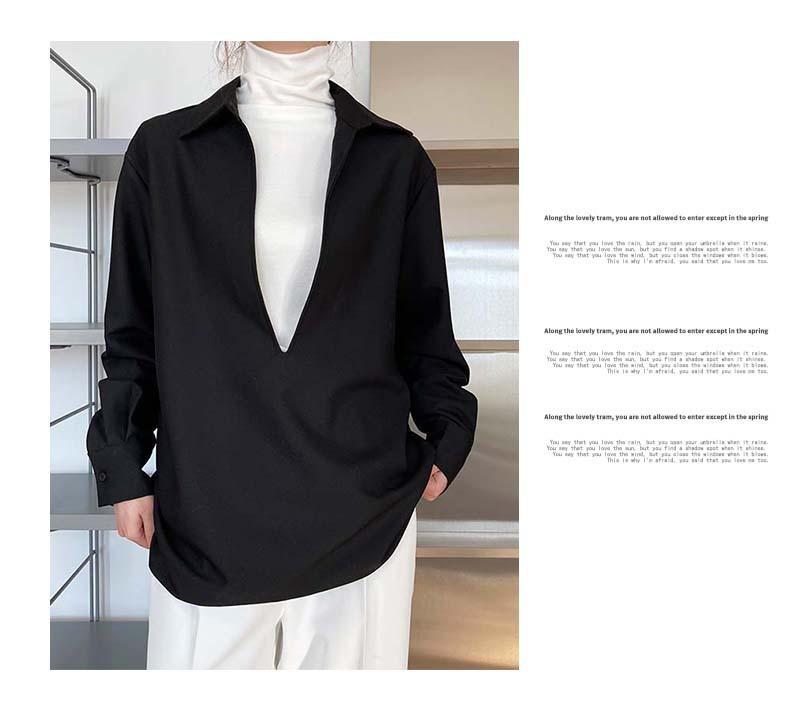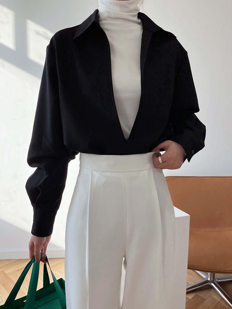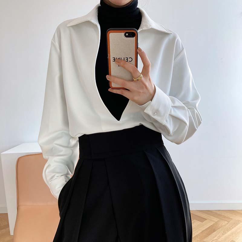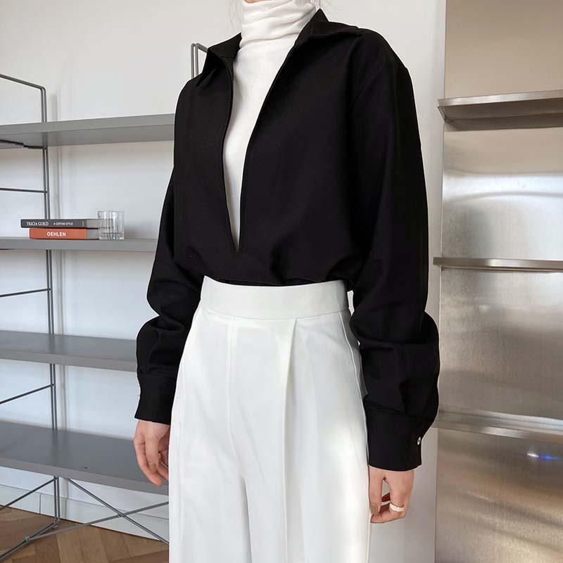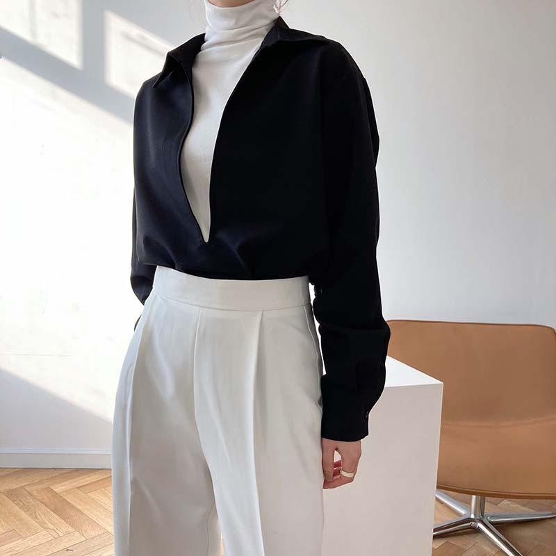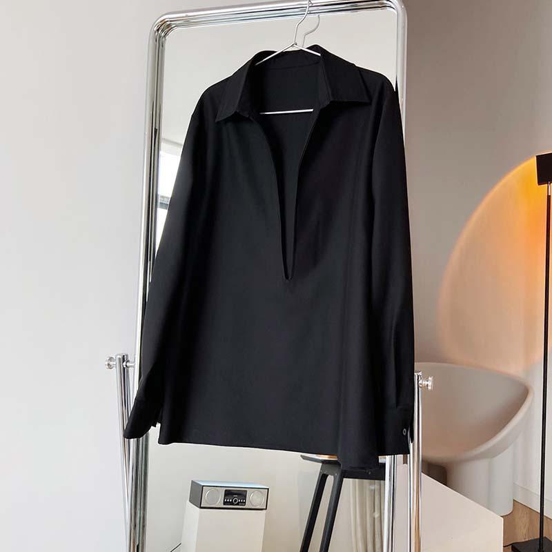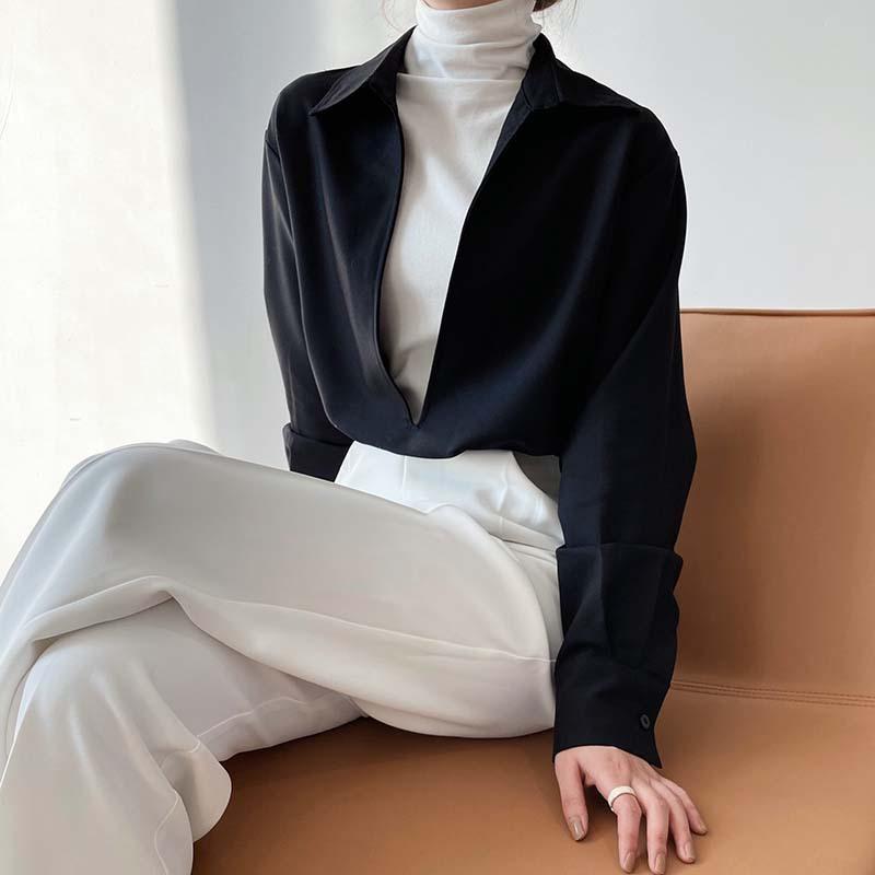 Camisa de Manga Larga Negra de Moda para Mujer Apilada Blanca para Mujer Sentido del Diseño Nicho Estilo Hong Kong Chic Francés Top con Cuello en V