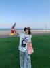 Camiseta Grande de Manga Corta y Cuello Redondo con Estampado de Gato de Dibujos Animados para Mujer Verano Diseño Holgado y Perezoso Blanco Top Versátil