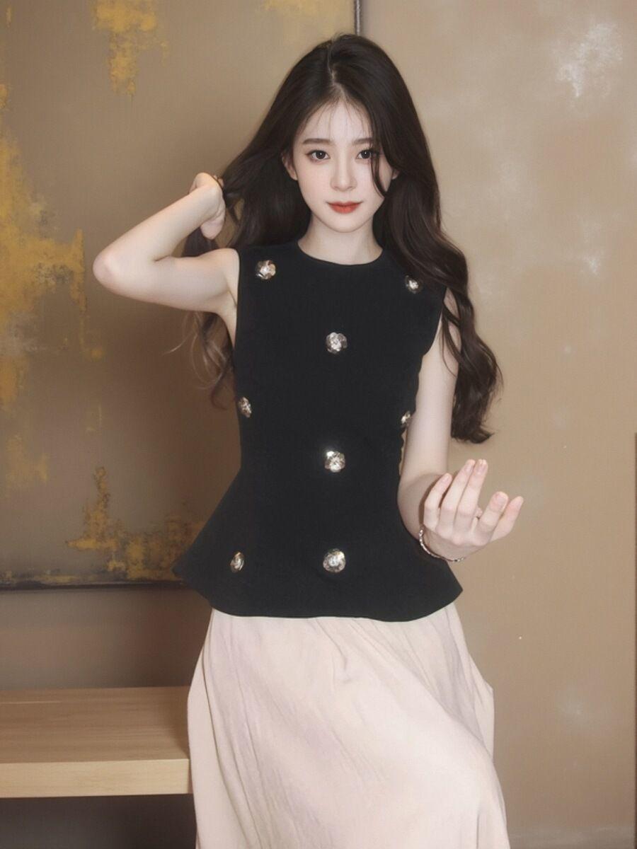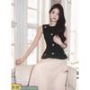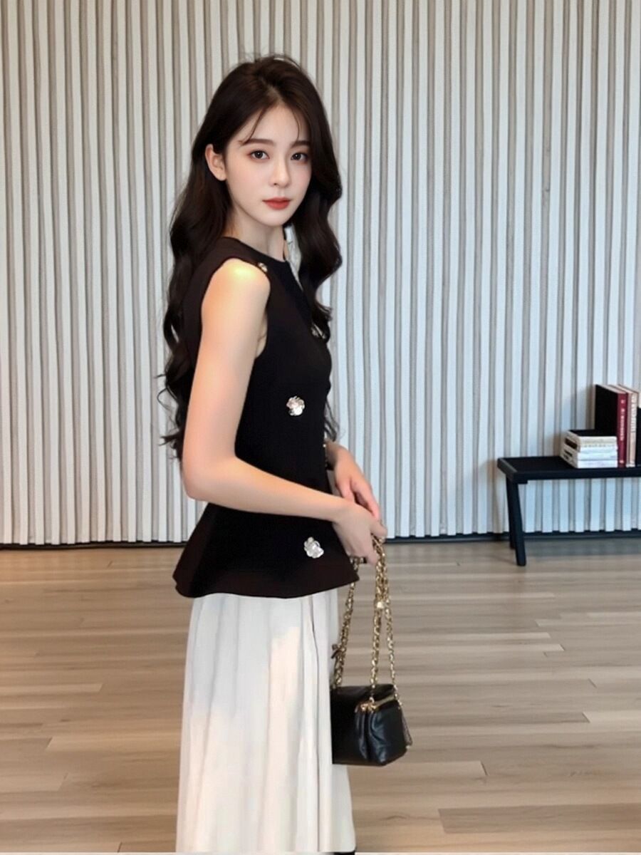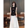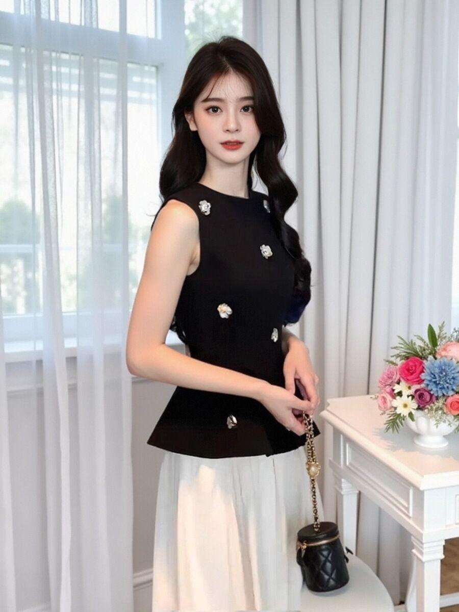 Conjunto de Chaleco Floral Tridimensional Negro sin Mangas y Falda Slim de Cintura Alta para Mujer, Nuevo Estilo Primavera/Verano 2025