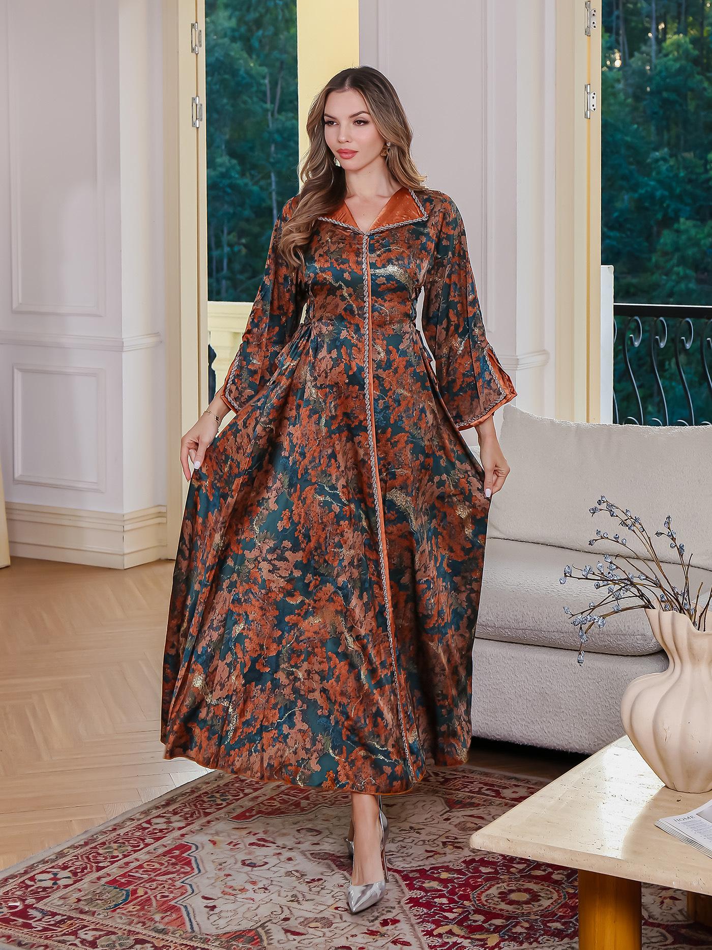 Nuevo en Stock Estampado Musulmán Bata Larga Mujer Vestido Elegante de Medio Oriente Abaya Transfronteriza Arabia Saudita Dubái Vestido Largo