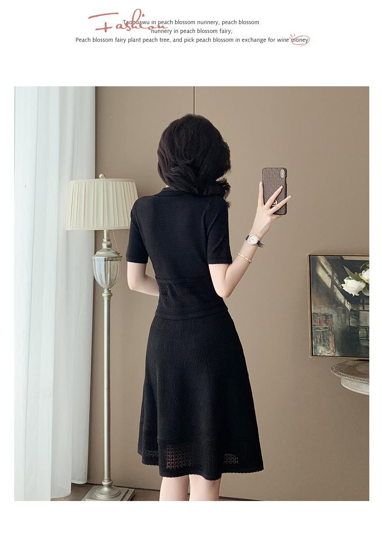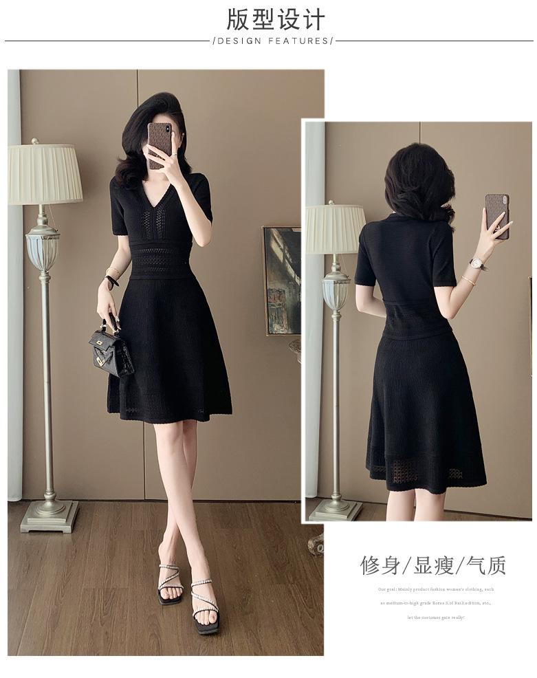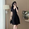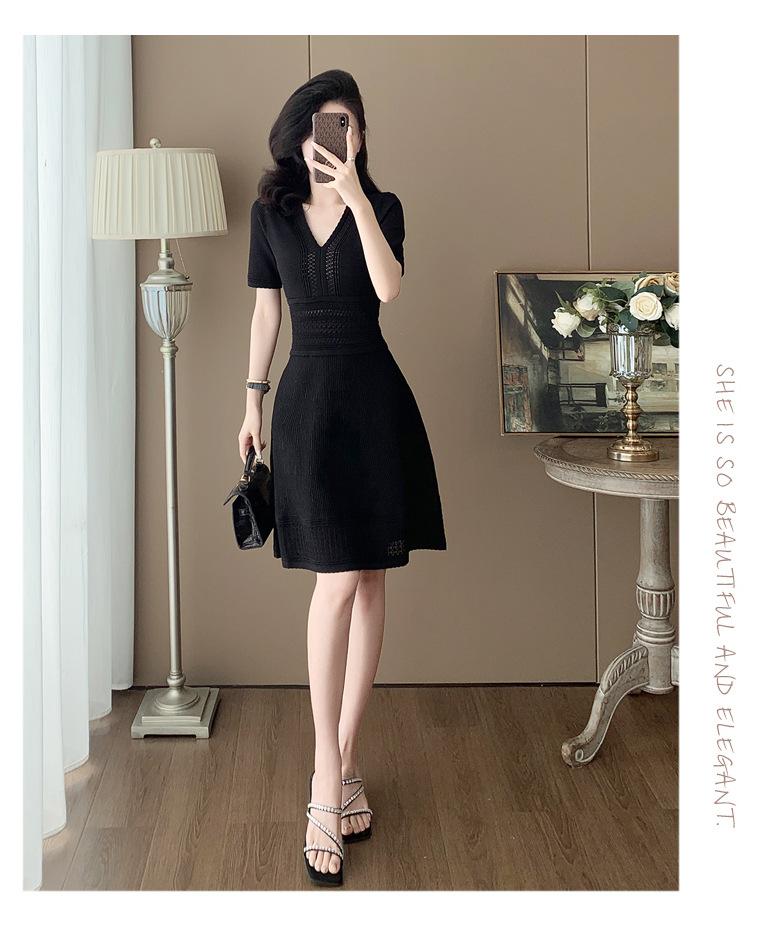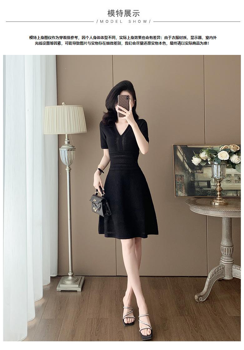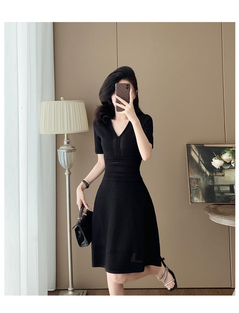 Vestido Calado Negro Estilo Chanel para Dama Estilo Francés Vestido de Punto de Seda Helada de Verano Nuevo de Manga Corta y Cintura Alta para Mujer