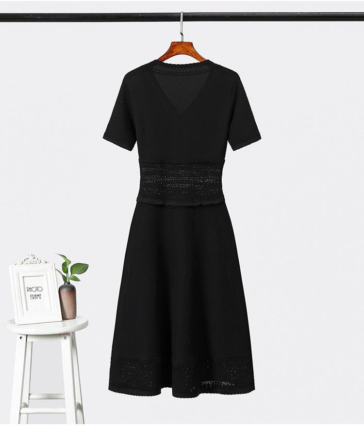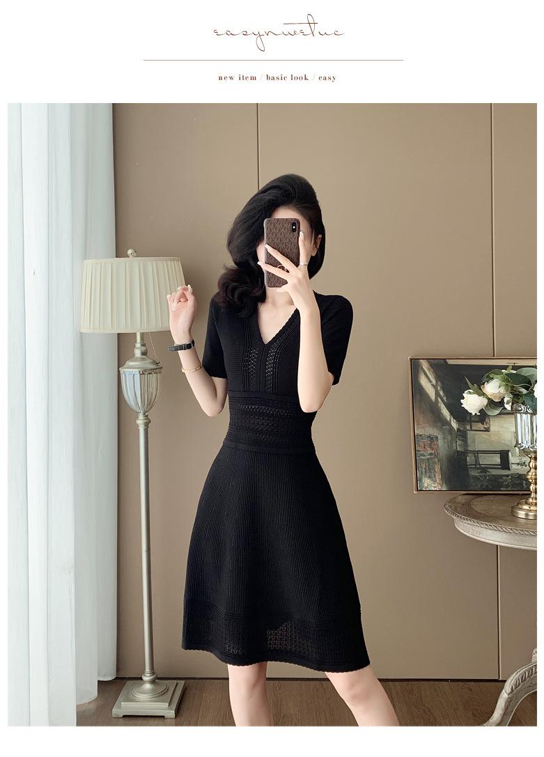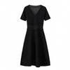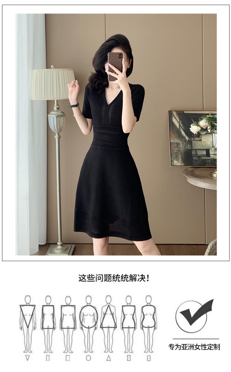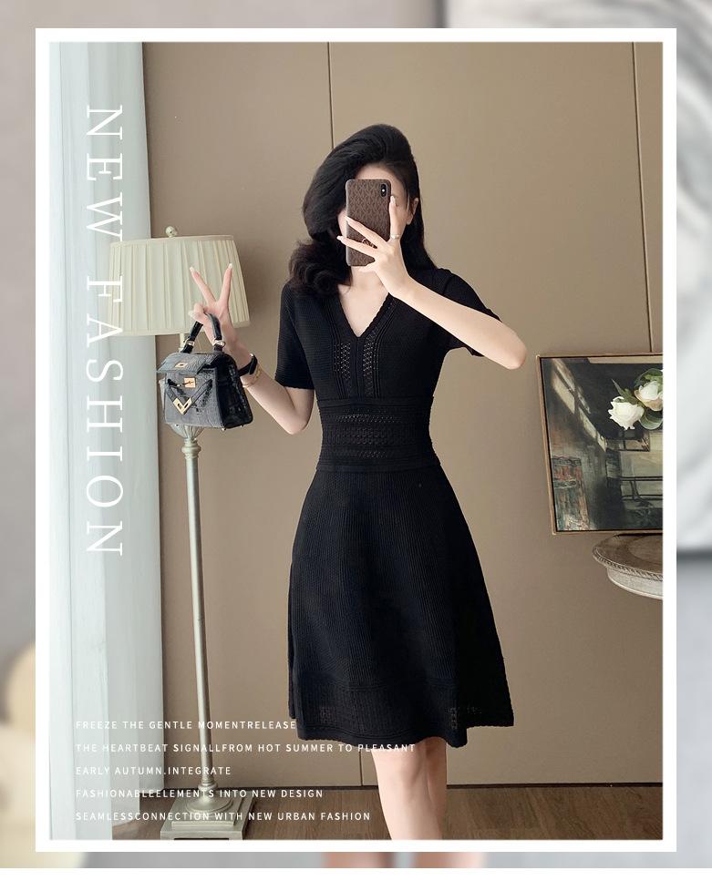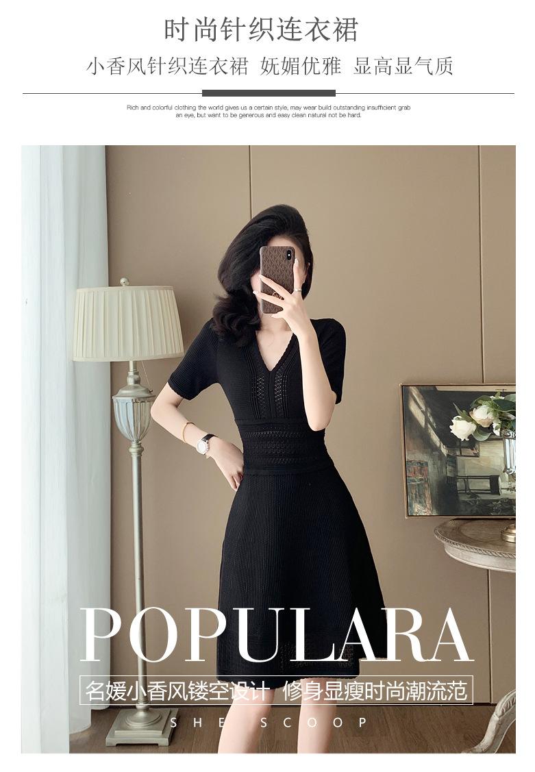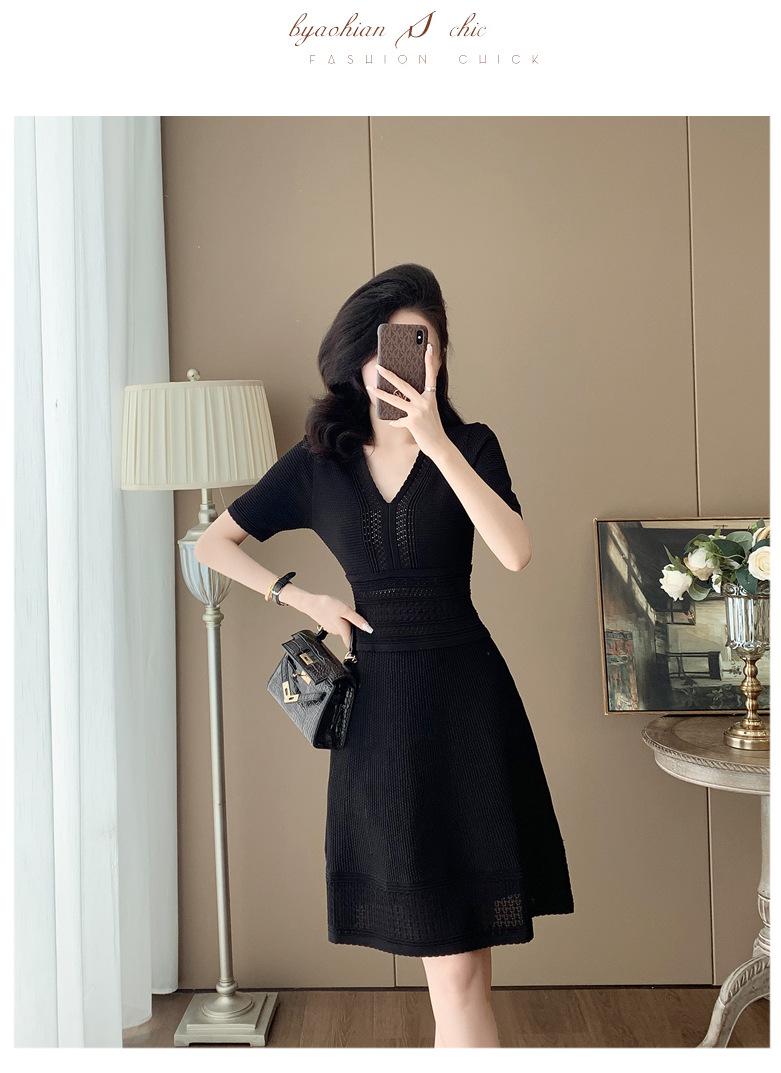 Vestido Calado Negro Estilo Chanel para Dama Estilo Francés Vestido de Punto de Seda Helada de Verano Nuevo de Manga Corta y Cintura Alta para Mujer