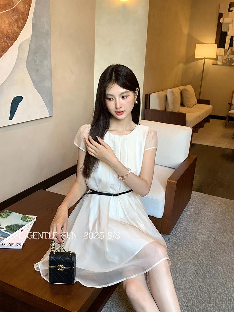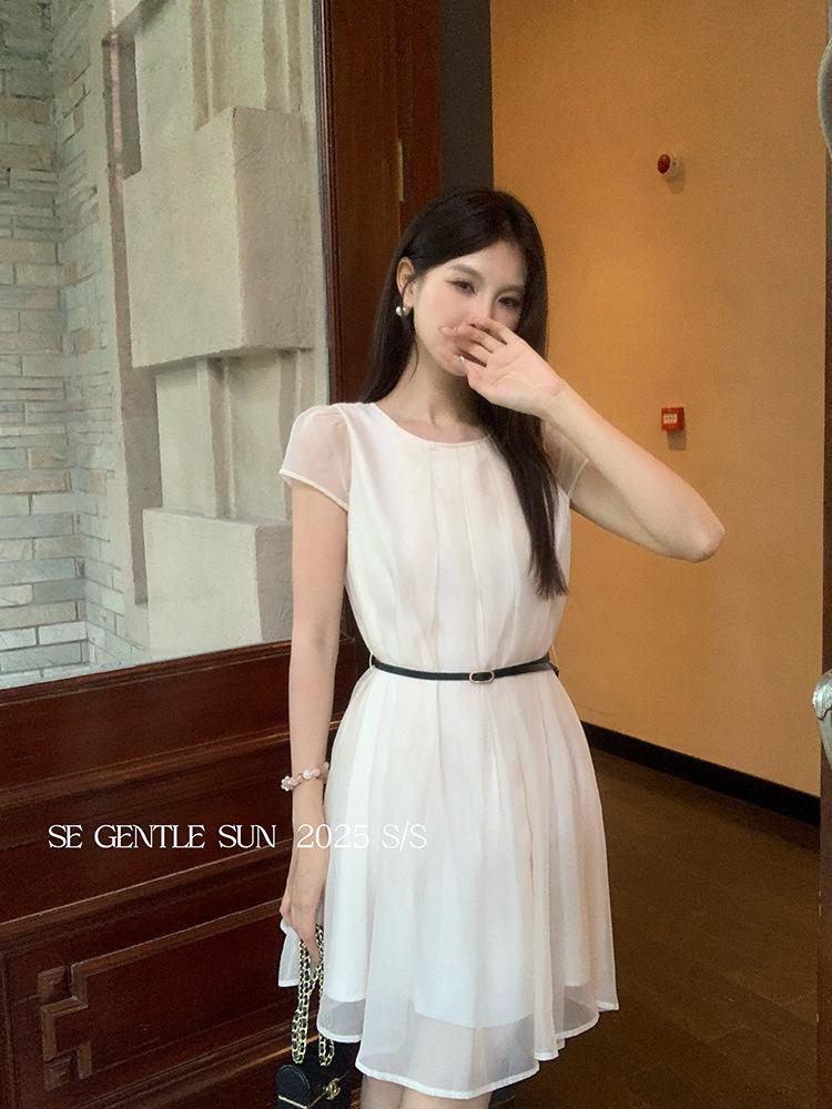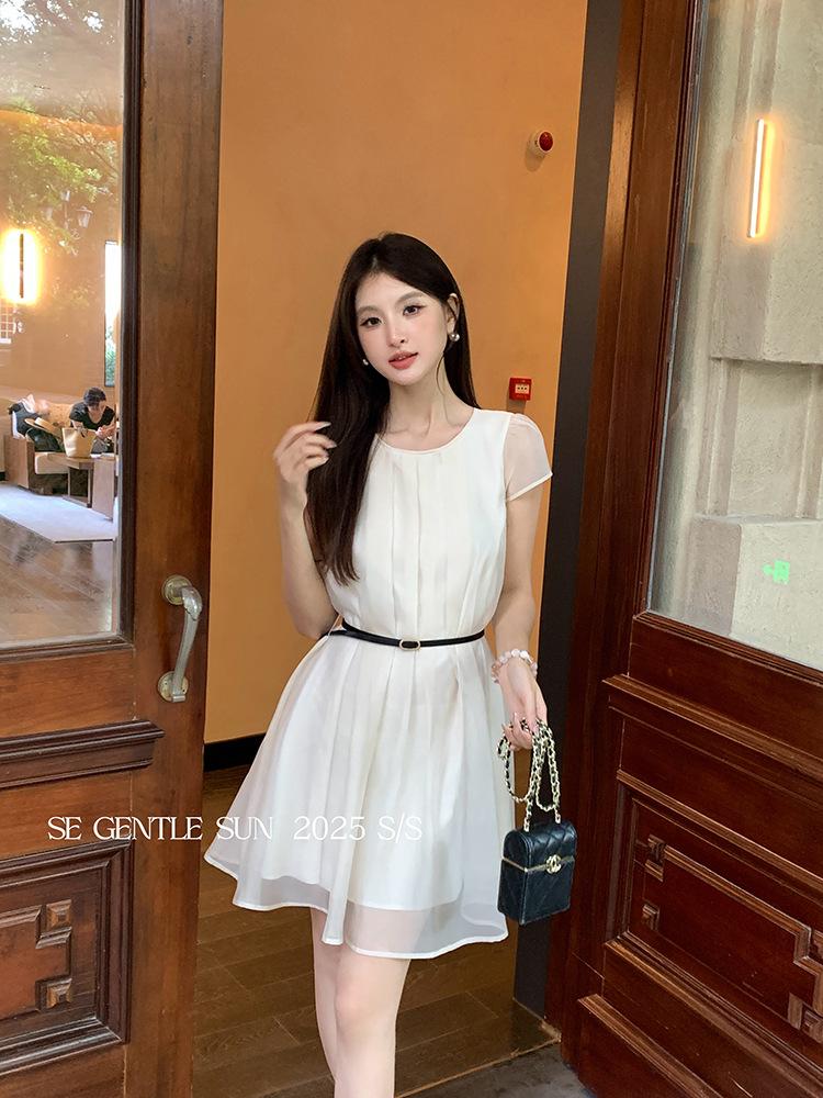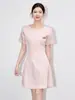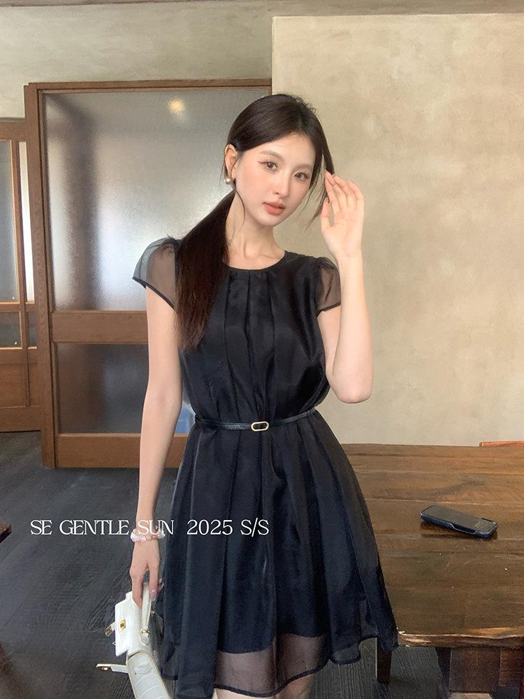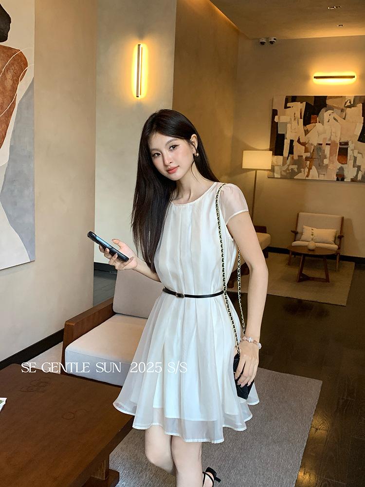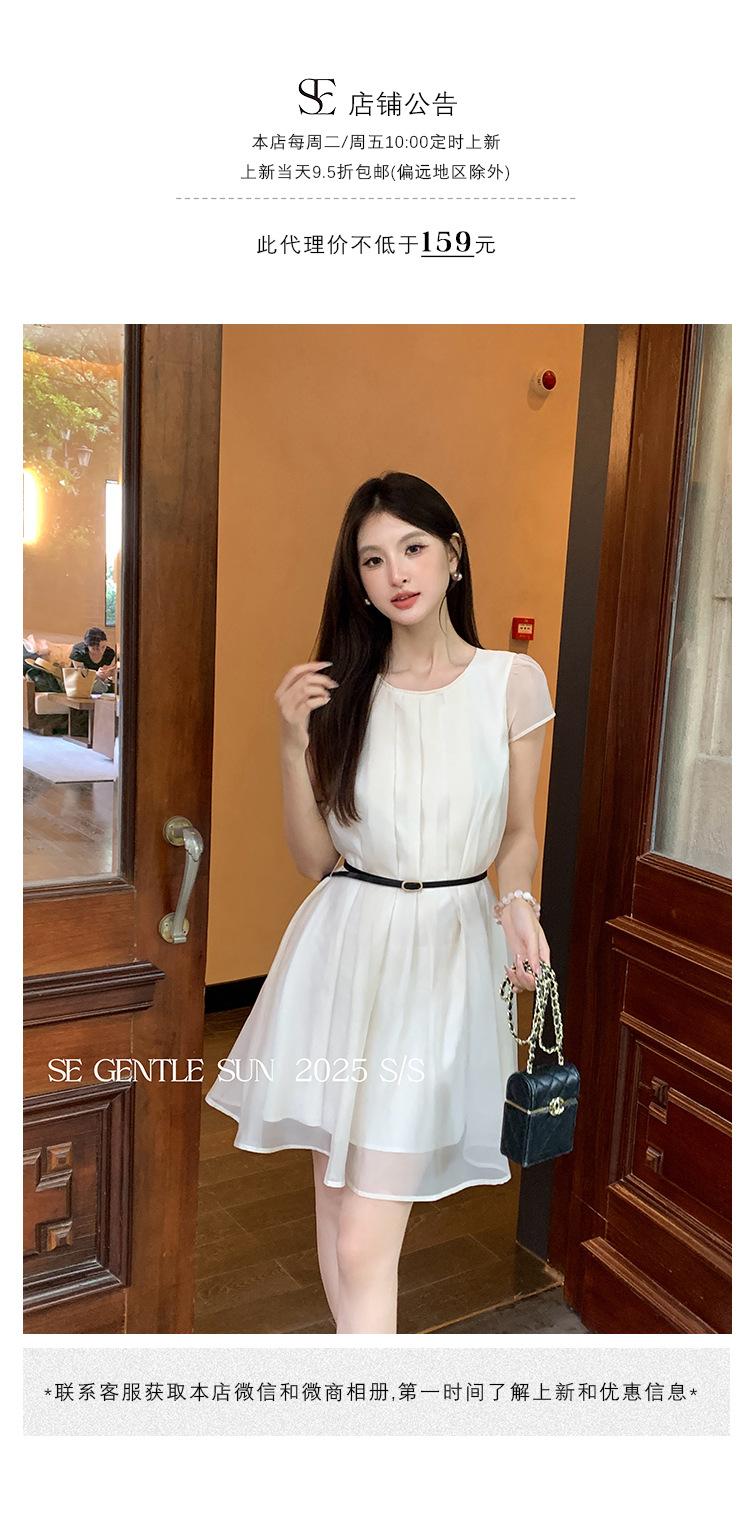 Xiuxixi 2025 Nuevo Estilo de Verano Vestido Elegante de Cuello Redondo y Manga Corta Aspecto Adelgazante Falda Corta de Alta Gama para Mujer 88399