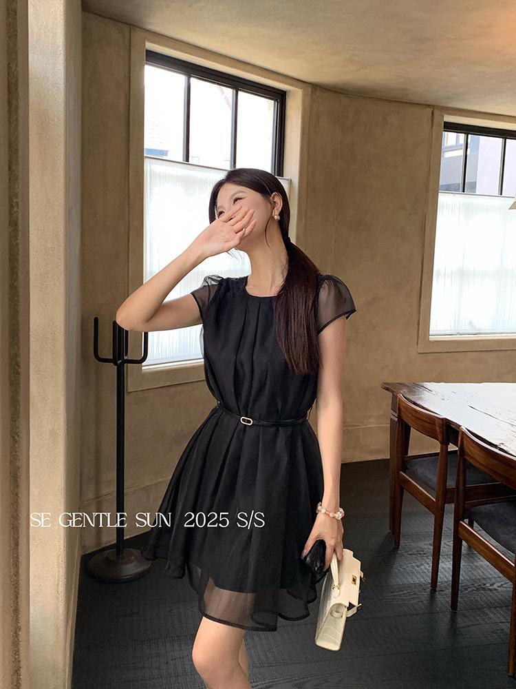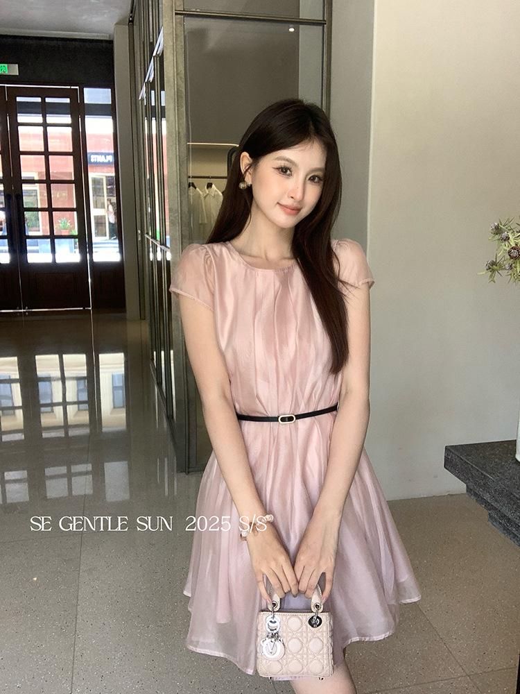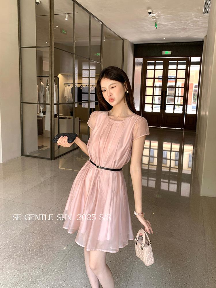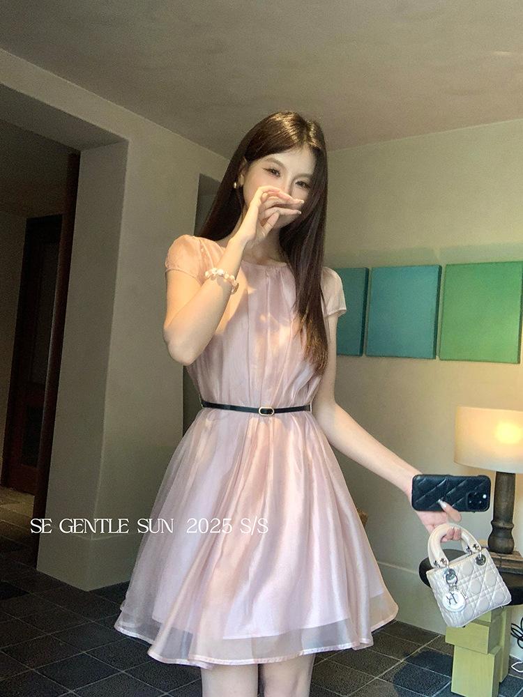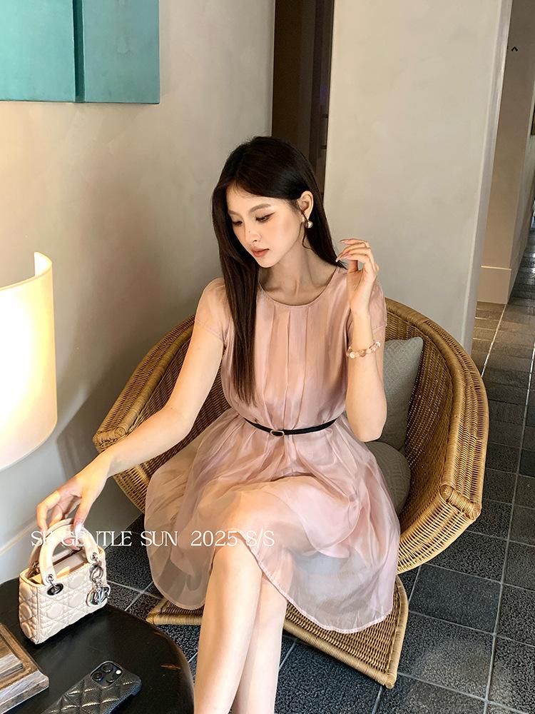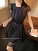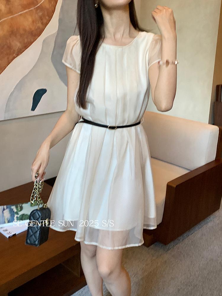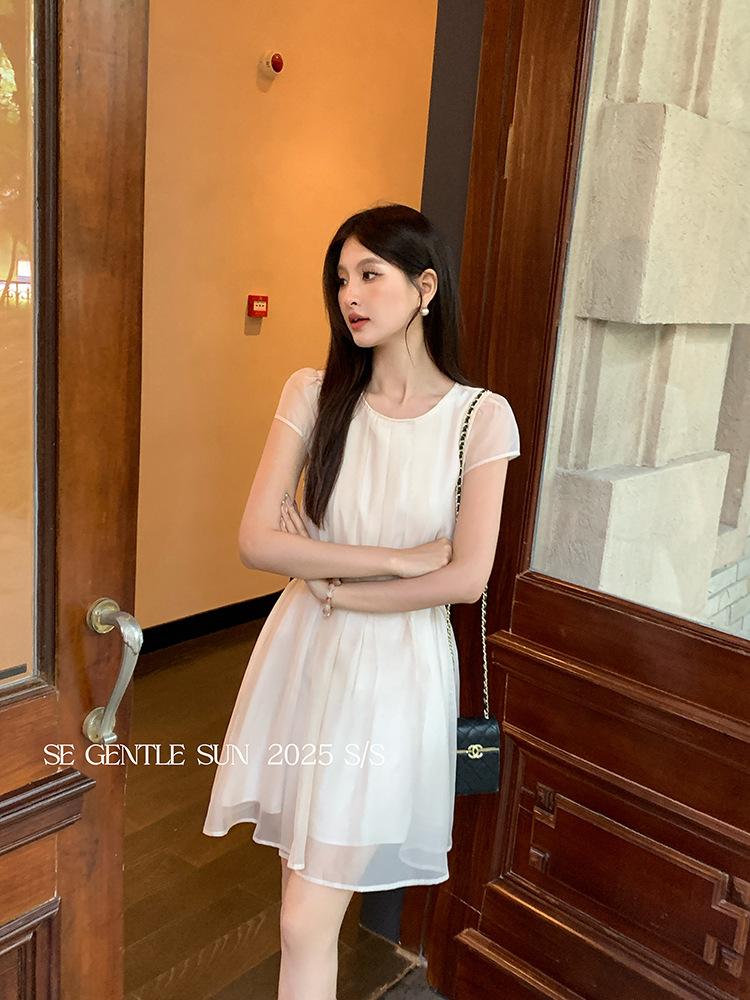 Xiuxixi 2025 Nuevo Estilo de Verano Vestido Elegante de Cuello Redondo y Manga Corta Aspecto Adelgazante Falda Corta de Alta Gama para Mujer 88399