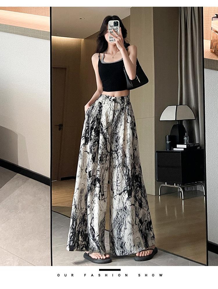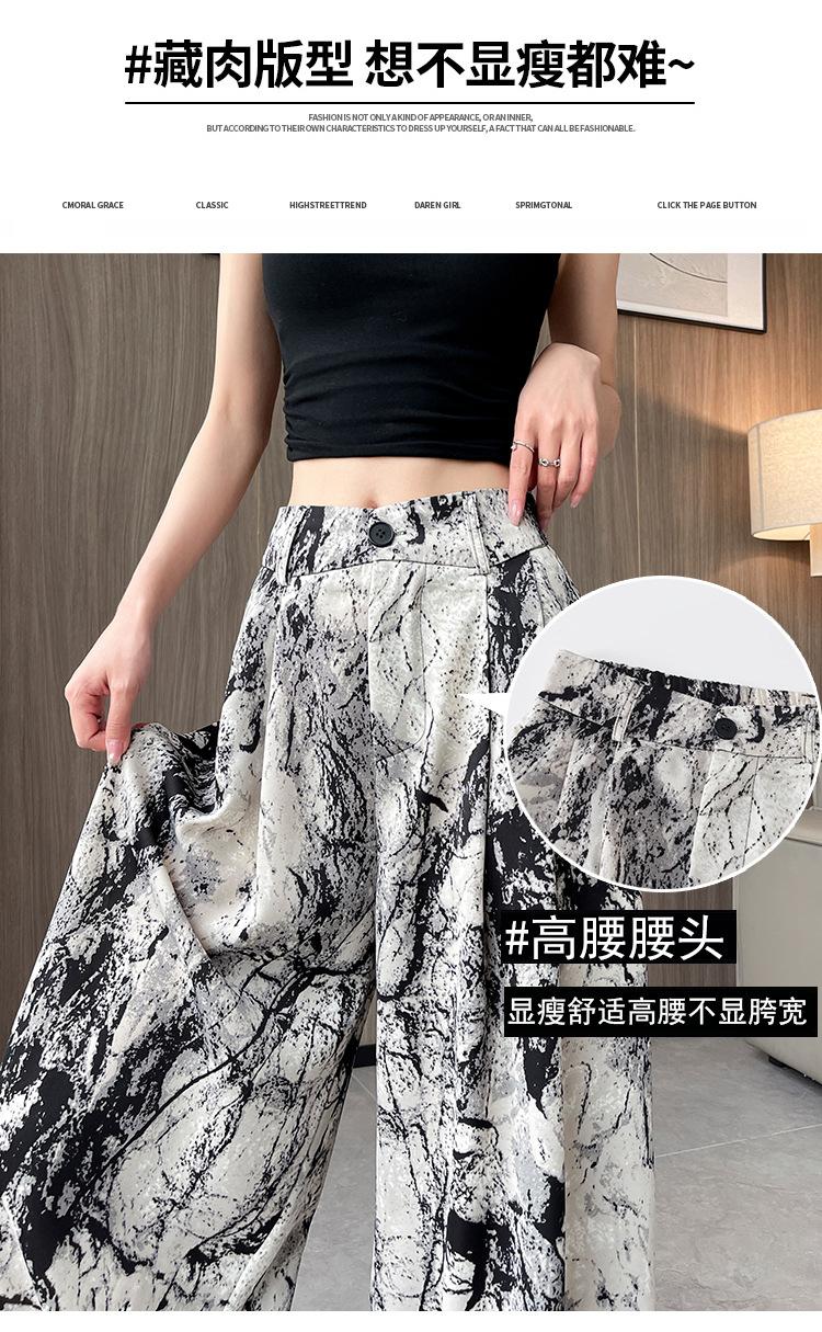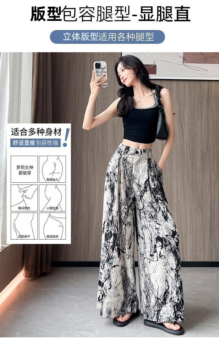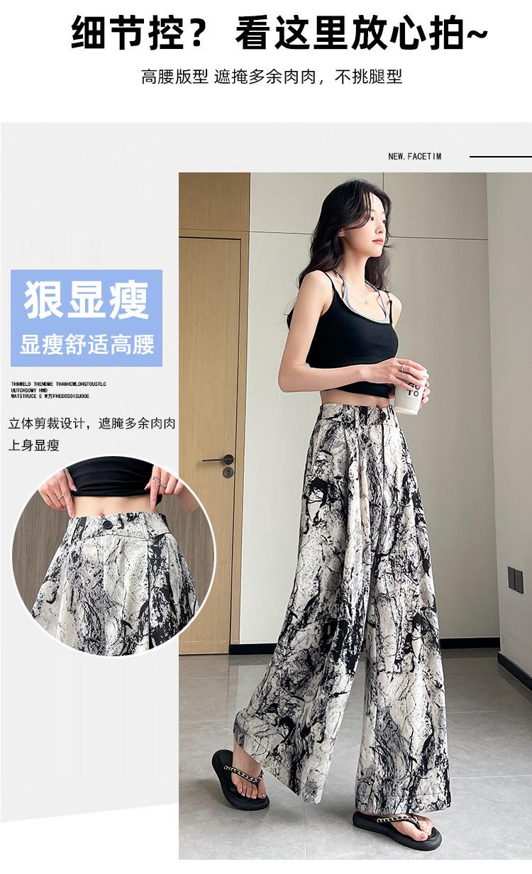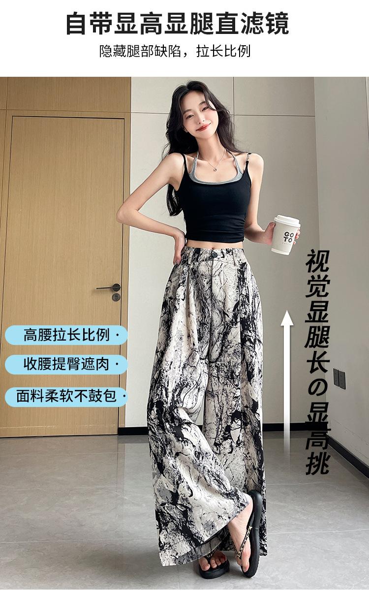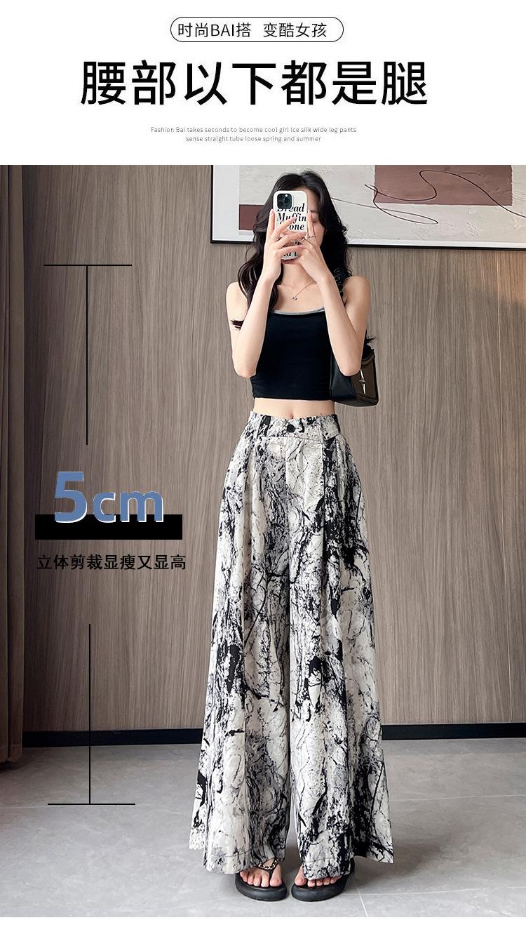 Verano 2025 Nuevo Traje Fresco de Seda Helada Tie-Dye Pantalones de Pierna Ancha para Mujer Cintura Alta Suelto Largo hasta el Piso Estilo Delgado para Personas Altas