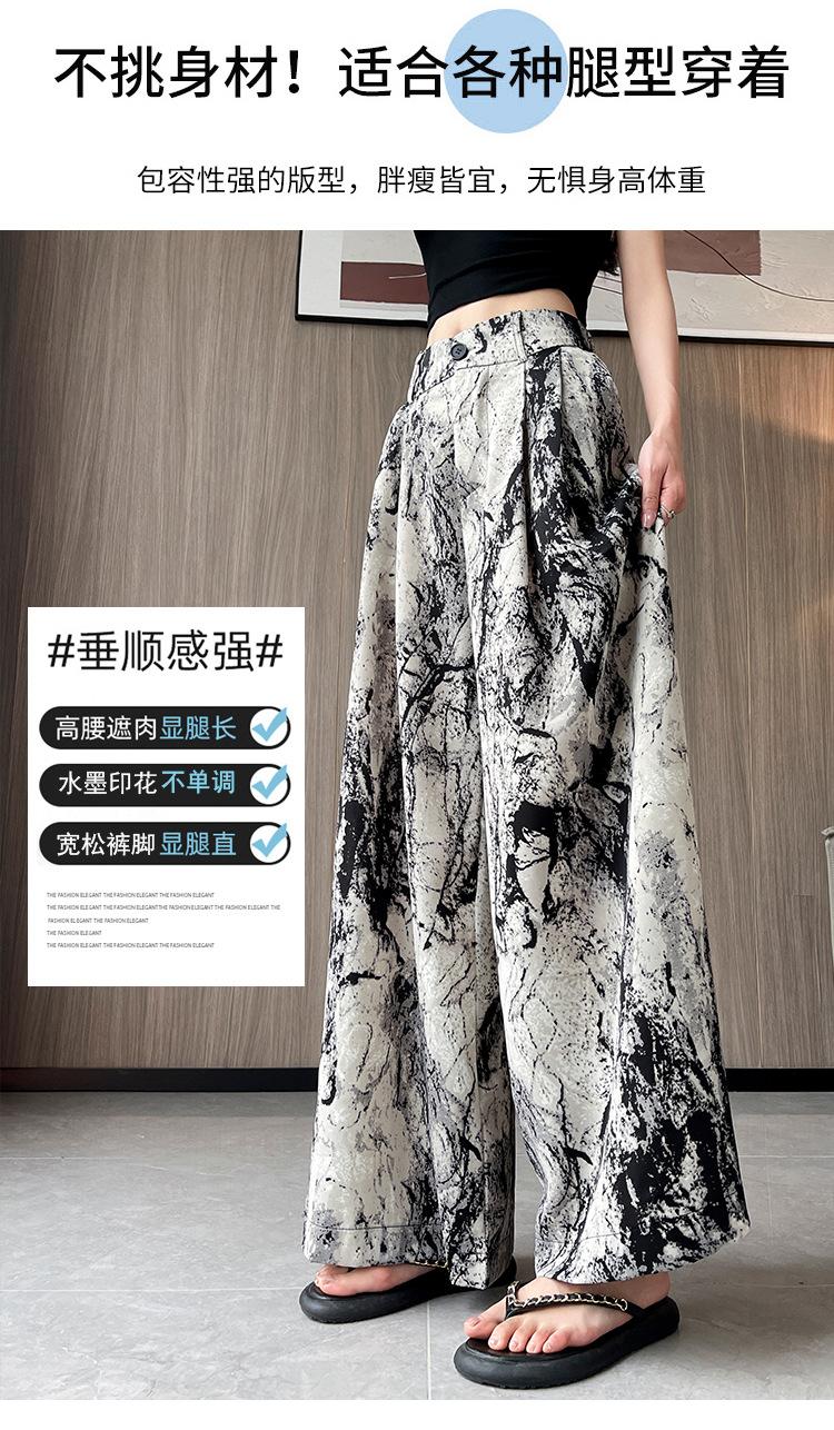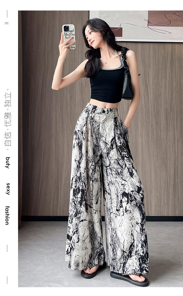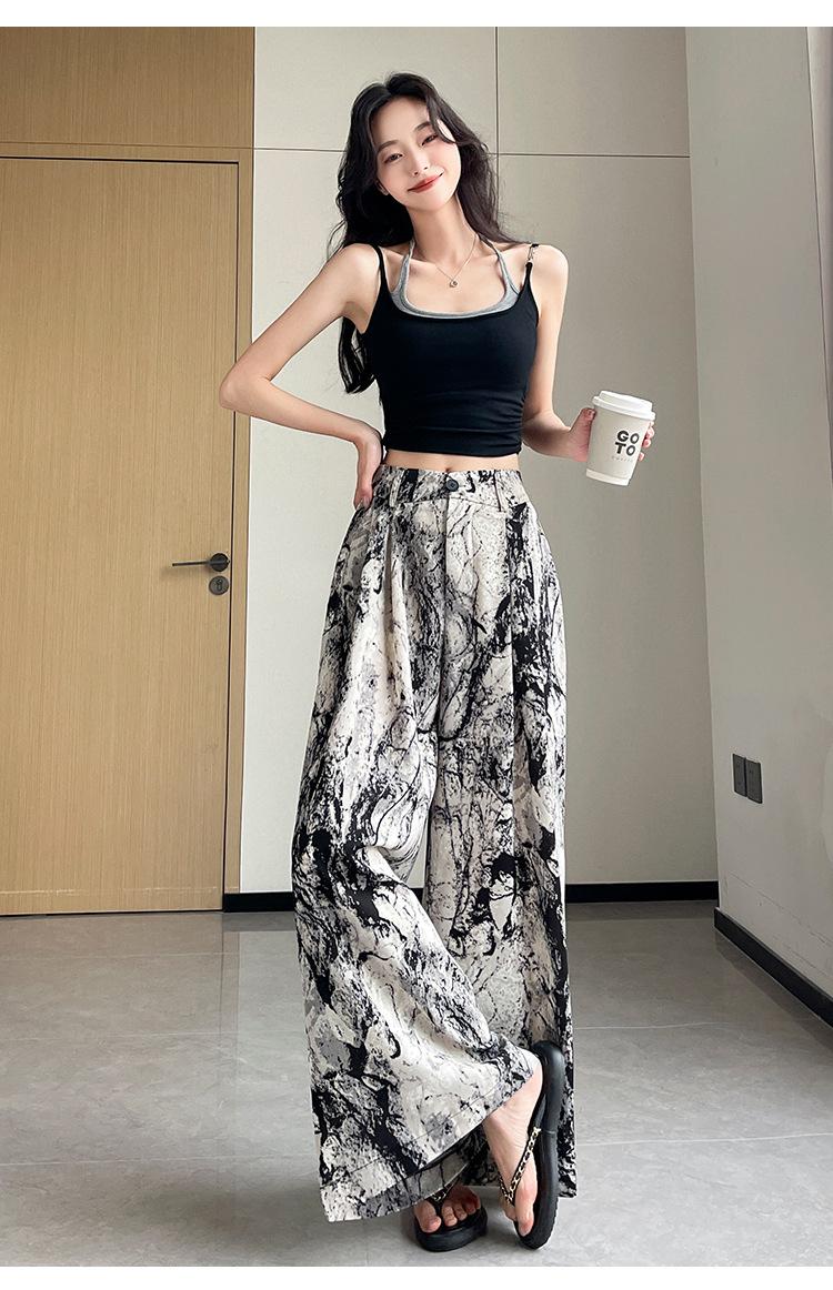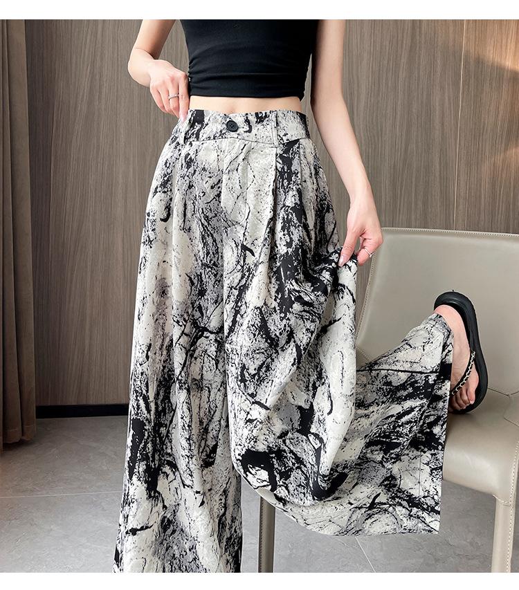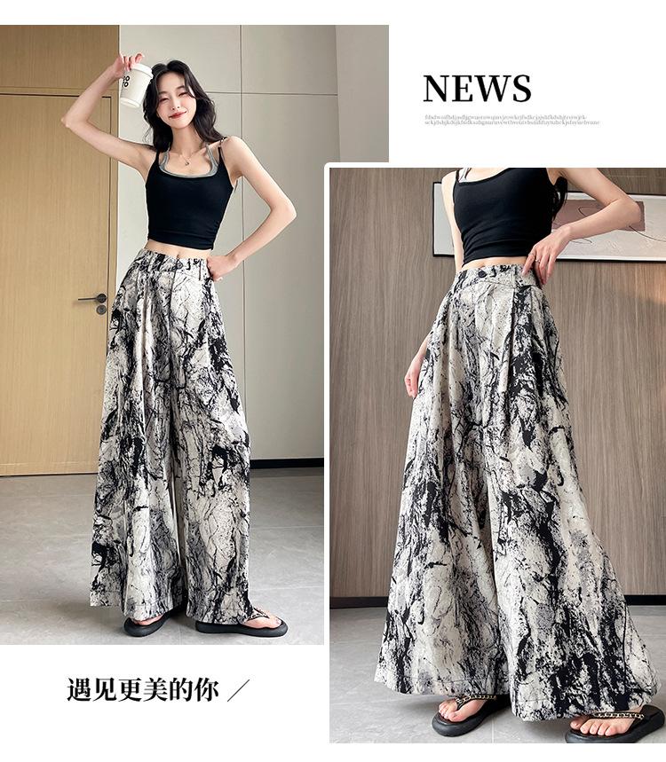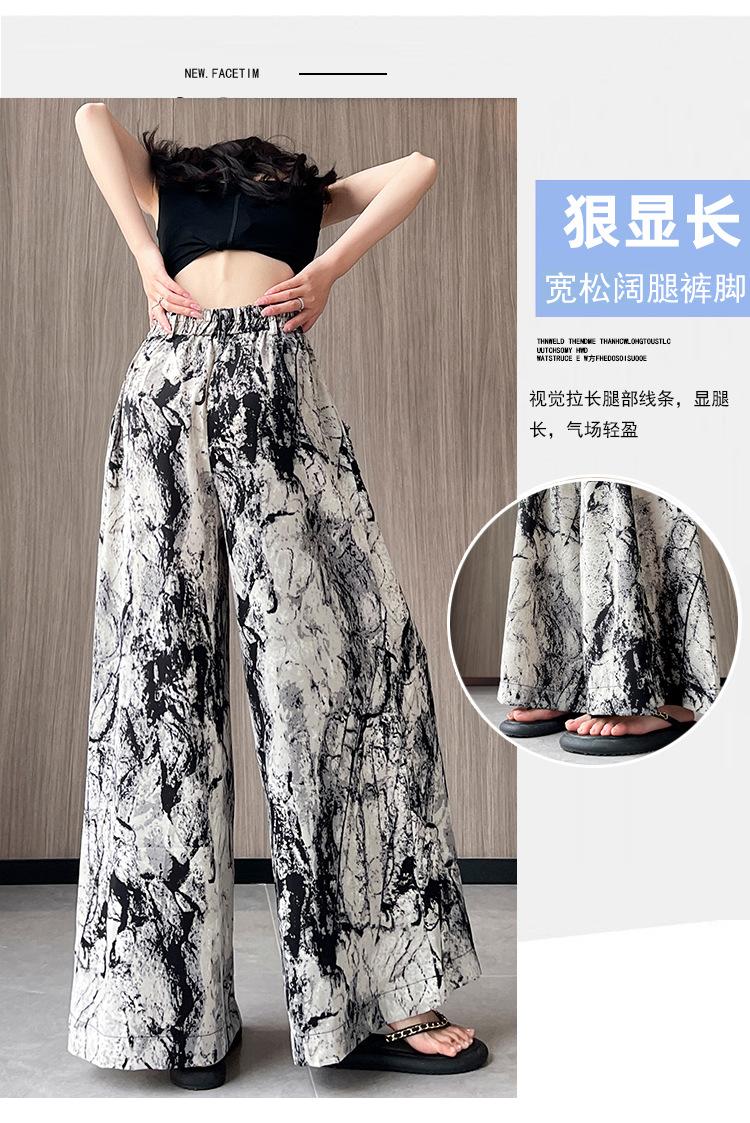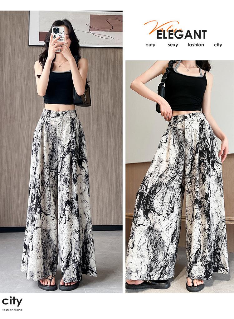 Verano 2025 Nuevo Traje Fresco de Seda Helada Tie-Dye Pantalones de Pierna Ancha para Mujer Cintura Alta Suelto Largo hasta el Piso Estilo Delgado para Personas Altas