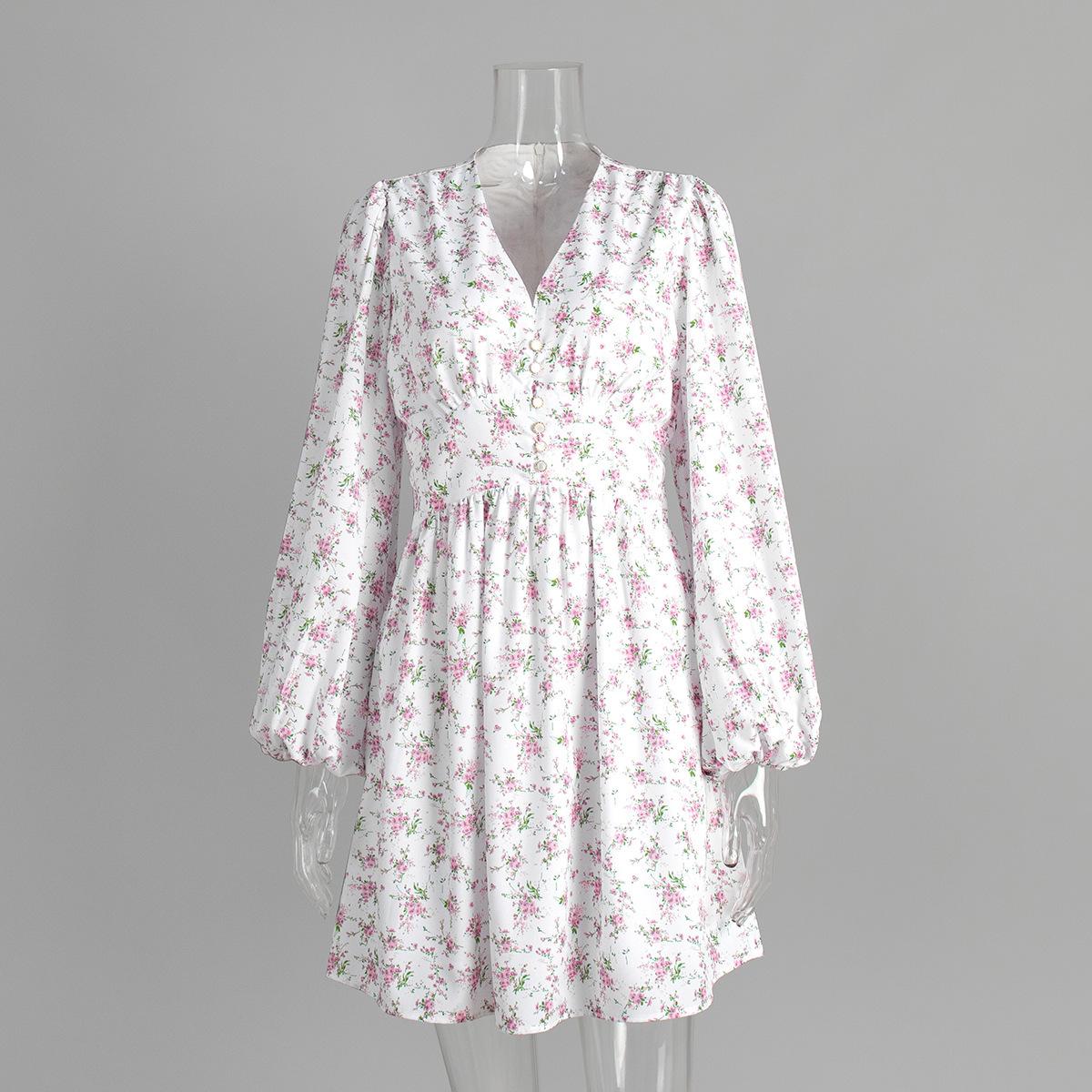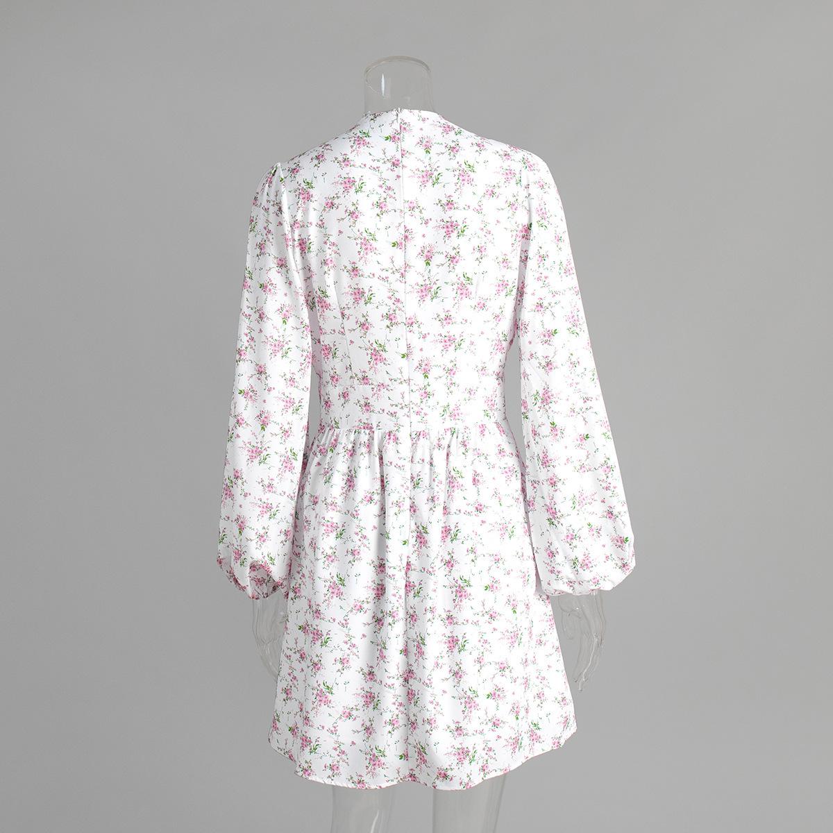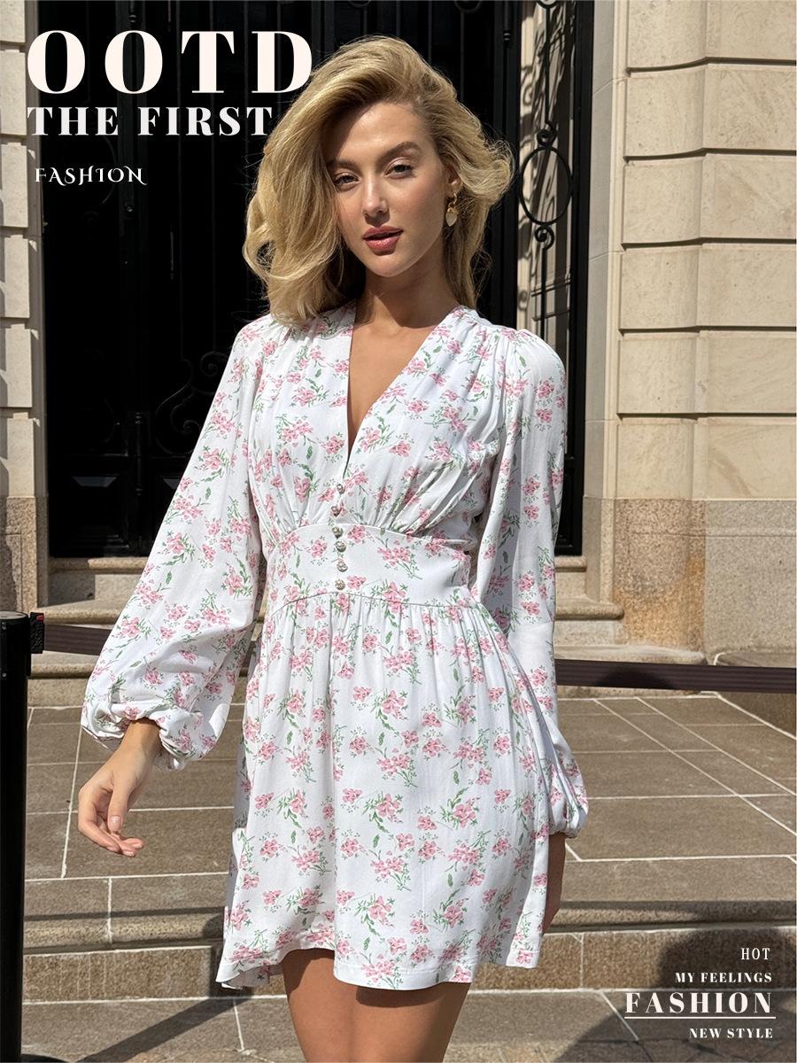 Vestido corto de manga larga estampado transfronterizo Estilo nuevo europeo y americano Primavera y verano 2025 Manga farol Falda corta Vestido de cintura para mujer